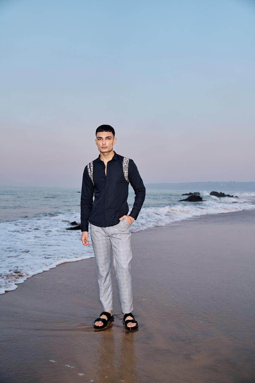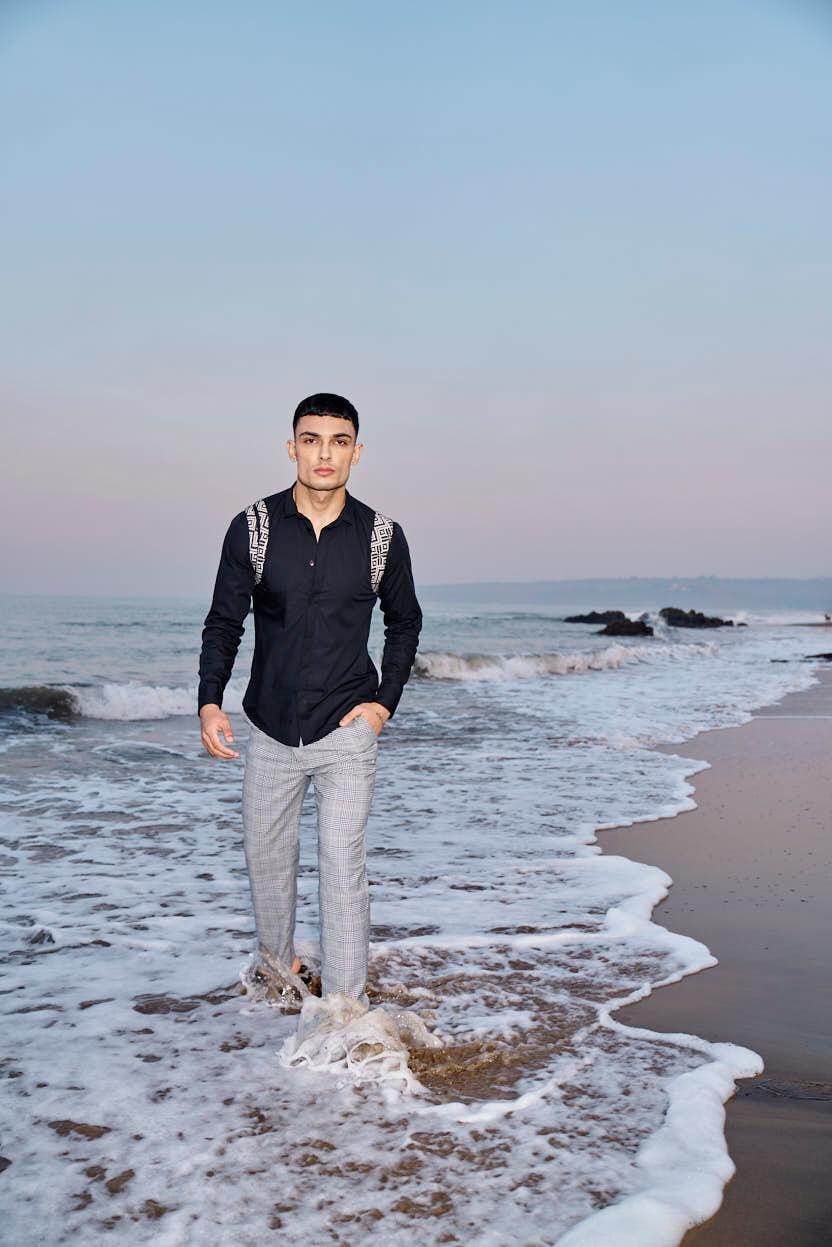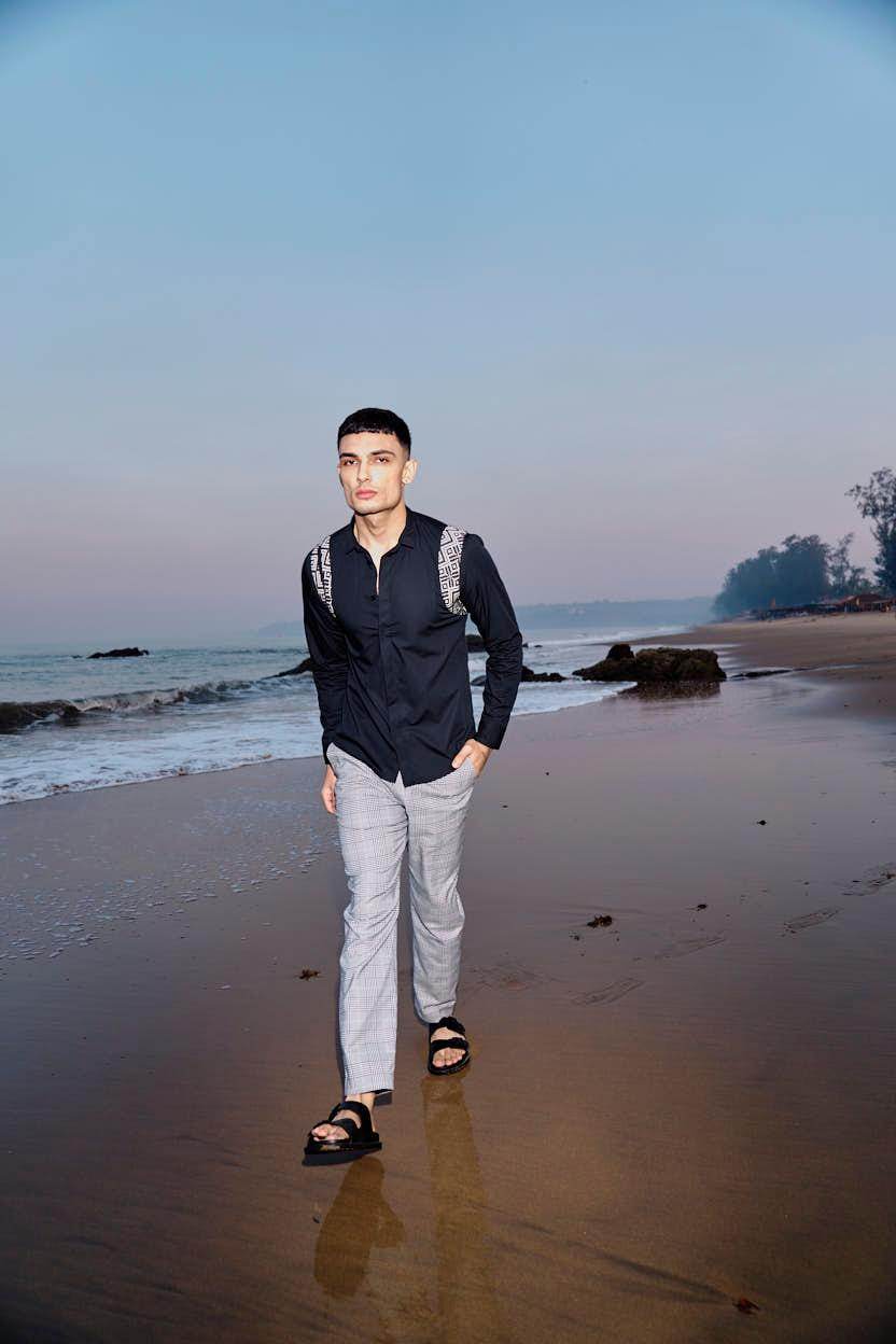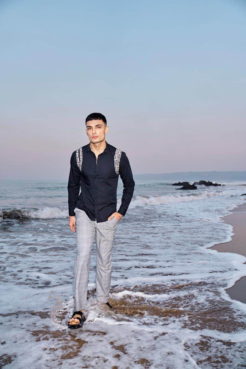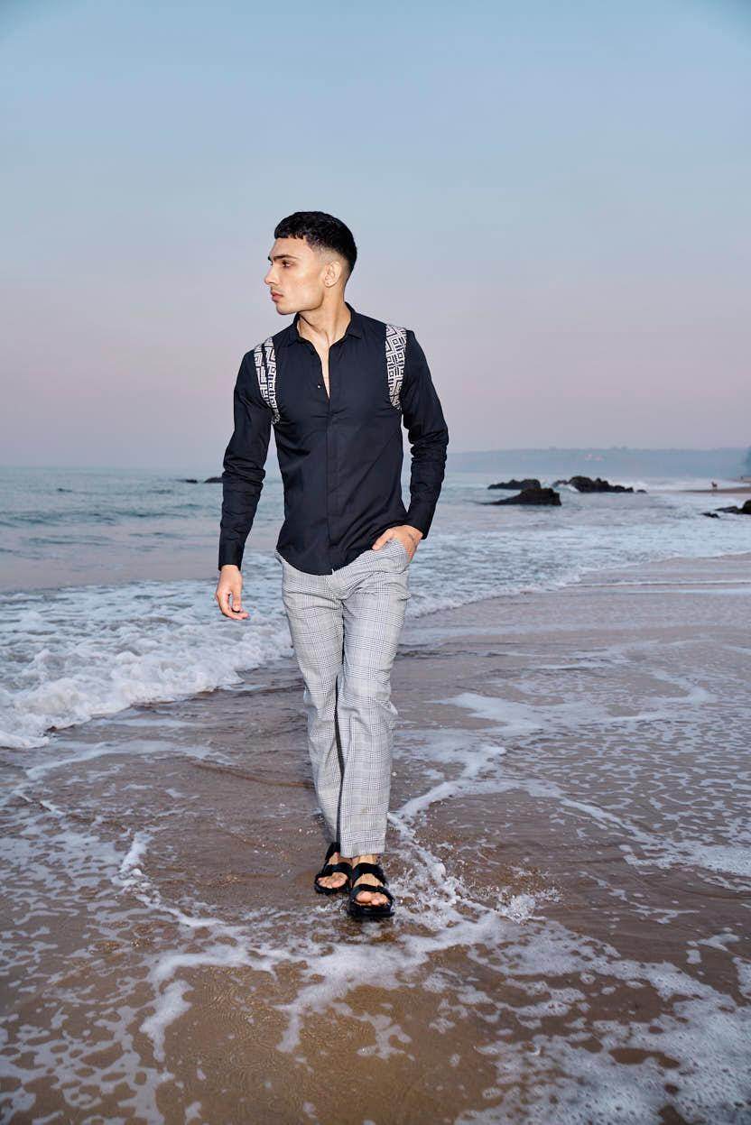 Black cotton poplin full sleeve shirt with contrast patterned jacquard harness detail on the shoulders and upper back. Concealed button down placket in the front.