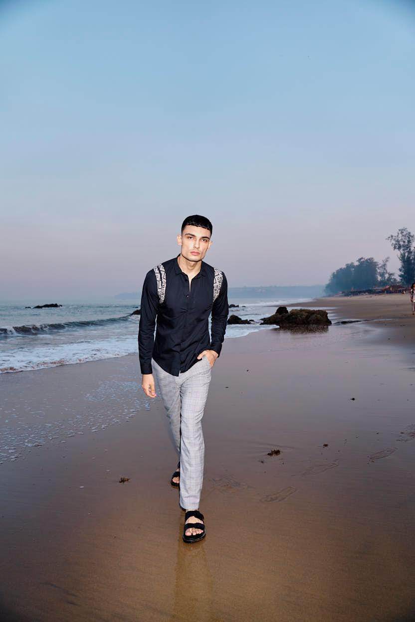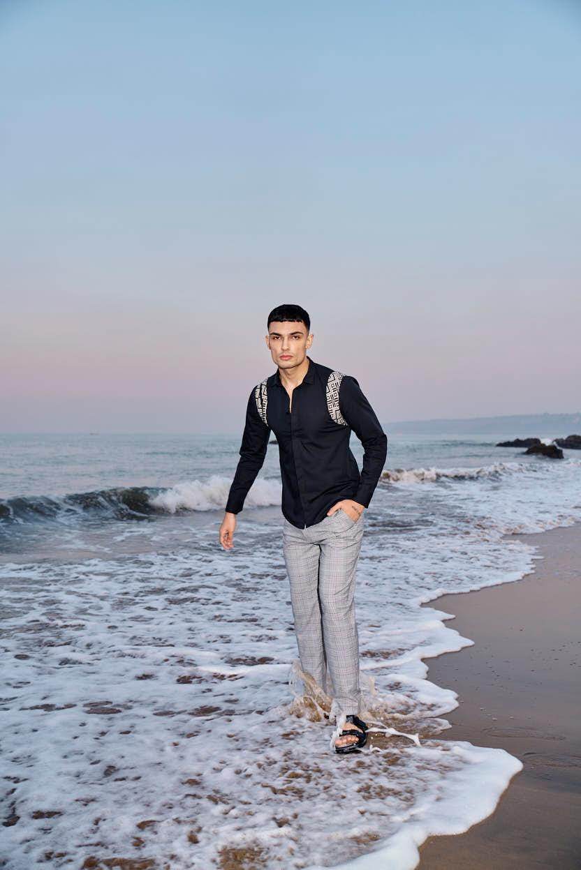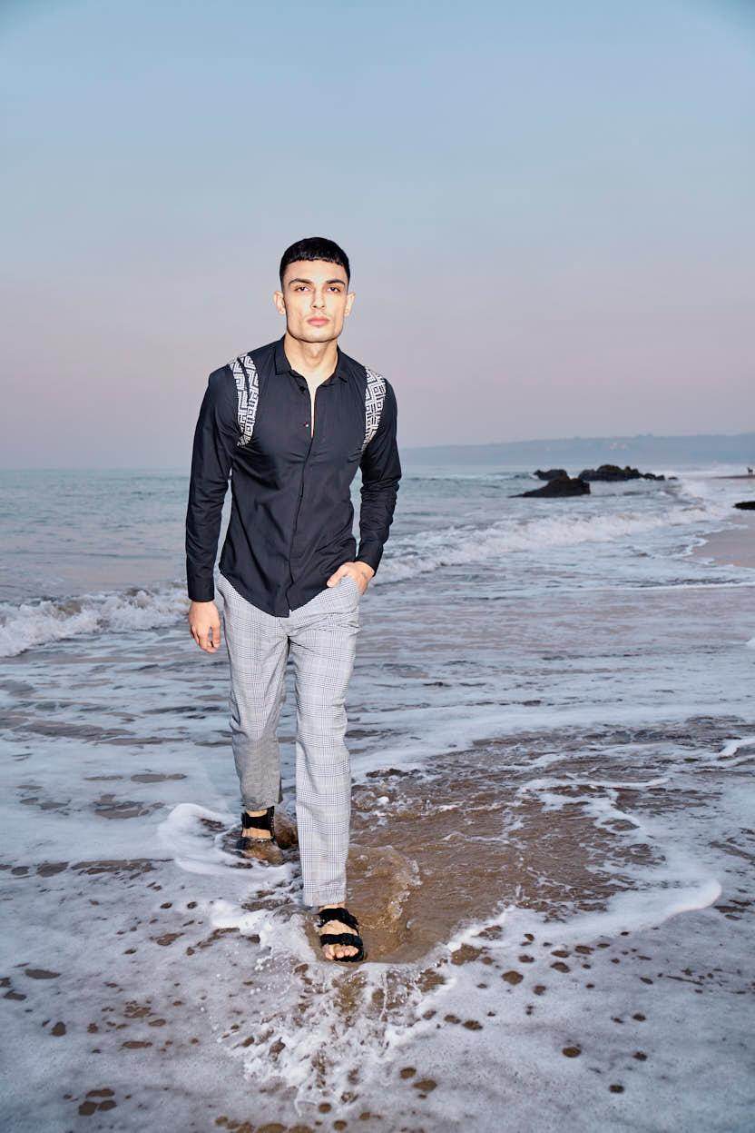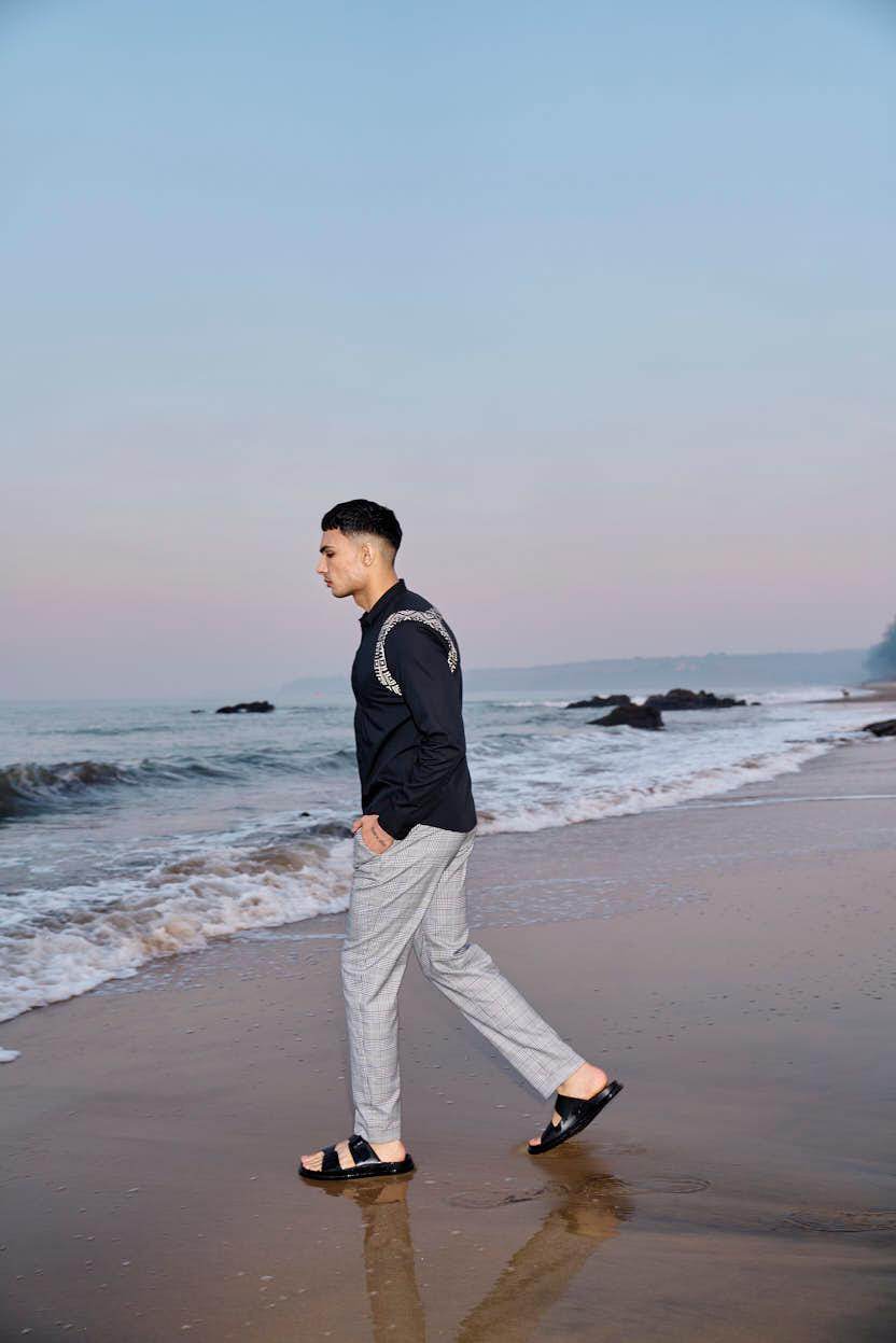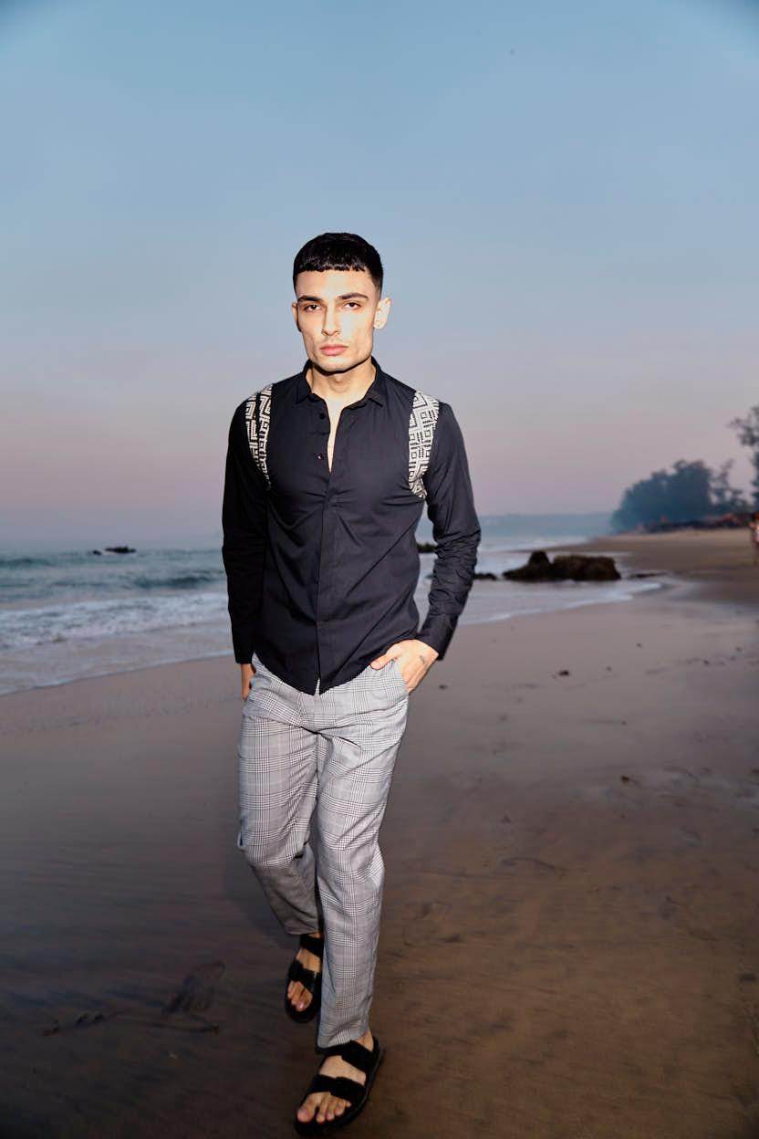 Black cotton poplin full sleeve shirt with contrast patterned jacquard harness detail on the shoulders and upper back. Concealed button down placket in the front.