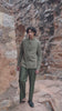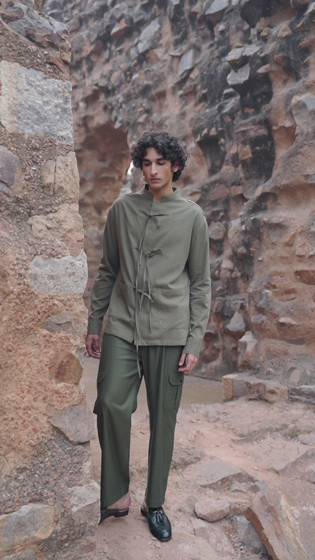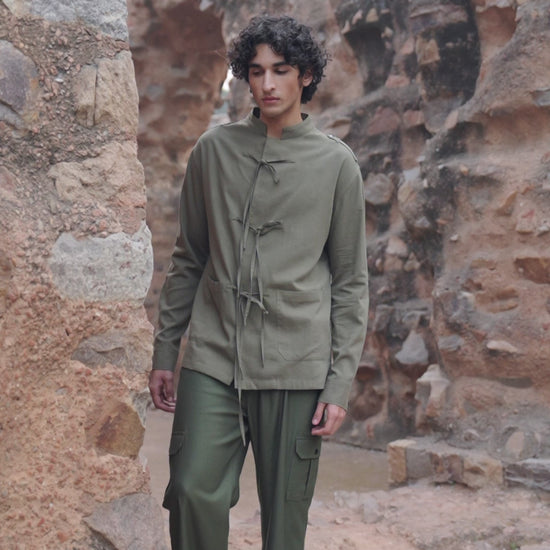 Olive green soft twill shirt with a band collar. Patch pockets in the front and epaulettes on the shoulder. Concealed functional snap button placket with a front tie detail. Snap buttons on the shoulders and full sleeve cuffs.