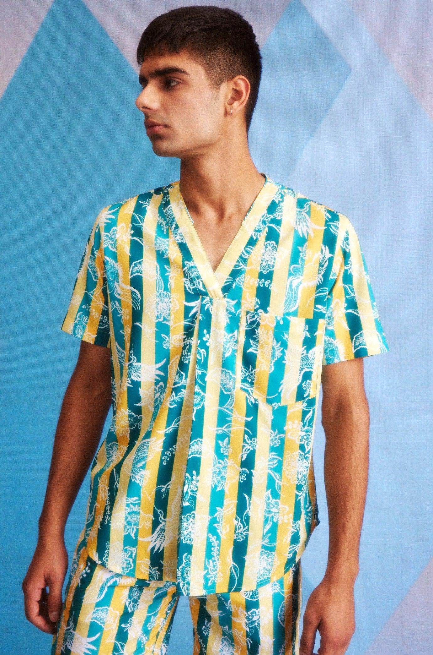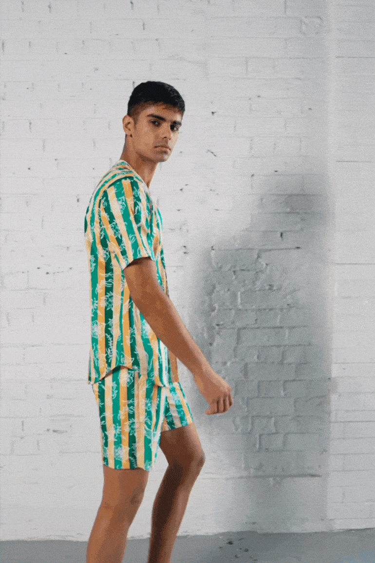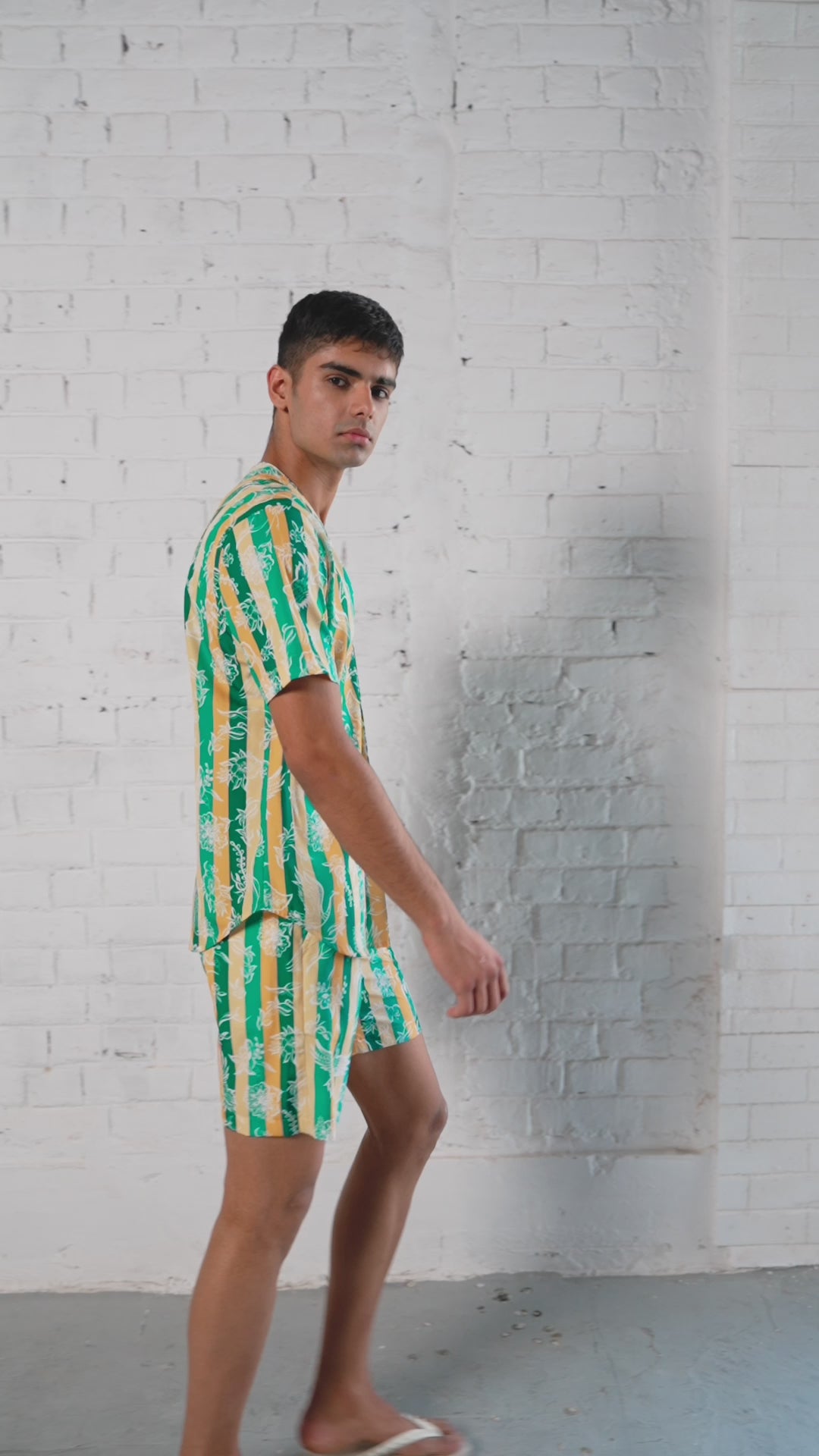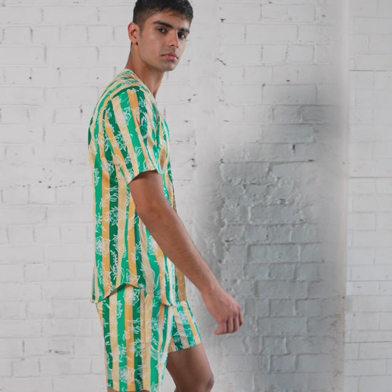V-neck popover half sleeve polo. Alternating printed stripes in summer tones of yellow and green with an overlay of our signature printed pattern in white. Paired with matching swim shorts. Elasticated at the waist. Snap metal button closure at the front, zip fly. Pockets on the sides and back. Relaxed fit.