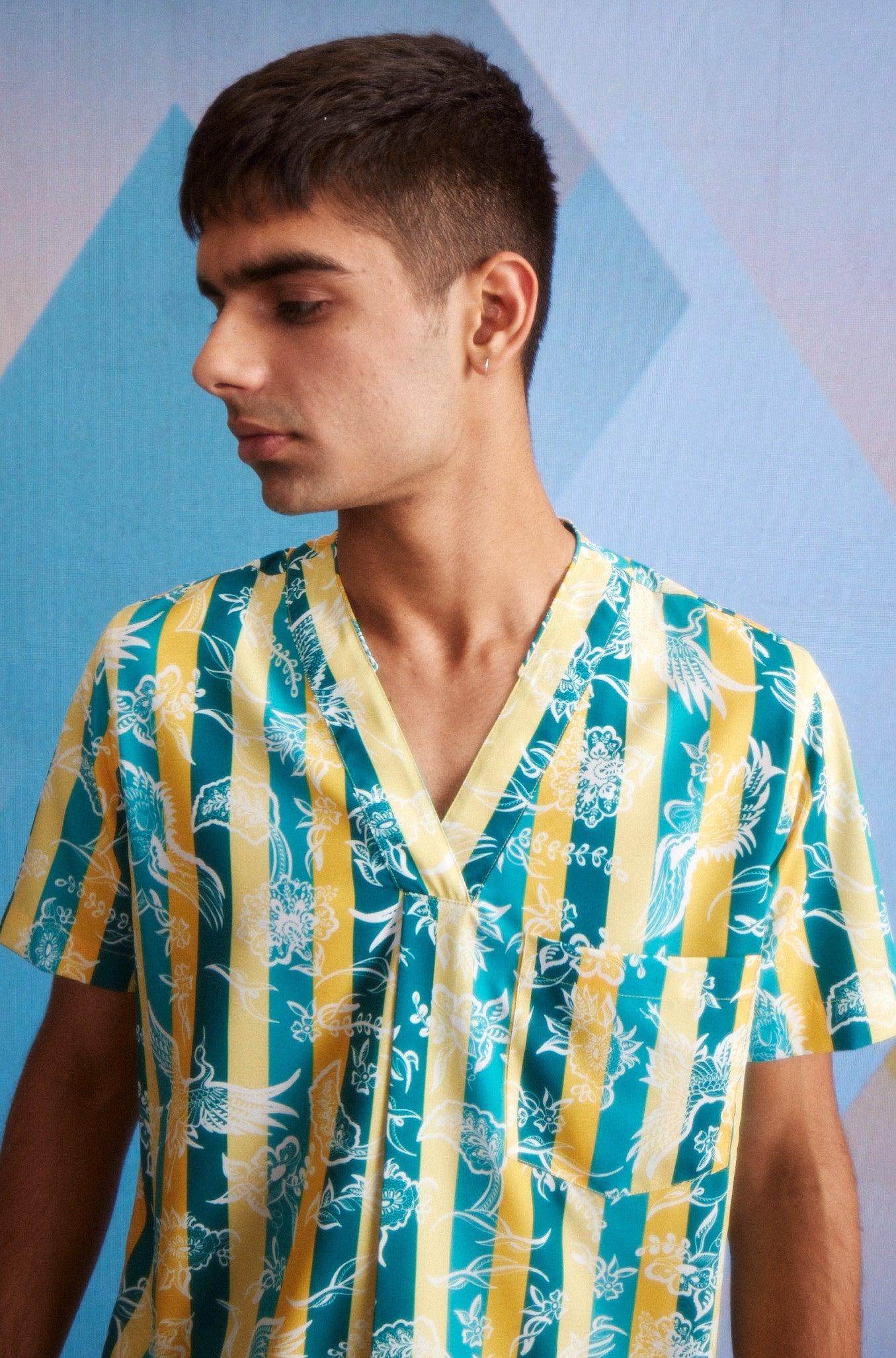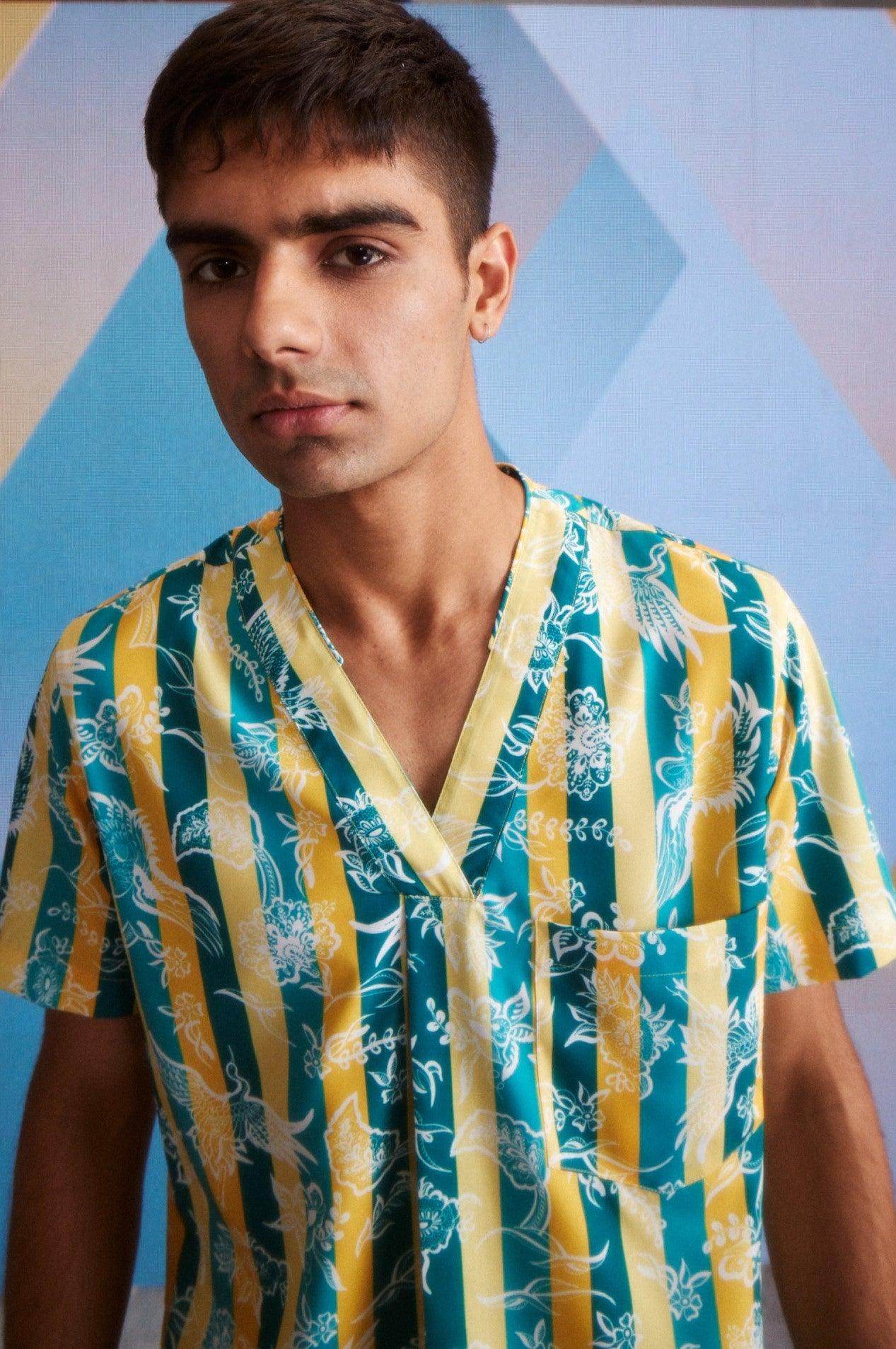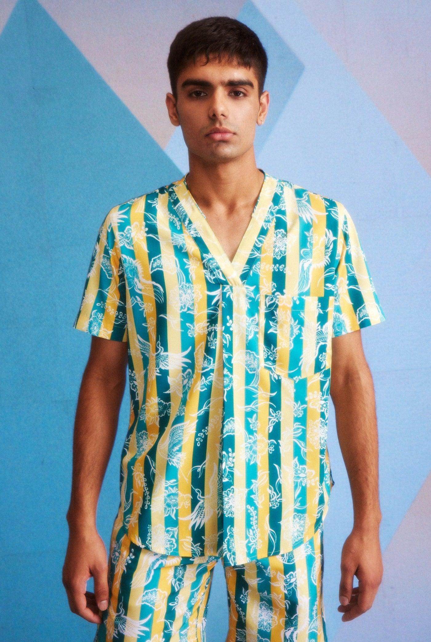 V-neck popover half sleeve polo. Alternating printed stripes in summer tones of yellow and green with an overlay of our signature printed pattern in white. Paired with matching swim shorts. Elasticated at the waist. Snap metal button closure at the front, zip fly. Pockets on the sides and back. Relaxed fit.