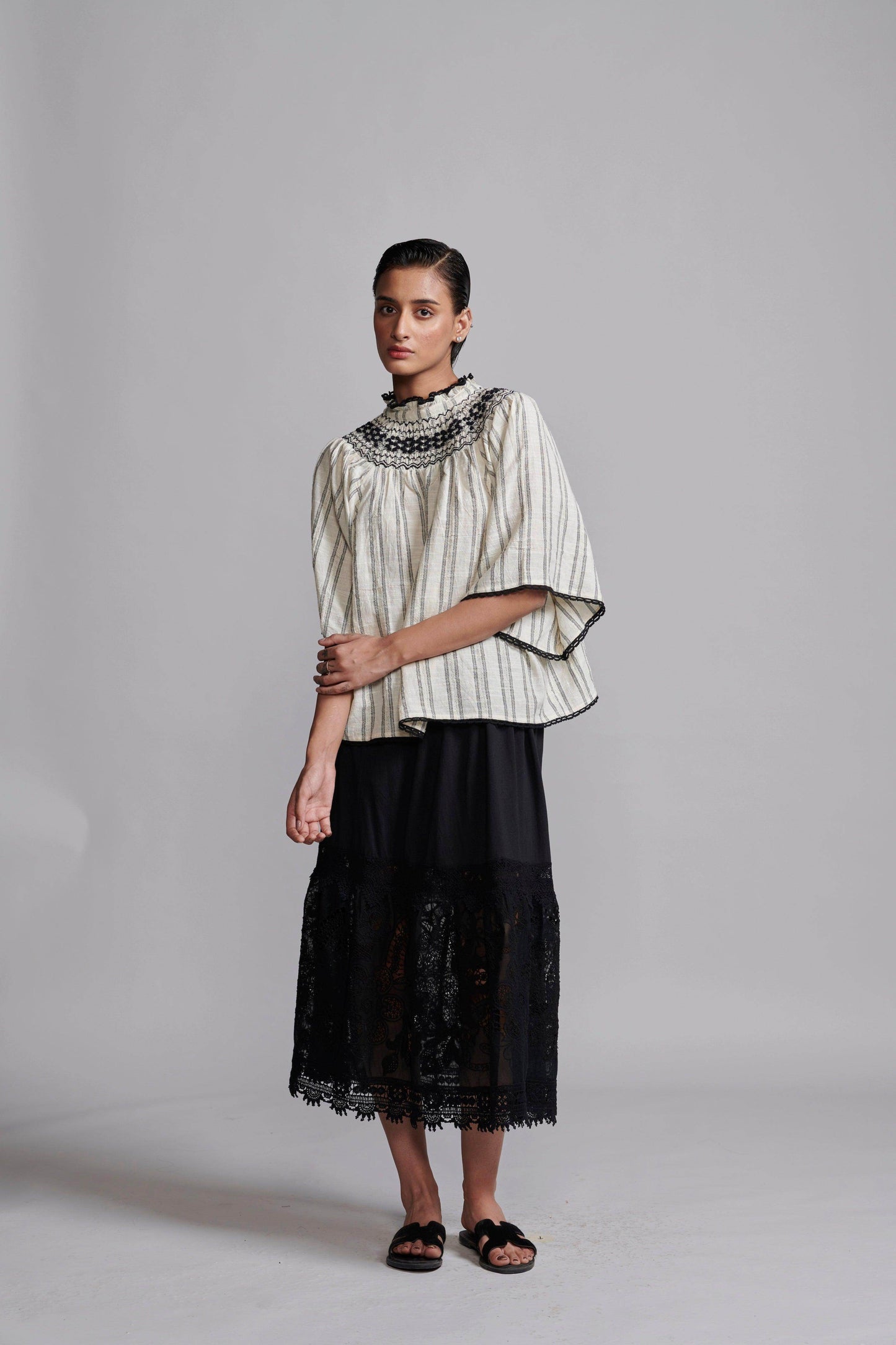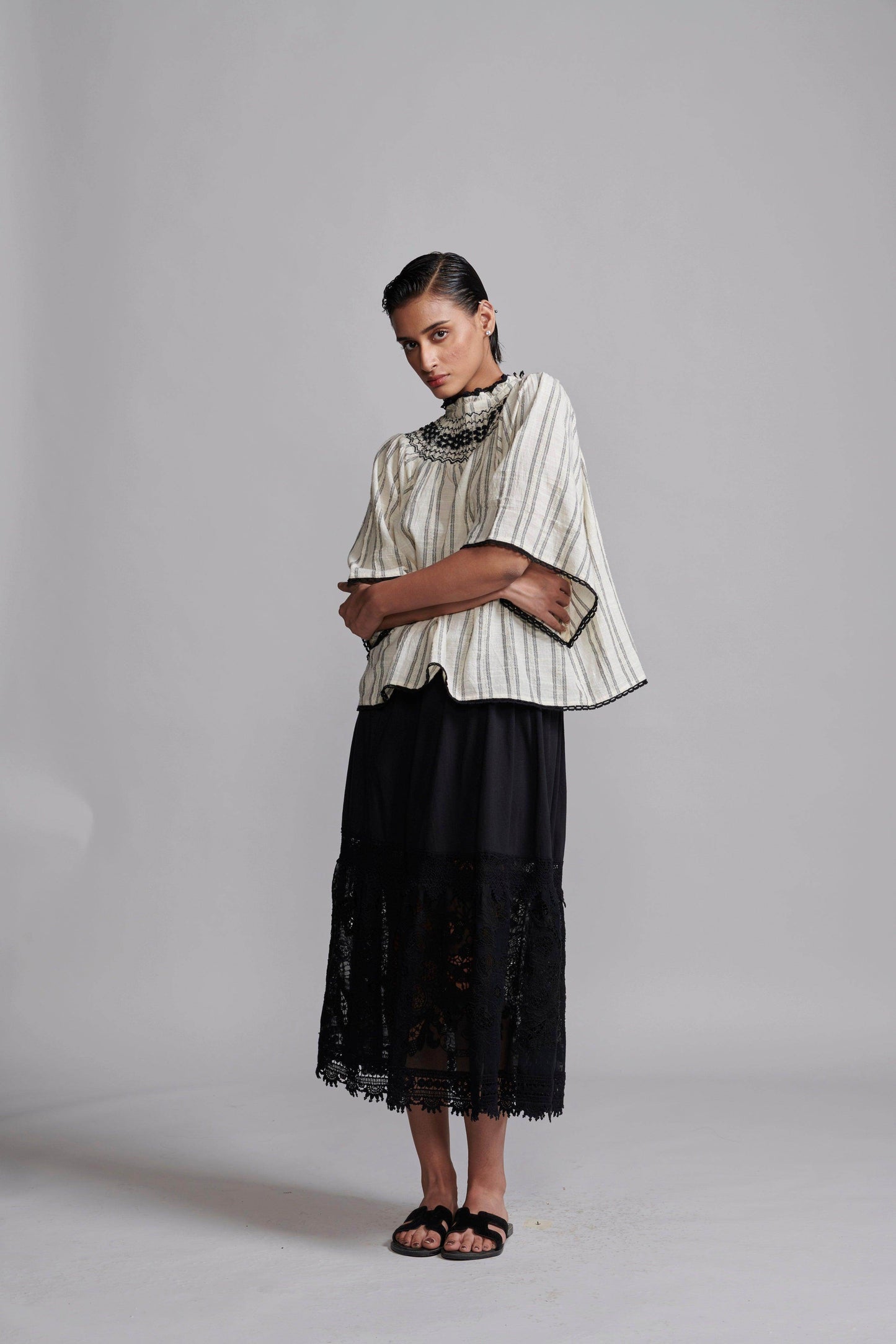 Flowing A-line skirt with cutwork embroidered mesh and lace panel at the bottom. Made from breathable knit jersey for added comfort and movement. Elasticated waist and side pockets.