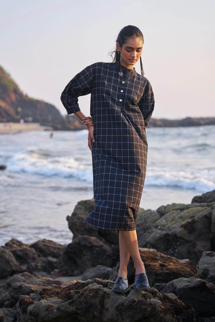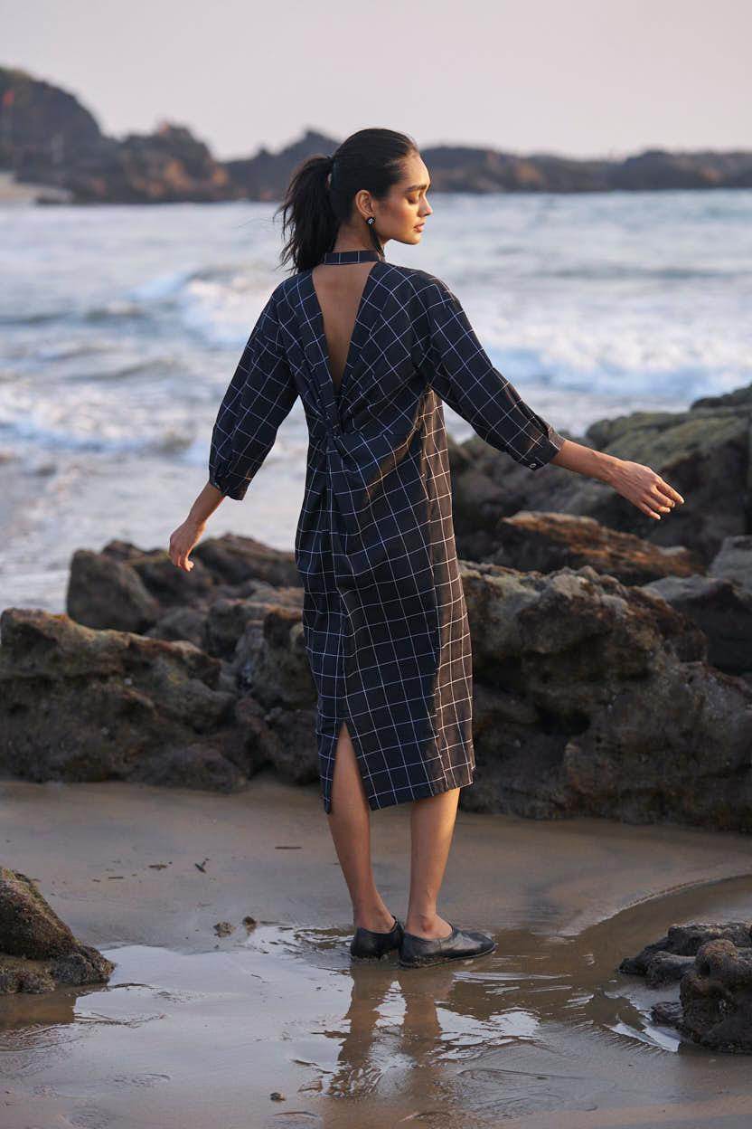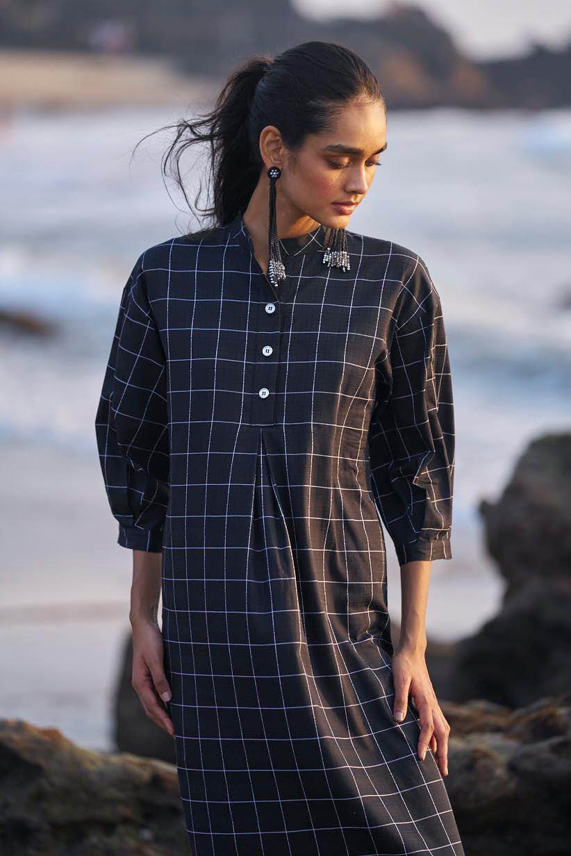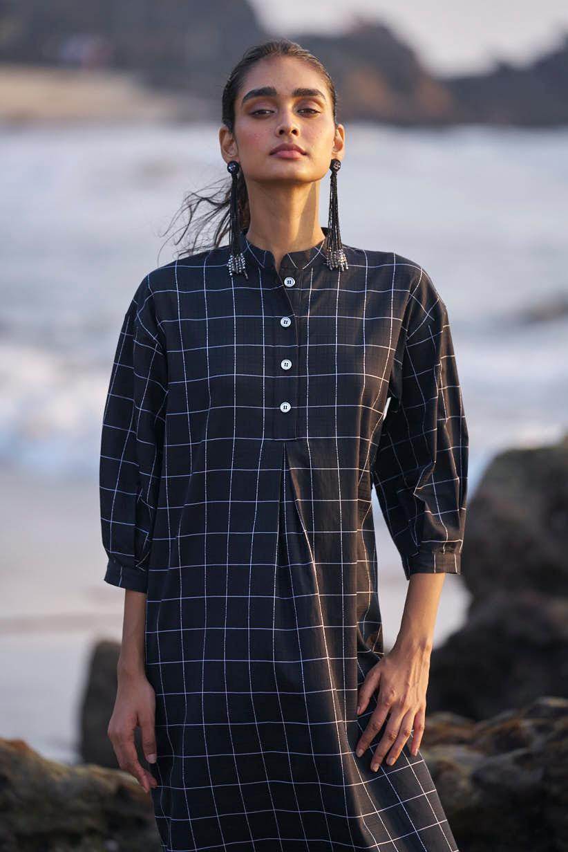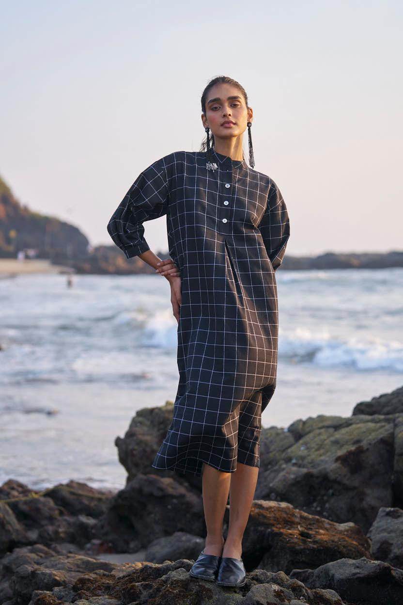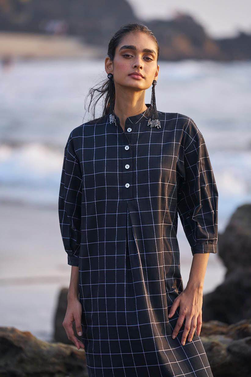 White on black checked cotton midi dress with a band collar and metal buttons. Cropped sleeves, inverted pleat at the front adds to a relaxed fit. Cutout with a twist and tie detail at the upper back.