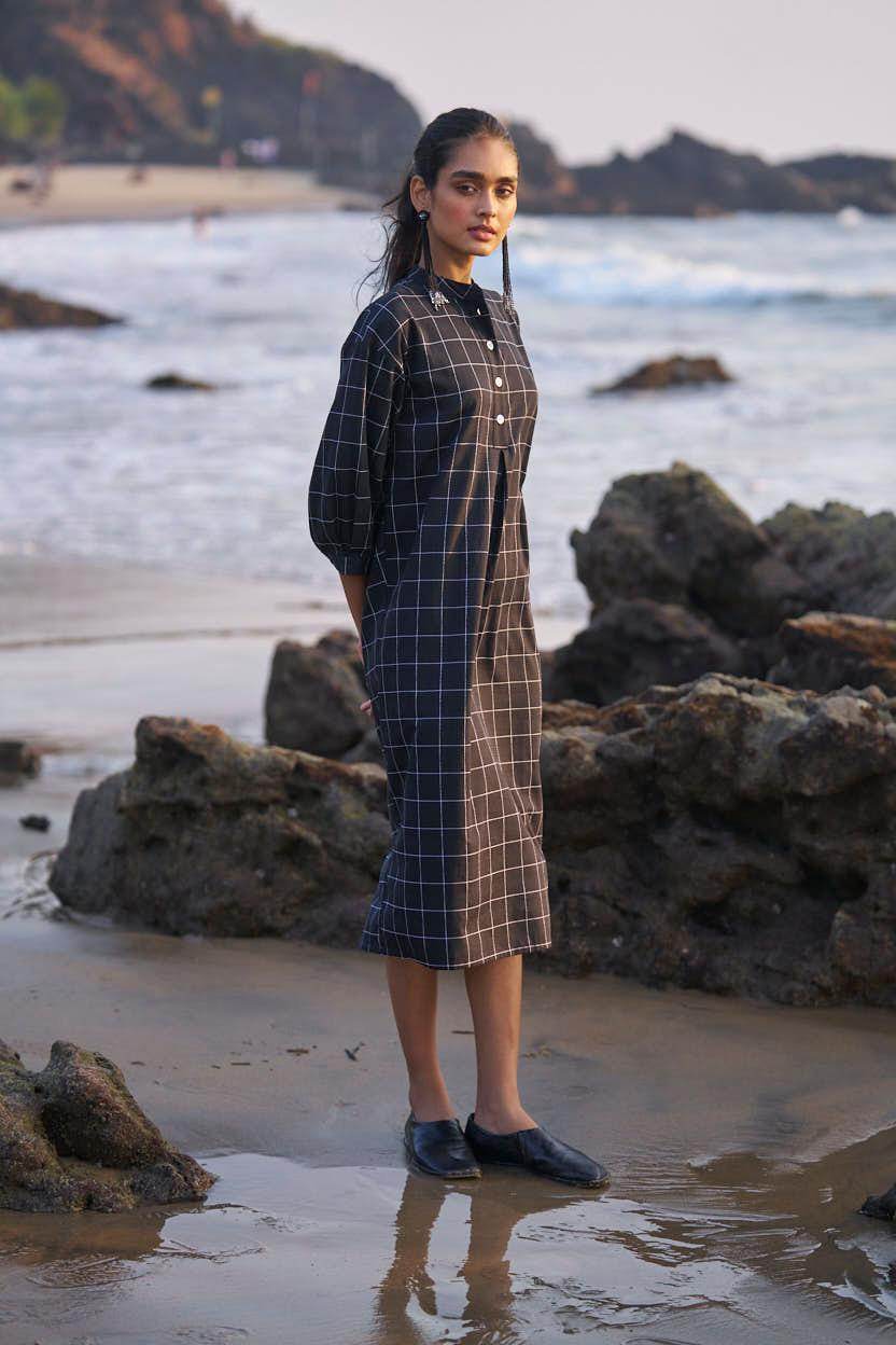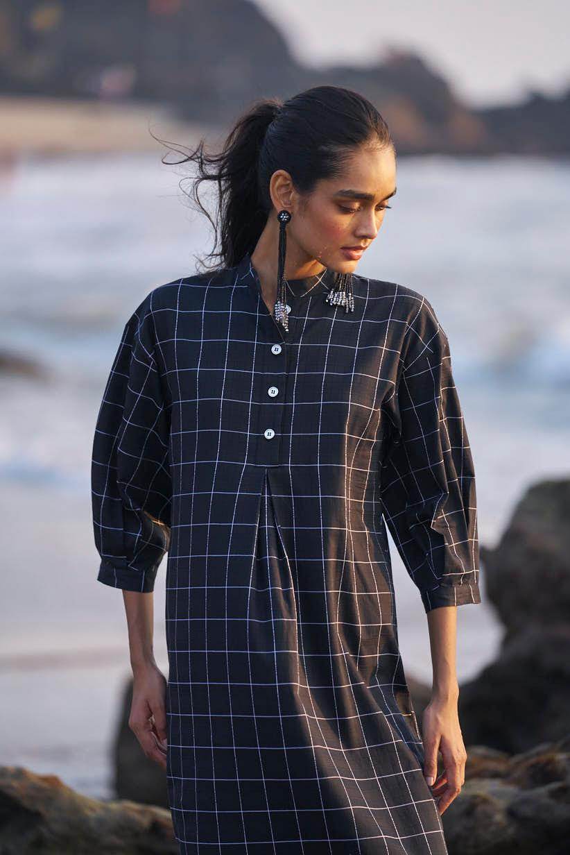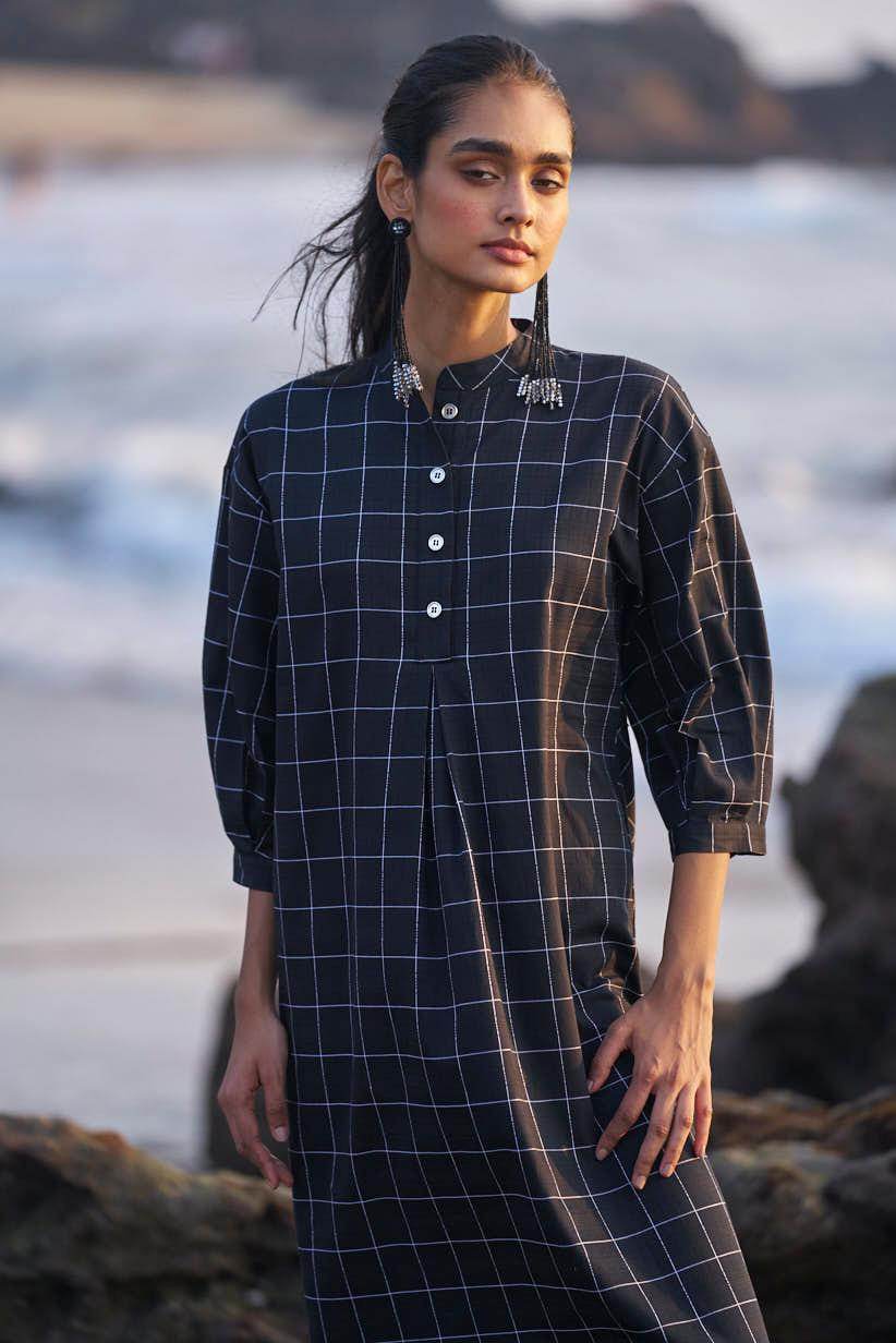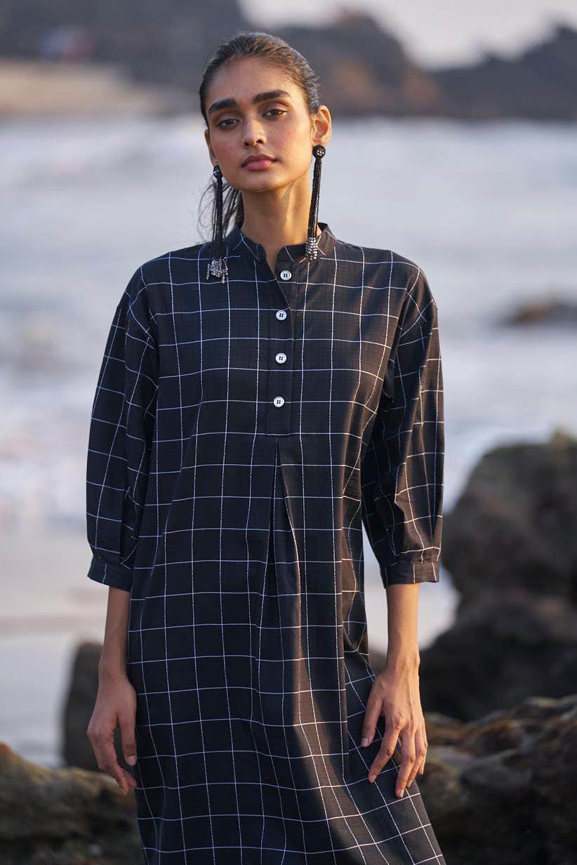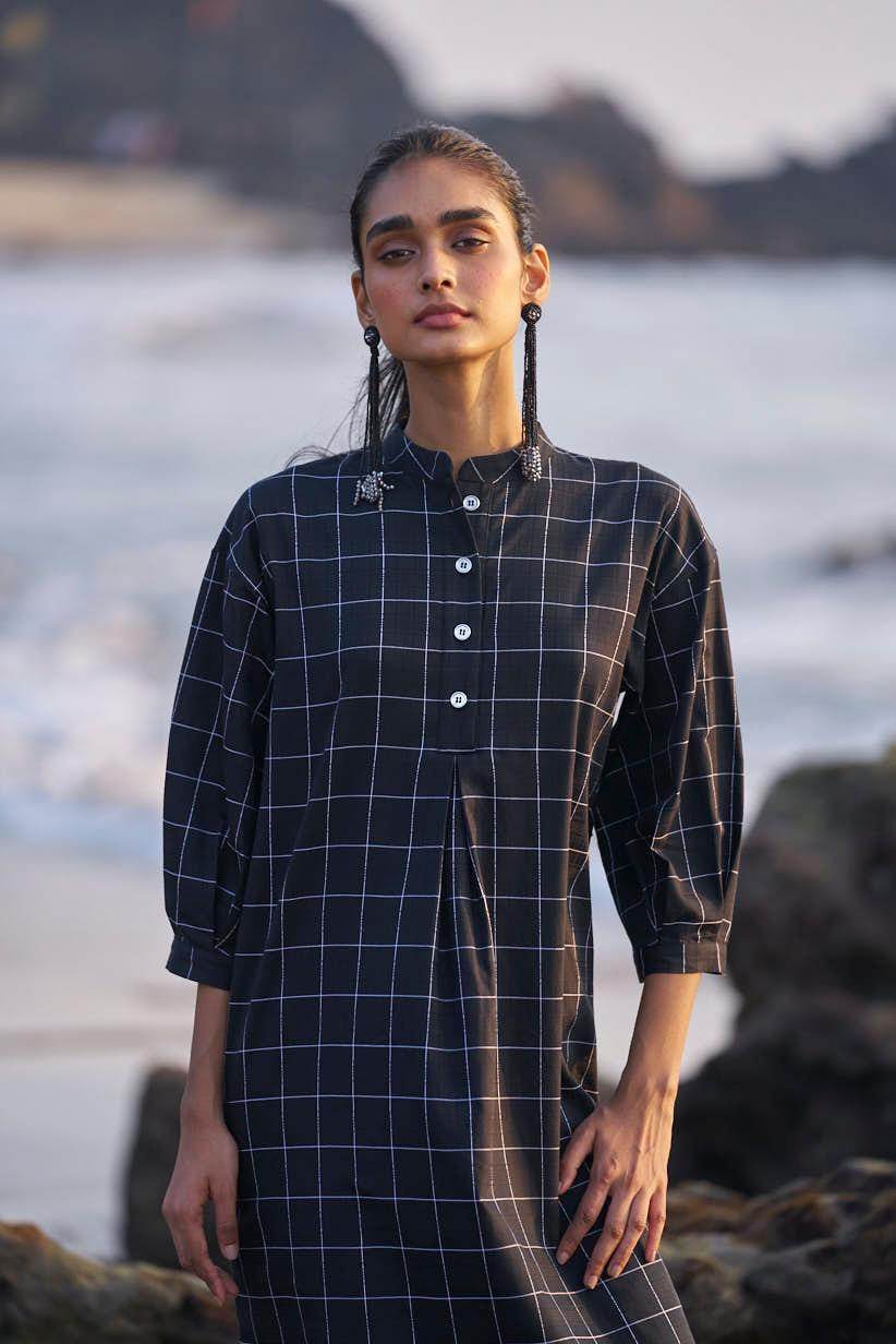 White on black checked cotton midi dress with a band collar and metal buttons. Cropped sleeves, inverted pleat at the front adds to a relaxed fit. Cutout with a twist and tie detail at the upper back.