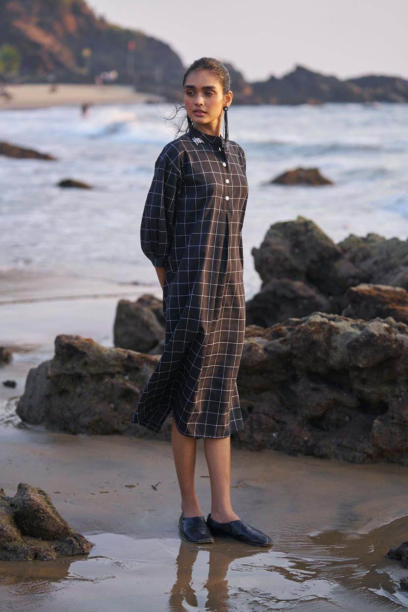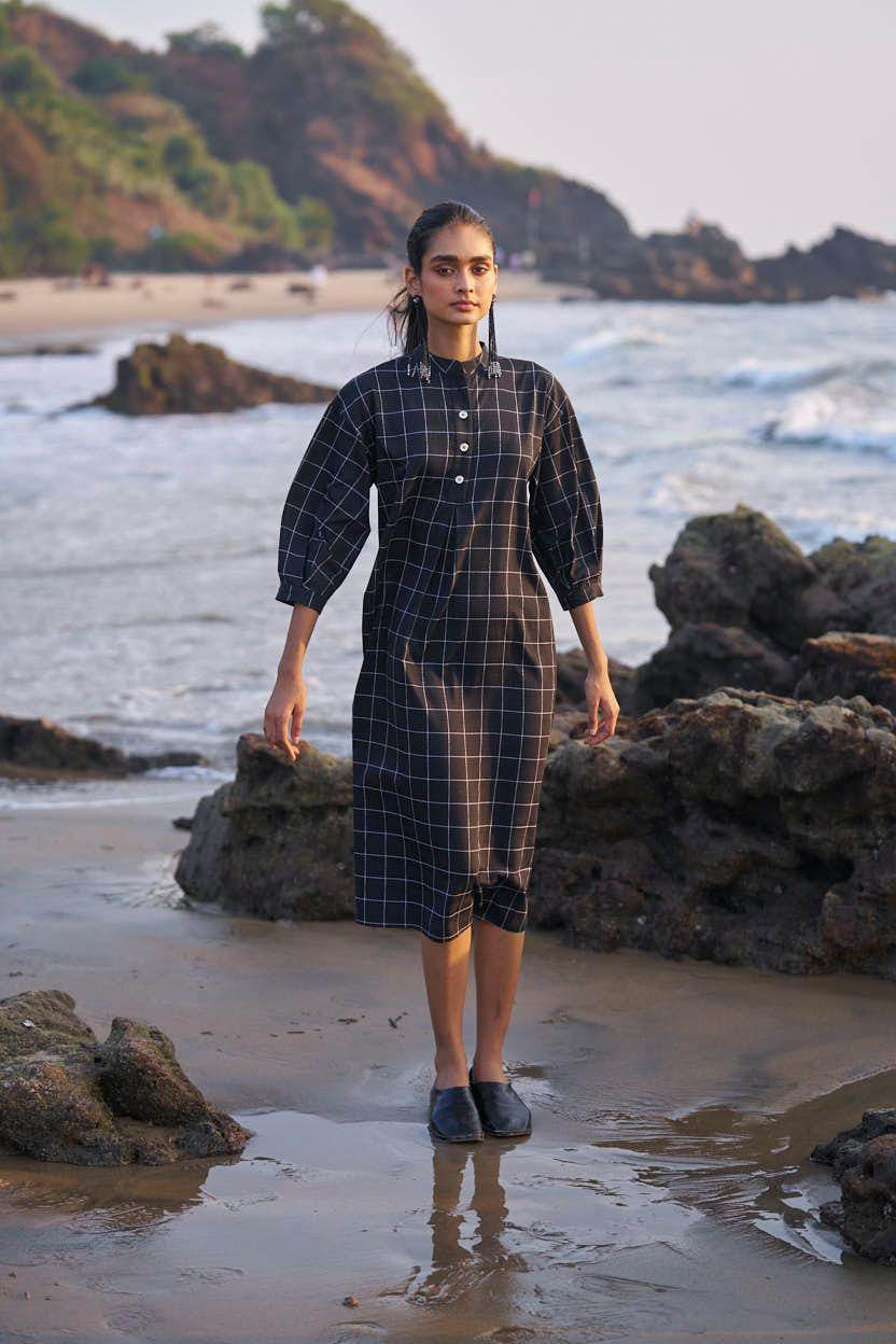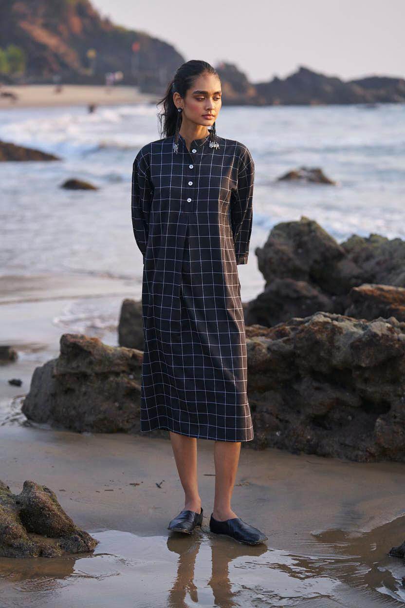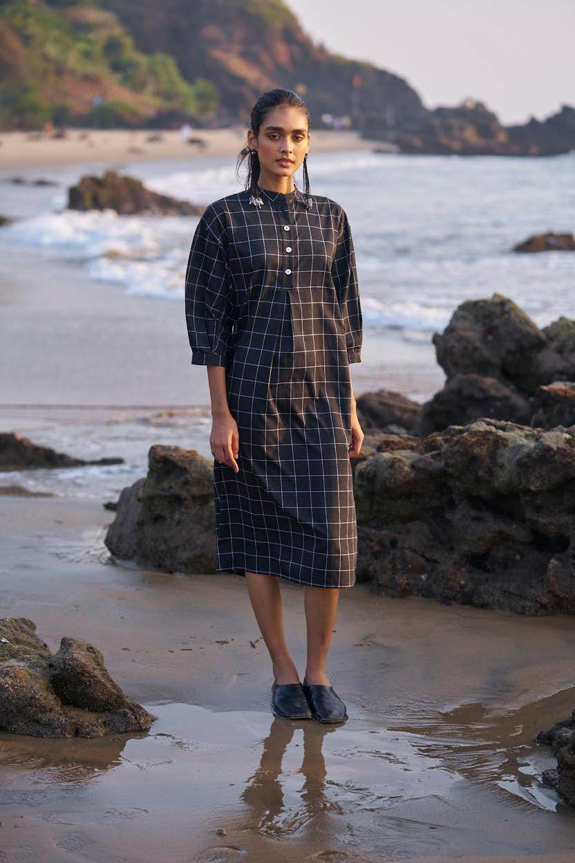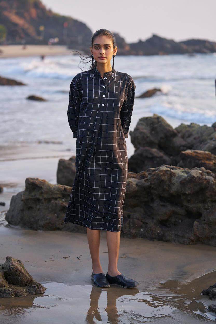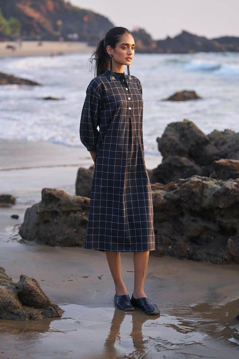 White on black checked cotton midi dress with a band collar and metal buttons. Cropped sleeves, inverted pleat at the front adds to a relaxed fit. Cutout with a twist and tie detail at the upper back.