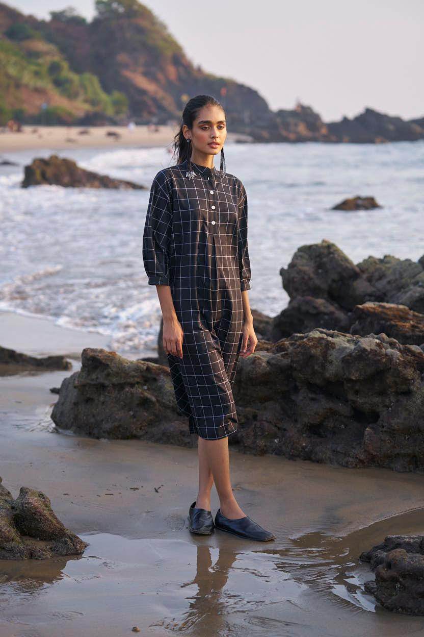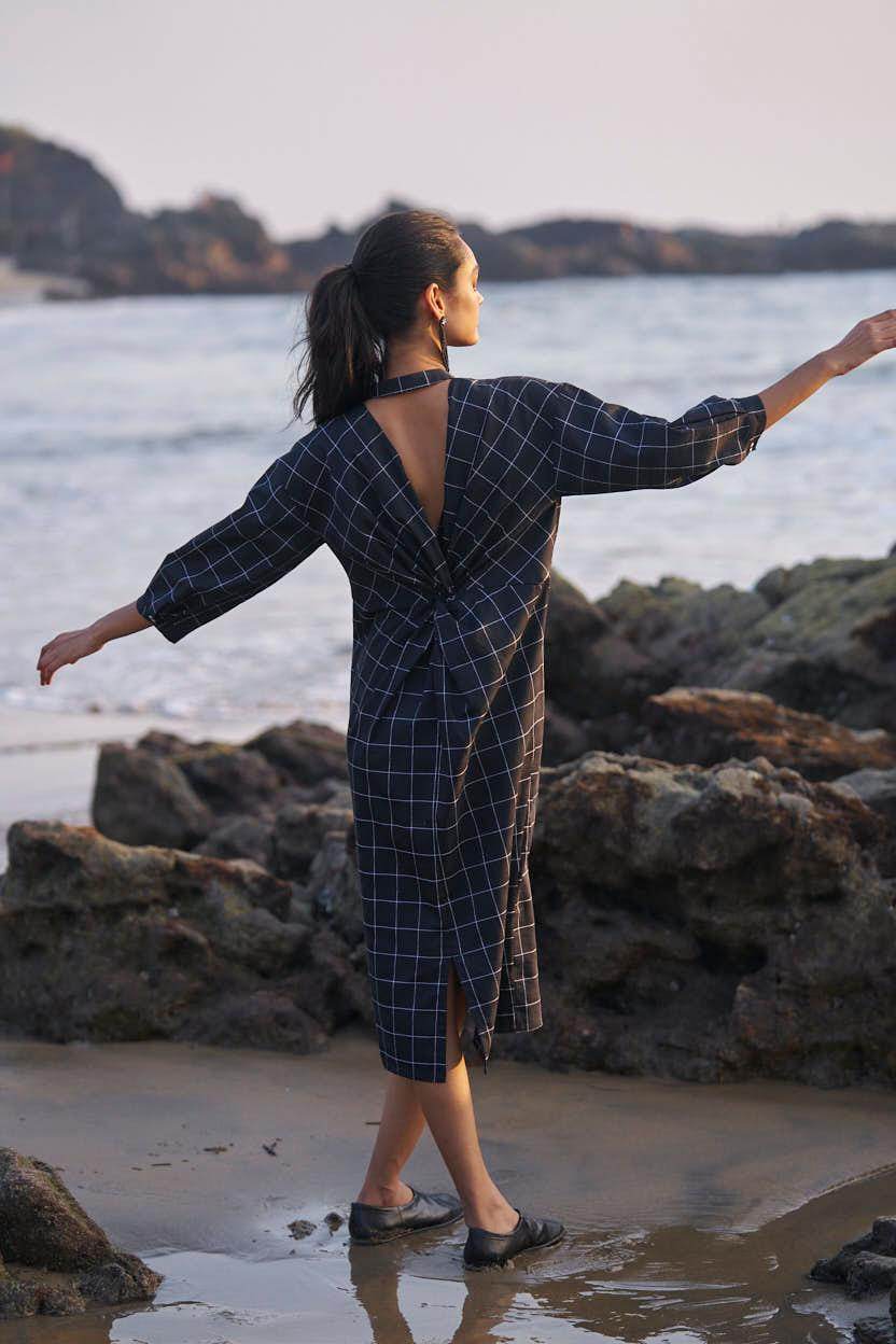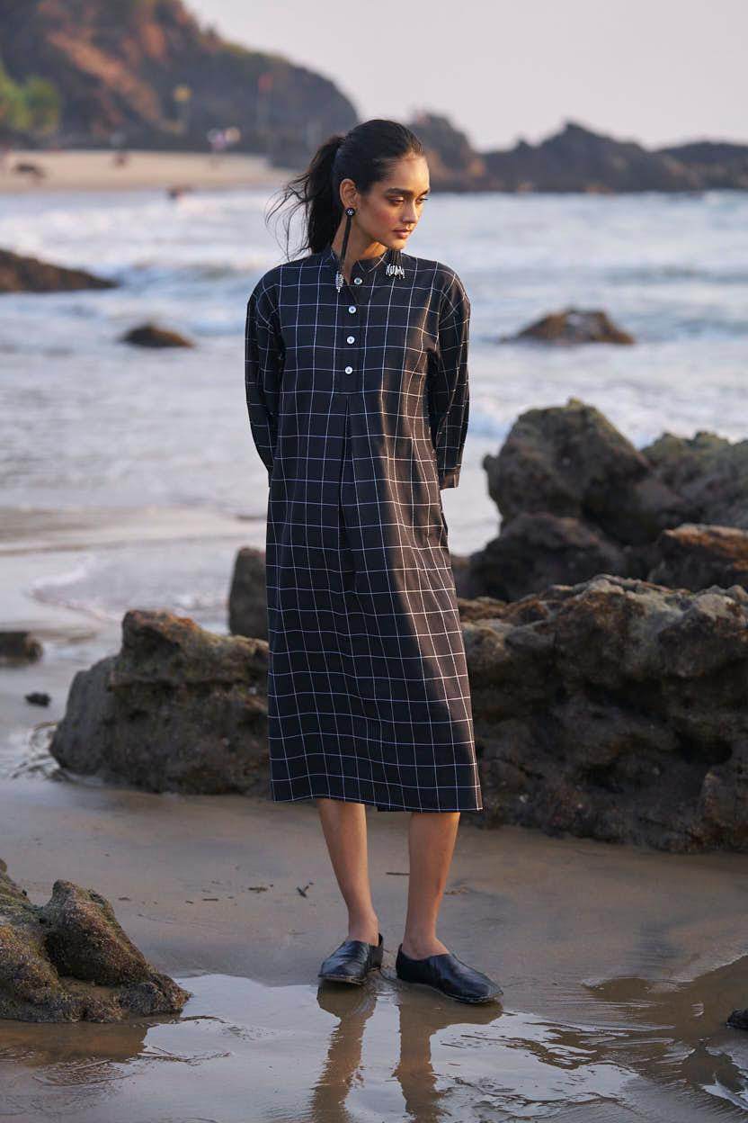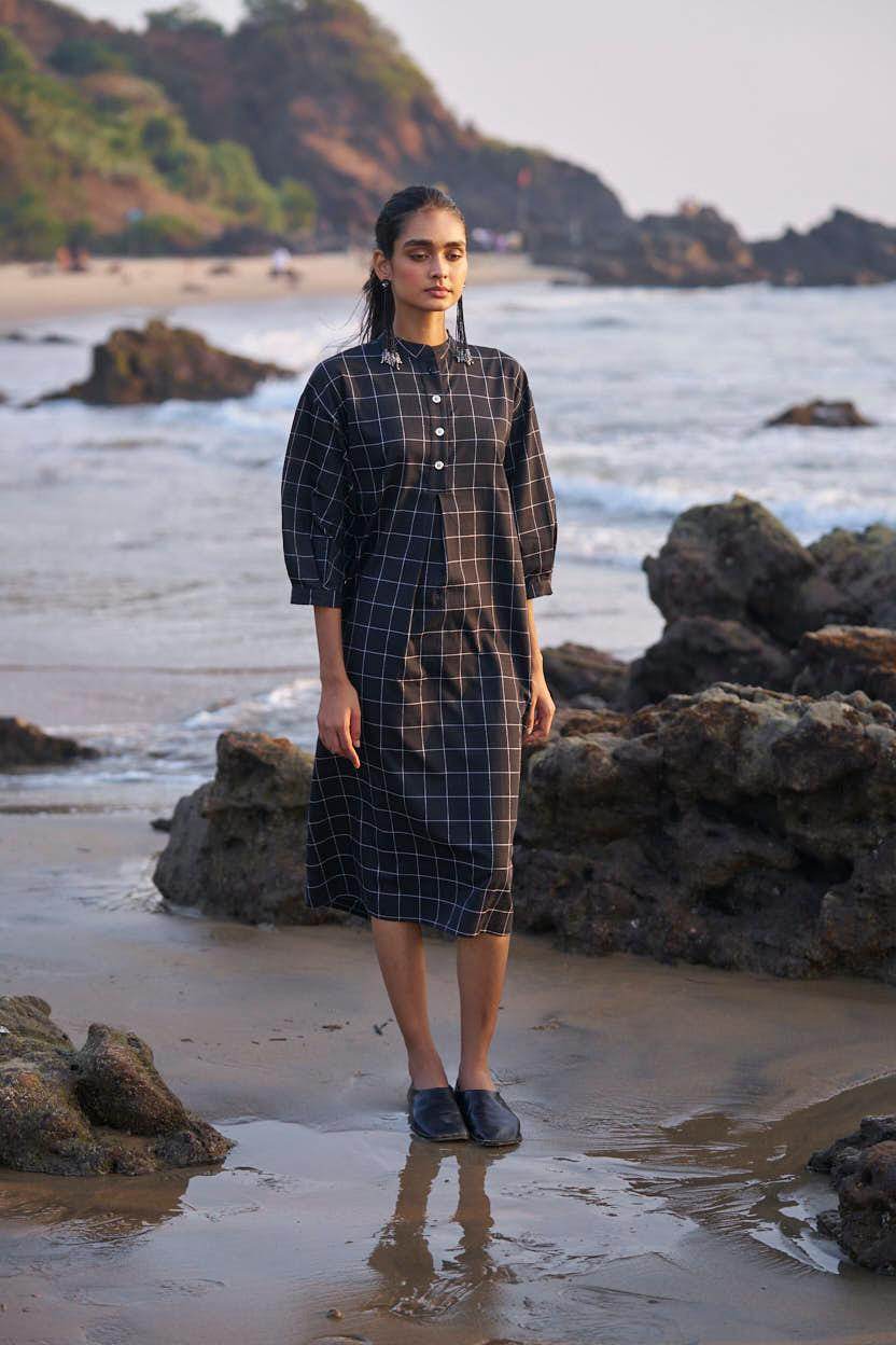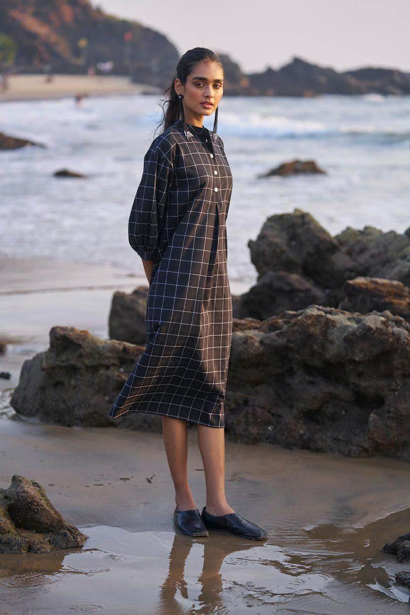 White on black checked cotton midi dress with a band collar and metal buttons. Cropped sleeves, inverted pleat at the front adds to a relaxed fit. Cutout with a twist and tie detail at the upper back.