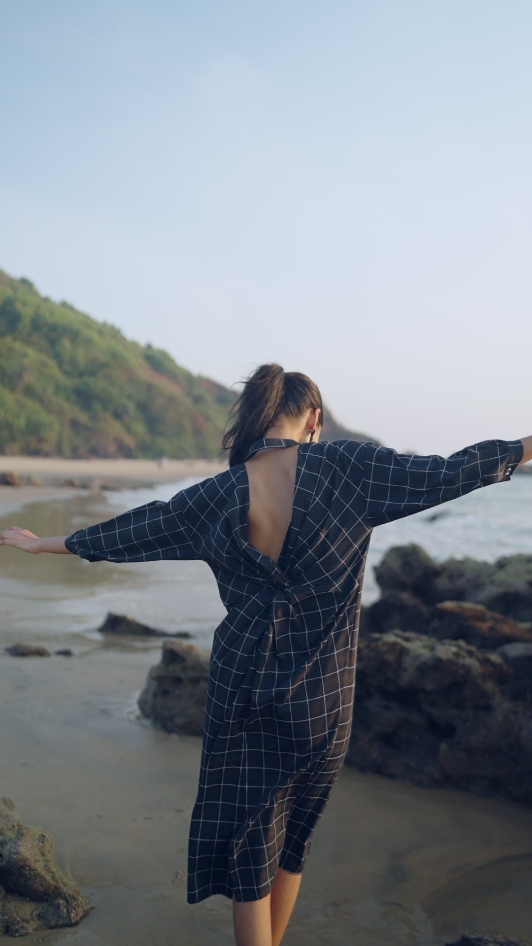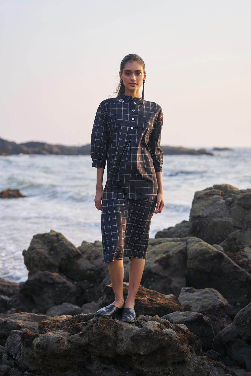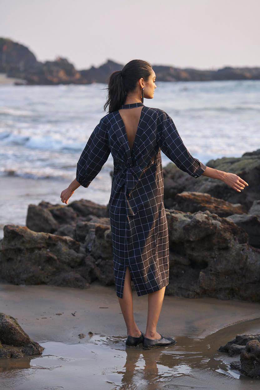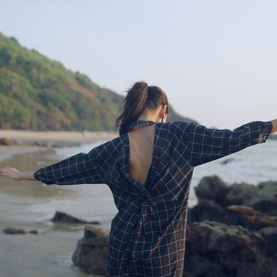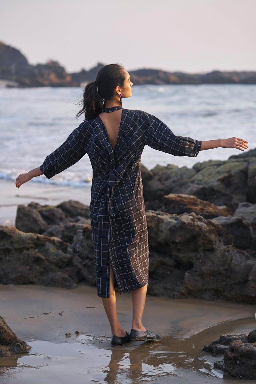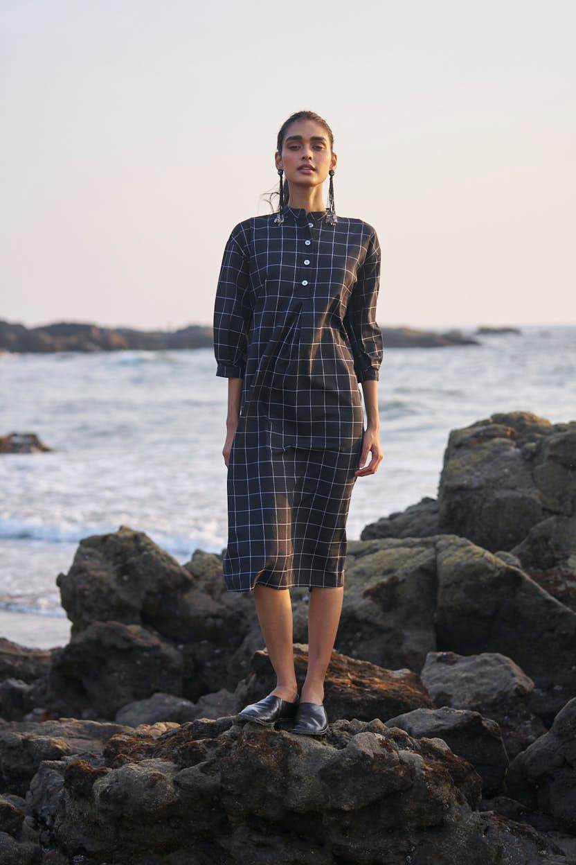White on black checked cotton midi dress with a band collar and metal buttons. Cropped sleeves, inverted pleat at the front adds to a relaxed fit. Cutout with a twist and tie detail at the upper back.