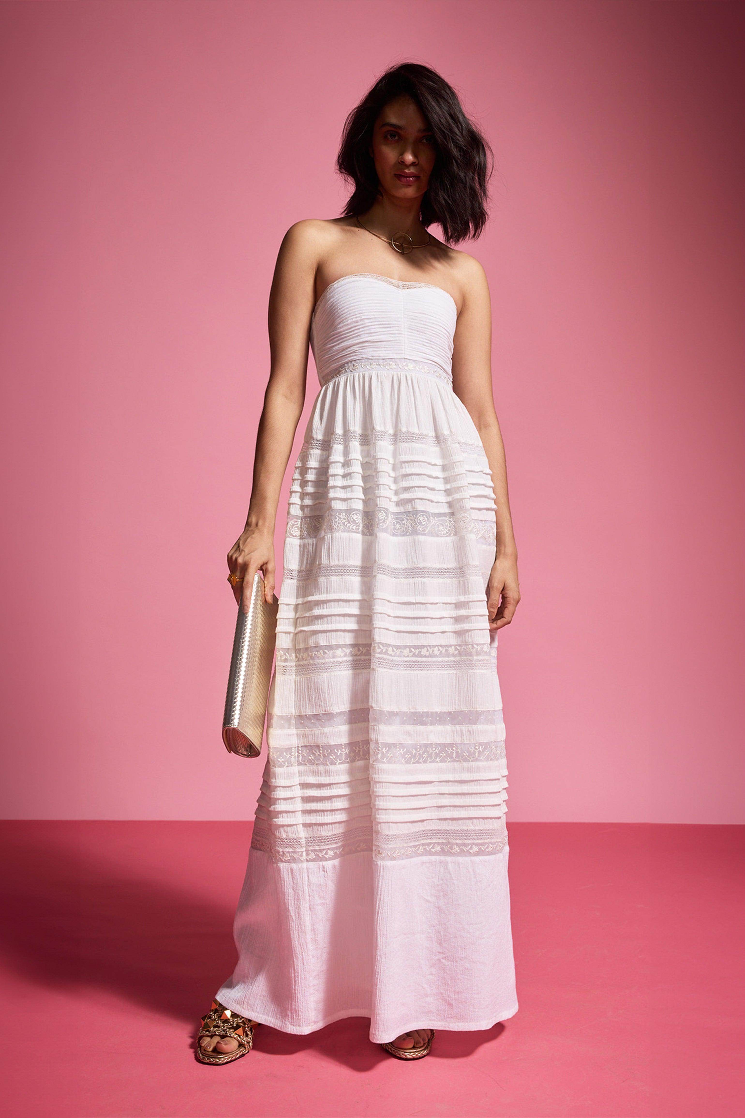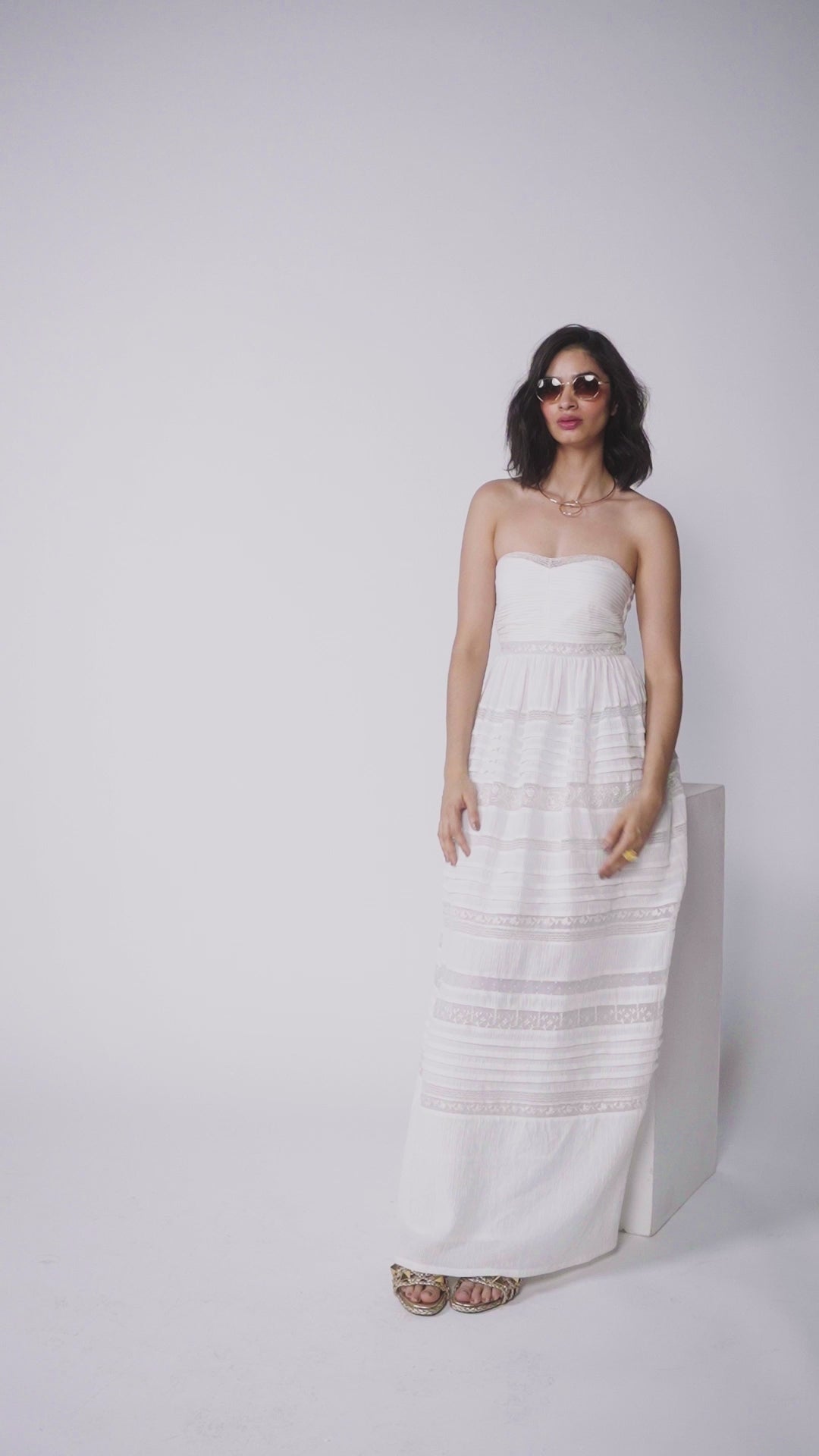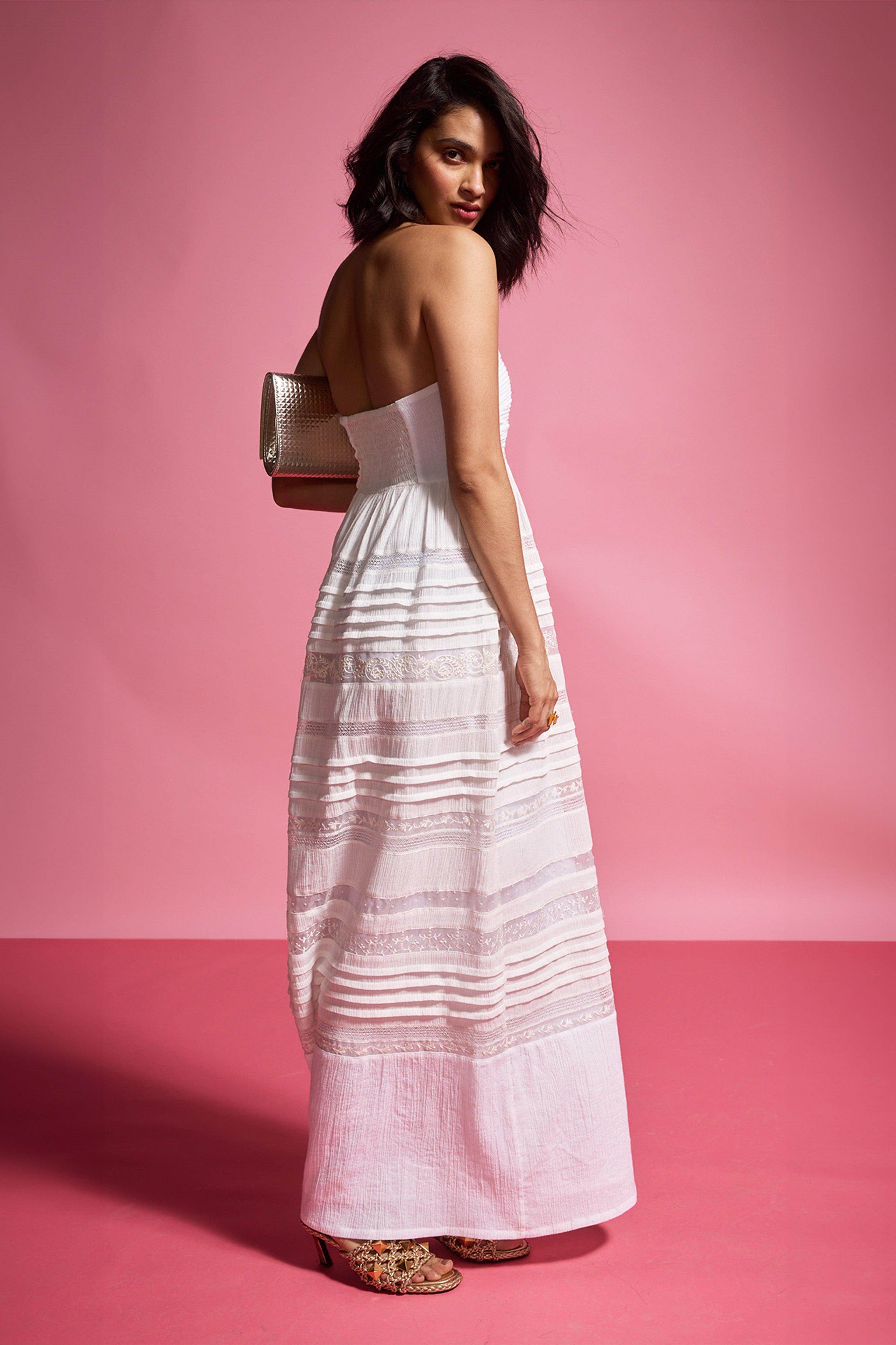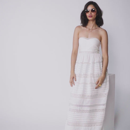 Ivory tube maxi-dress with an off-shoulder sweetheart neckline in edged lace. Features tiered layers with hand-sewn pleats, delicate embroidery, and lace. Smocked panel at the back for an improved fit. Removable pad pockets in the front. Fully lined.