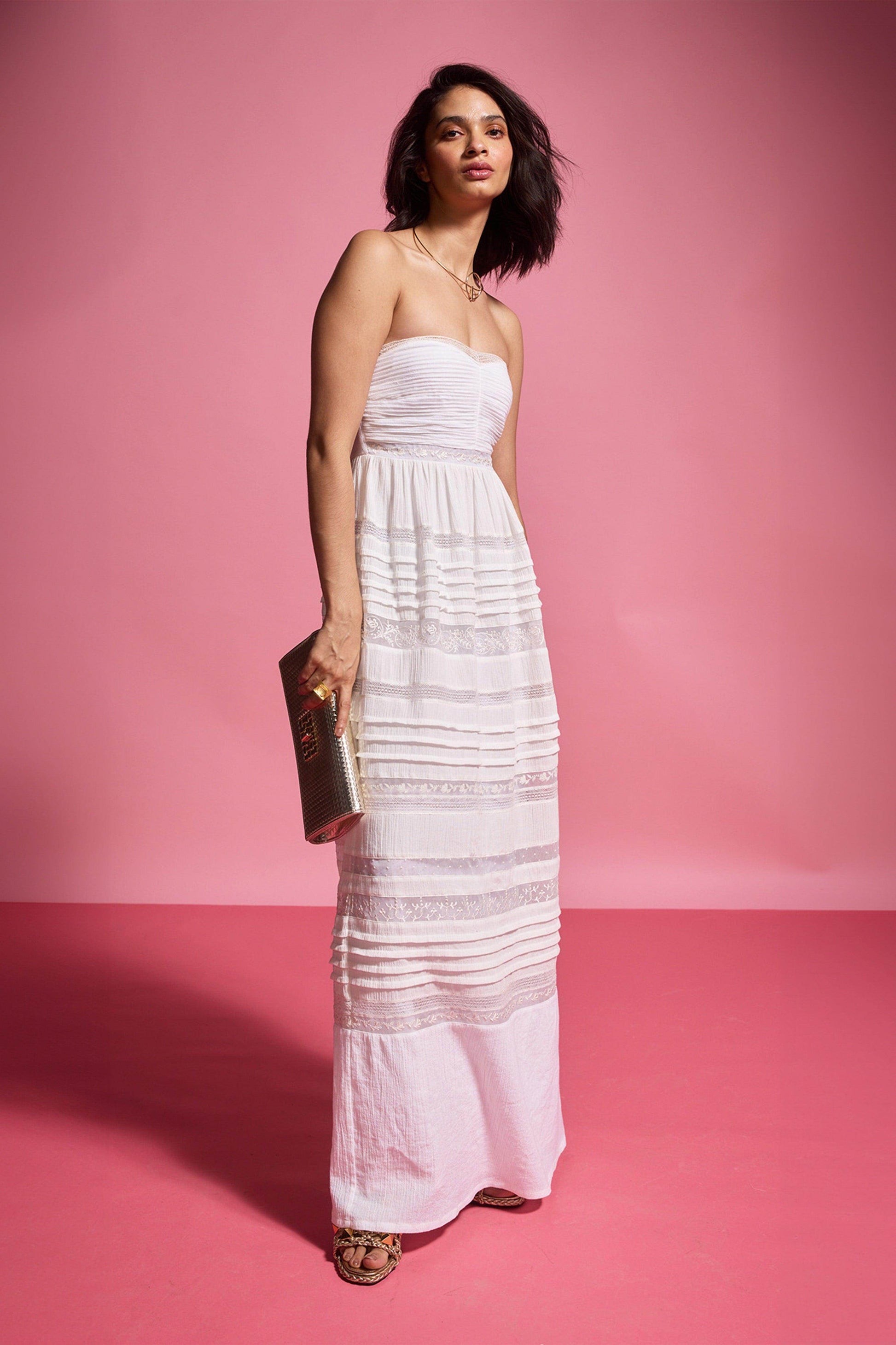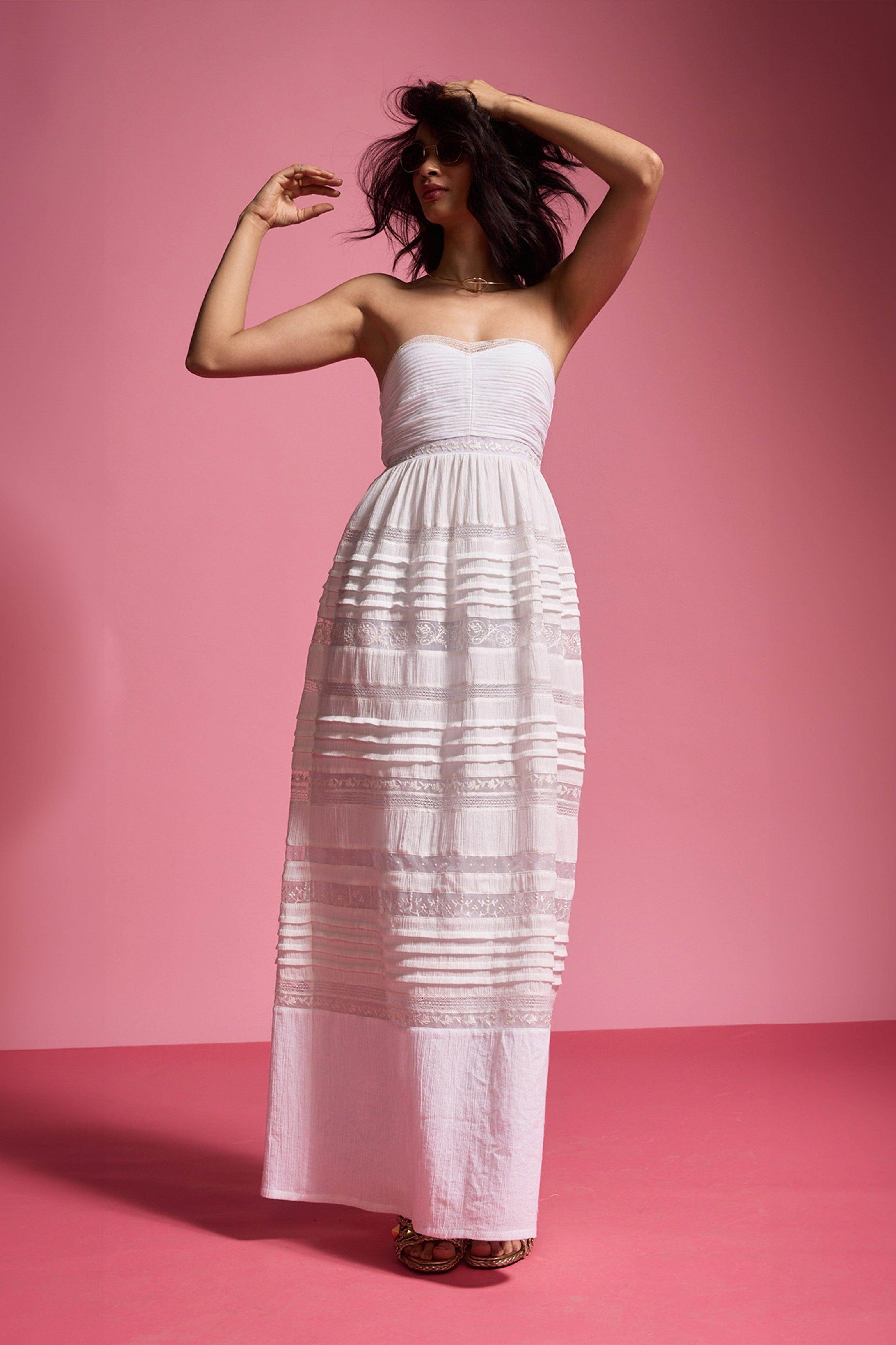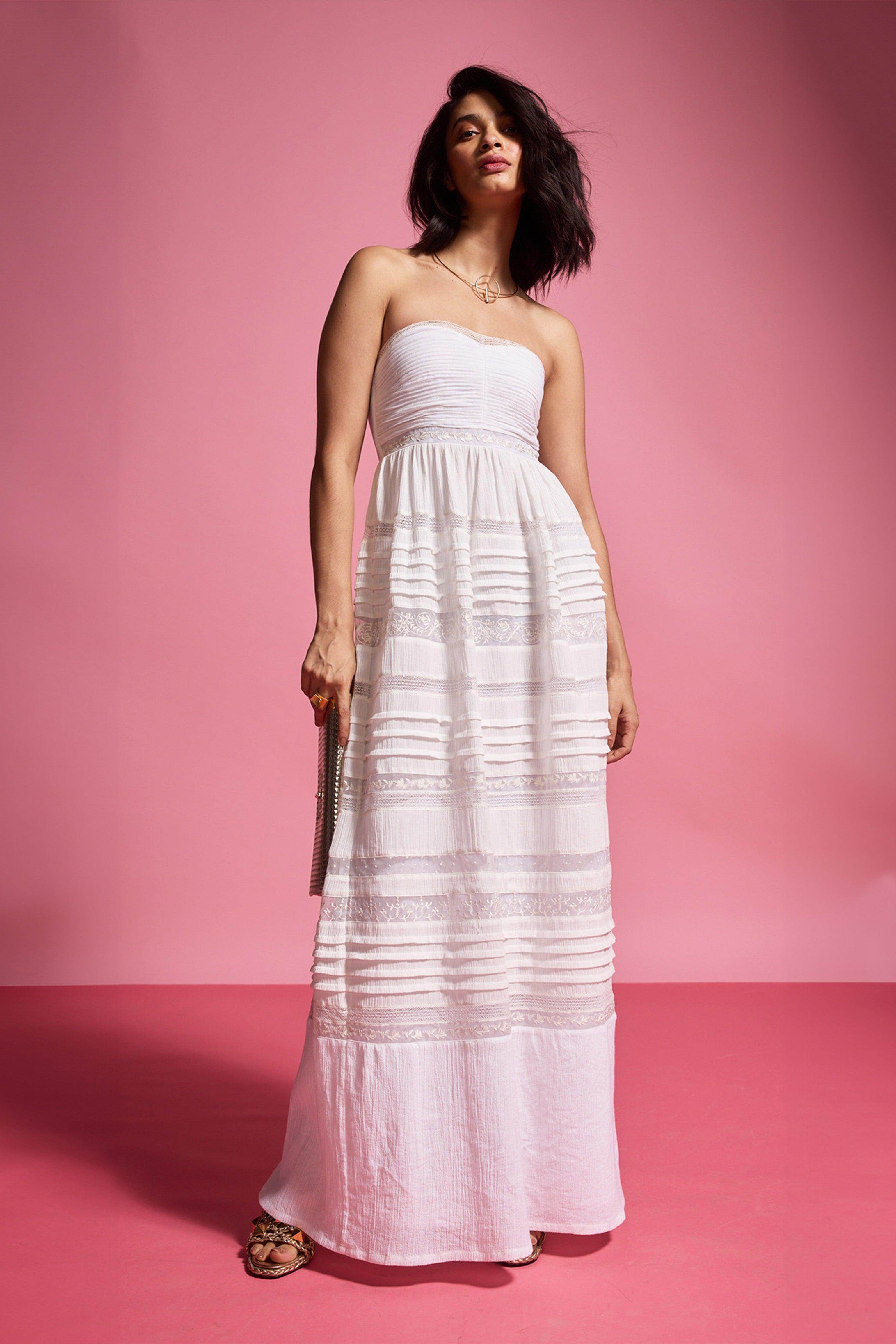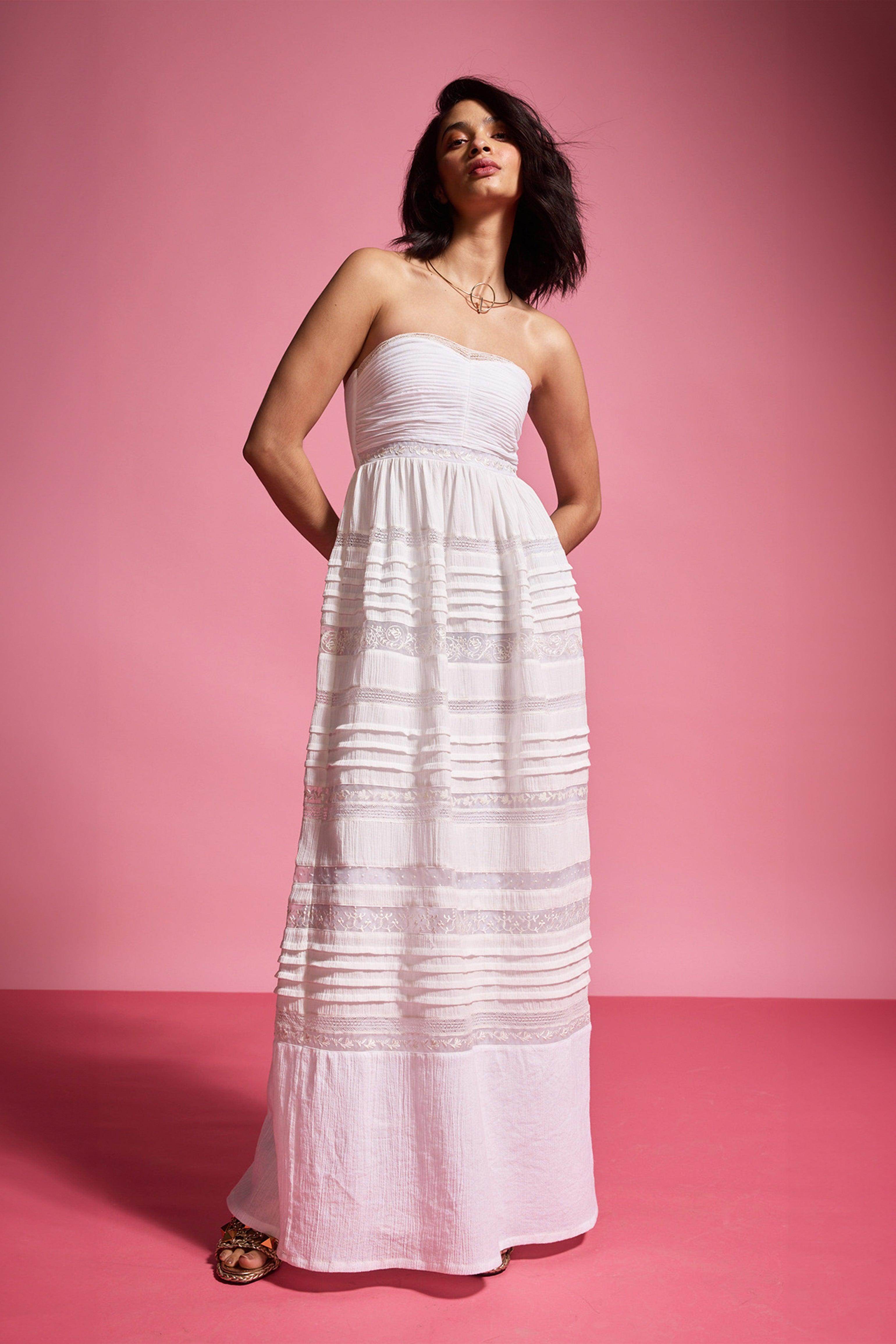 Ivory tube maxi-dress with an off-shoulder sweetheart neckline in edged lace. Features tiered layers with hand-sewn pleats, delicate embroidery, and lace. Smocked panel at the back for an improved fit. Removable pad pockets in the front. Fully lined.