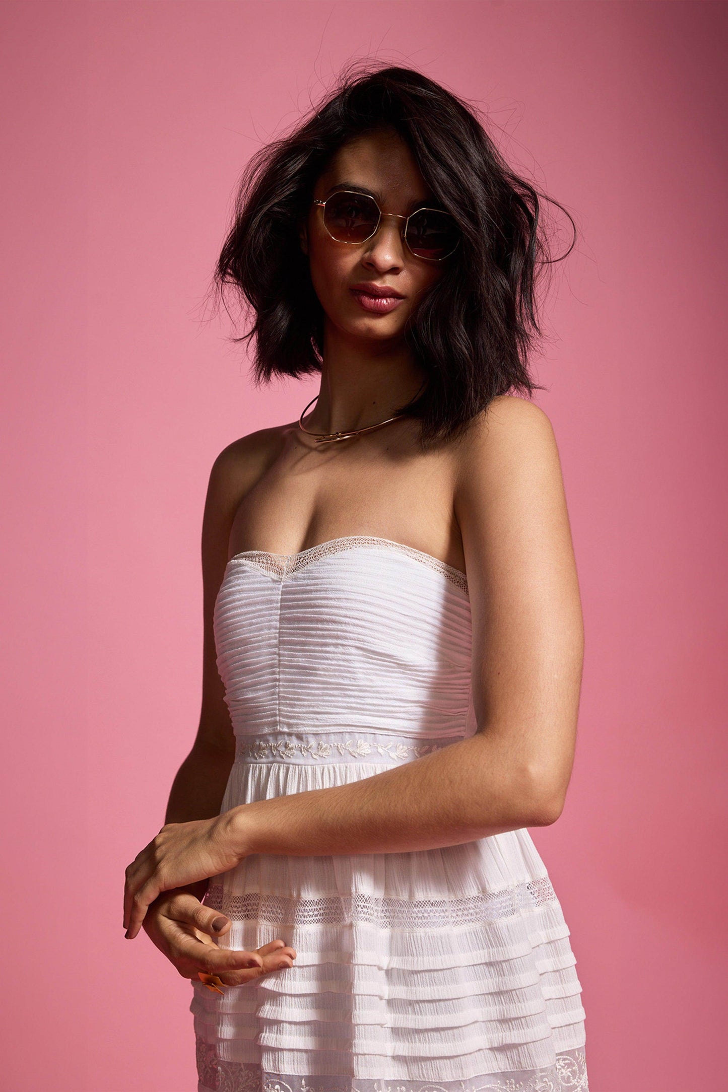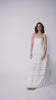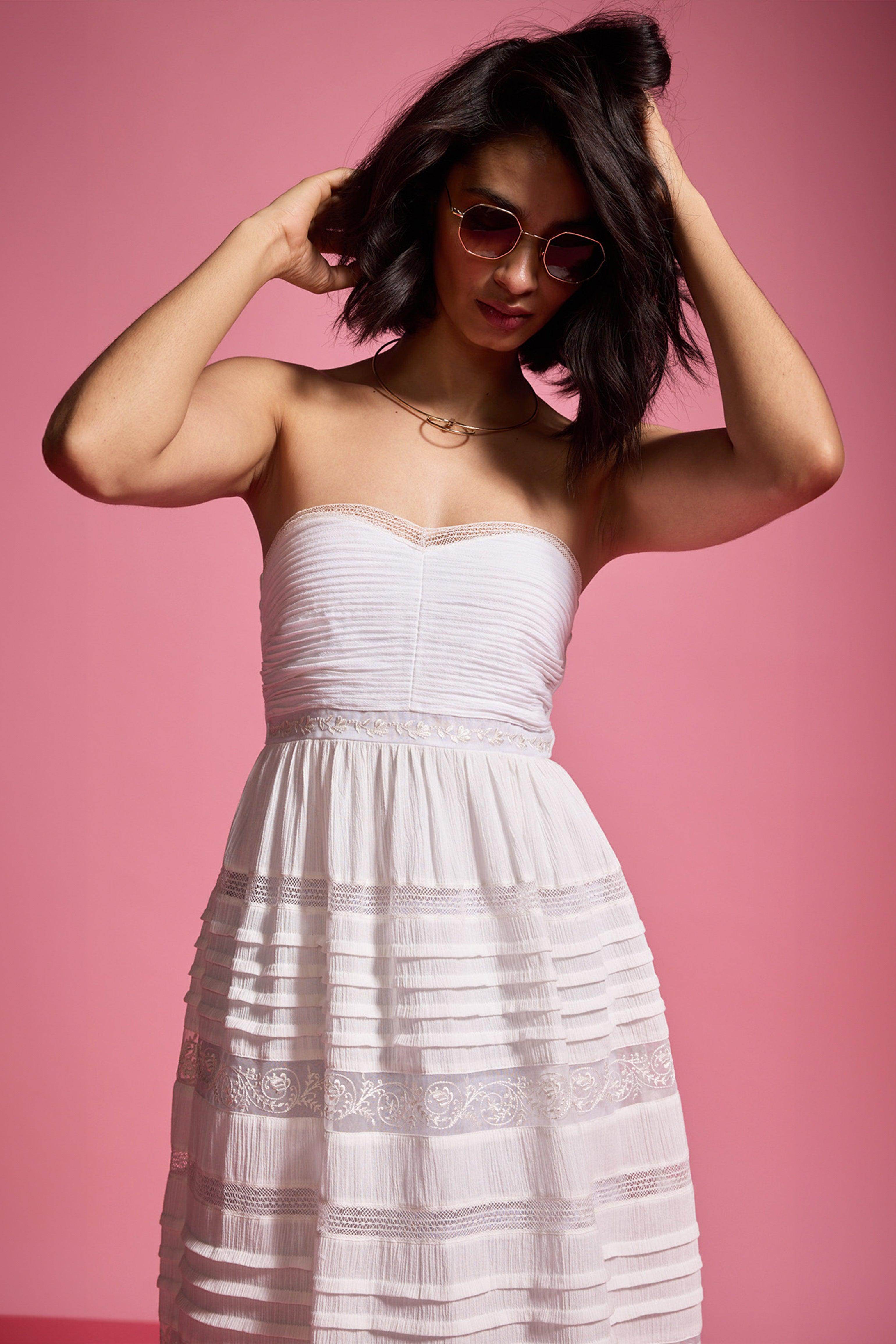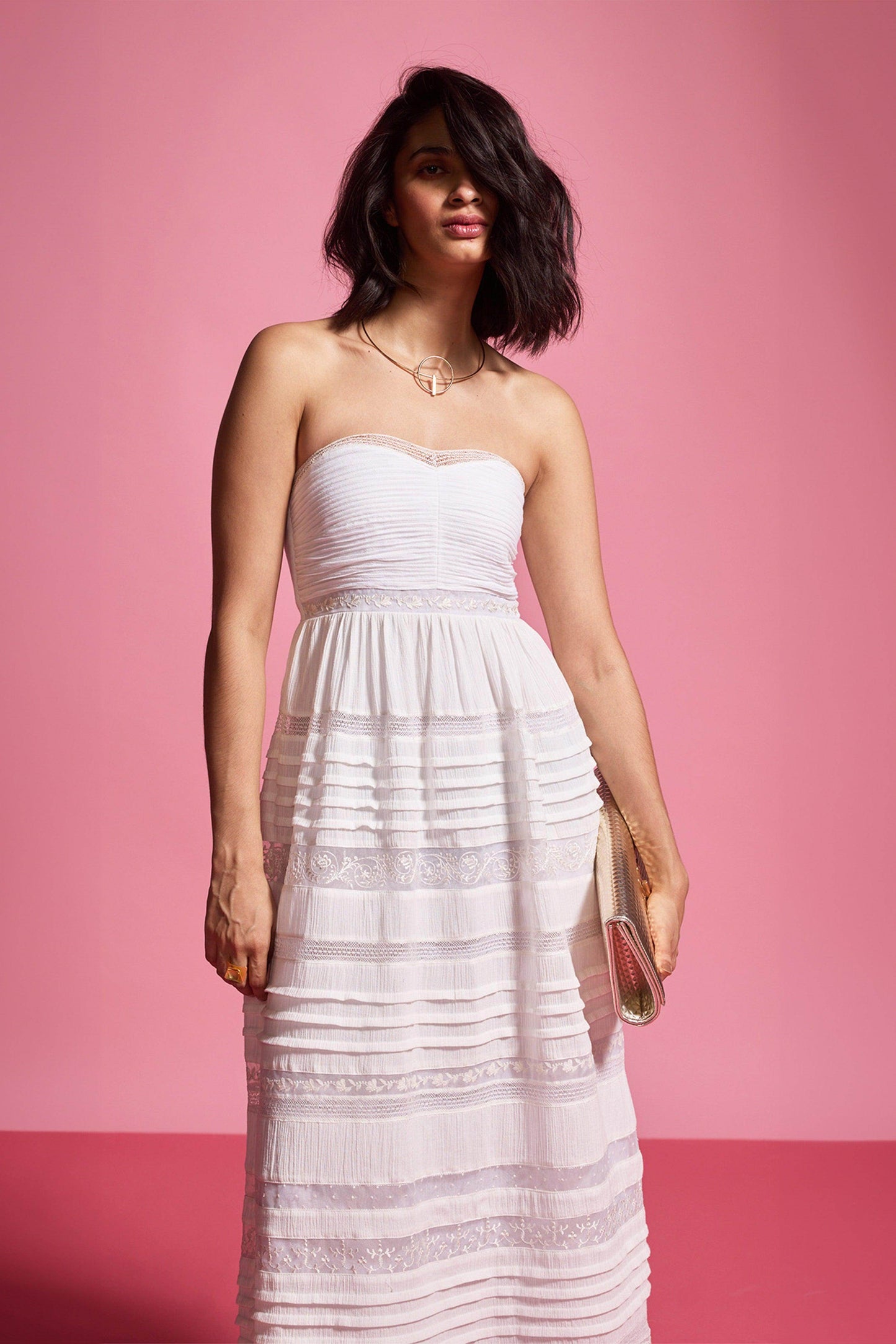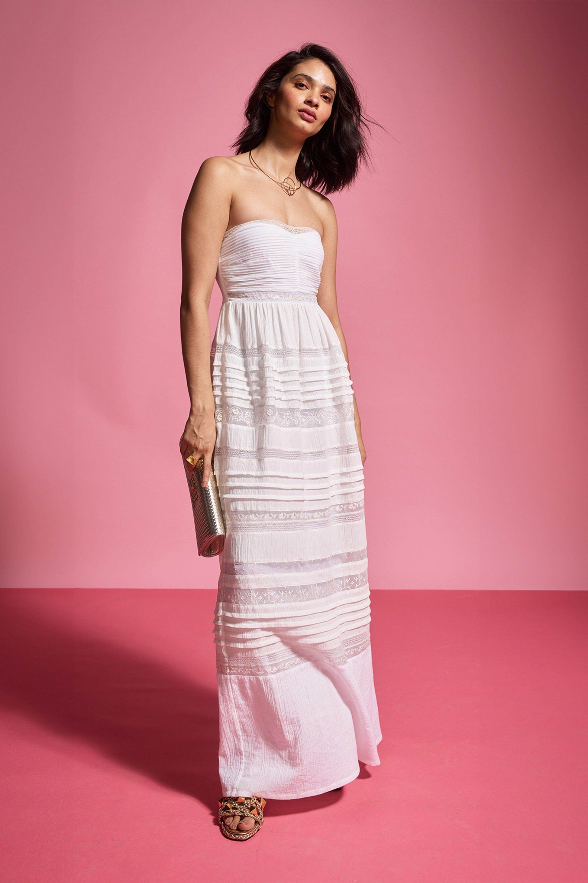 Ivory tube maxi-dress with an off-shoulder sweetheart neckline in edged lace. Features tiered layers with hand-sewn pleats, delicate embroidery, and lace. Smocked panel at the back for an improved fit. Removable pad pockets in the front. Fully lined.