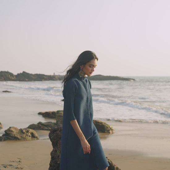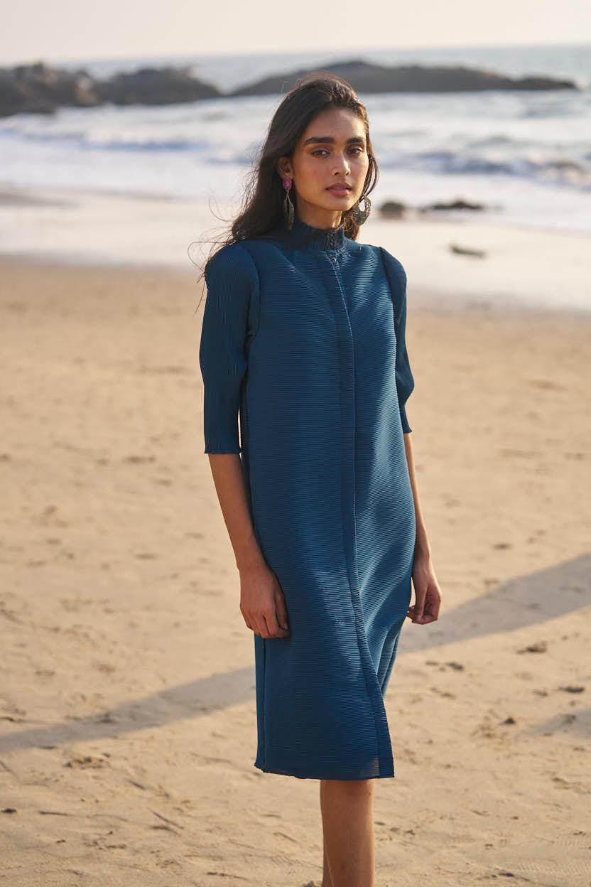 Teal pleated button down A-line midi dress with a dainty frill band collar. 3/4th sleeves with lettuce hem. Concealed placket with snap button closure. The garment is fully lined.