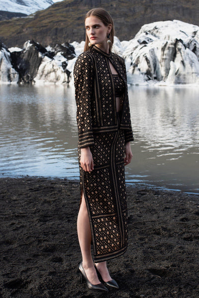 HOUNDSTOOTH SEQUIN SARI-DRAPE GOWN