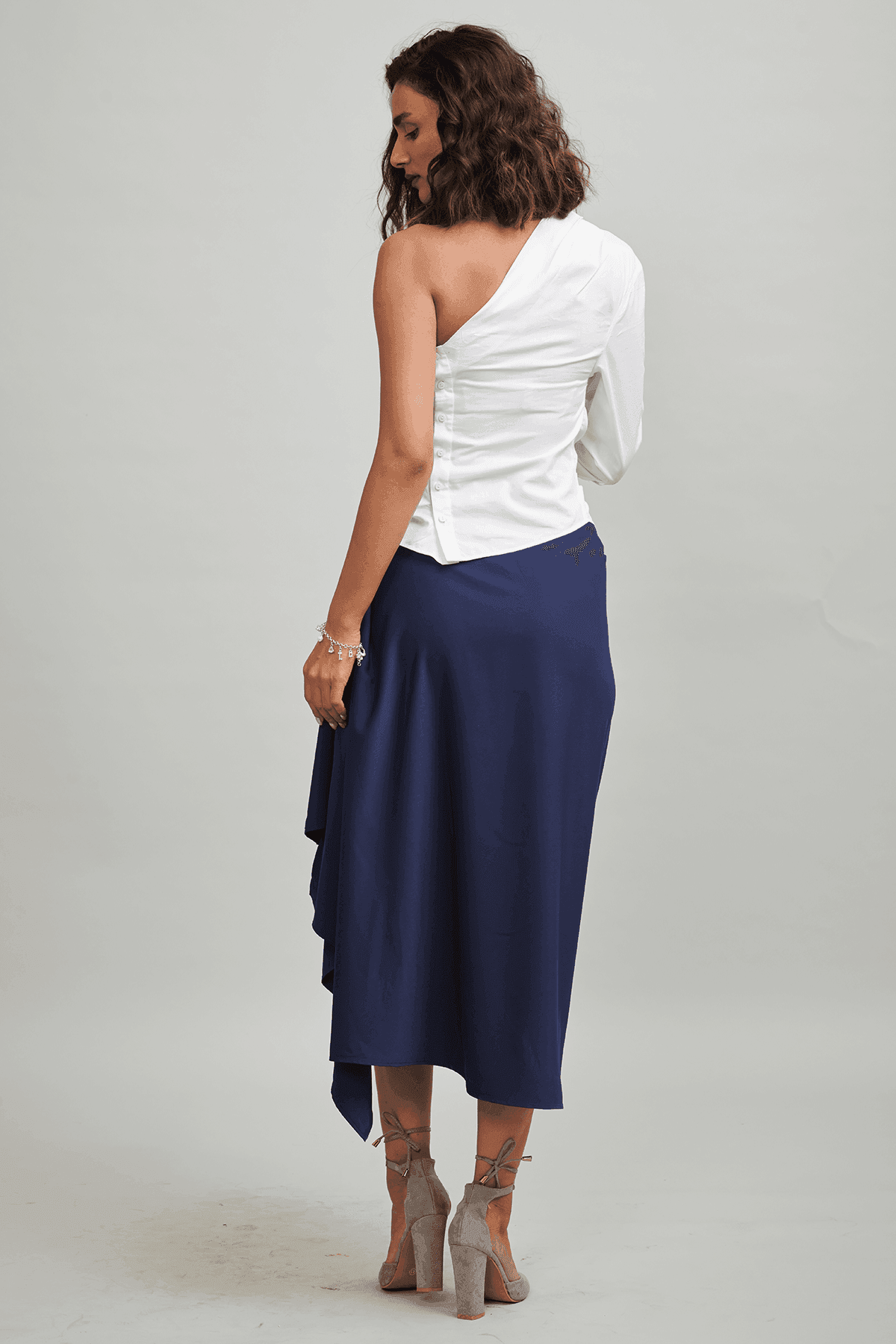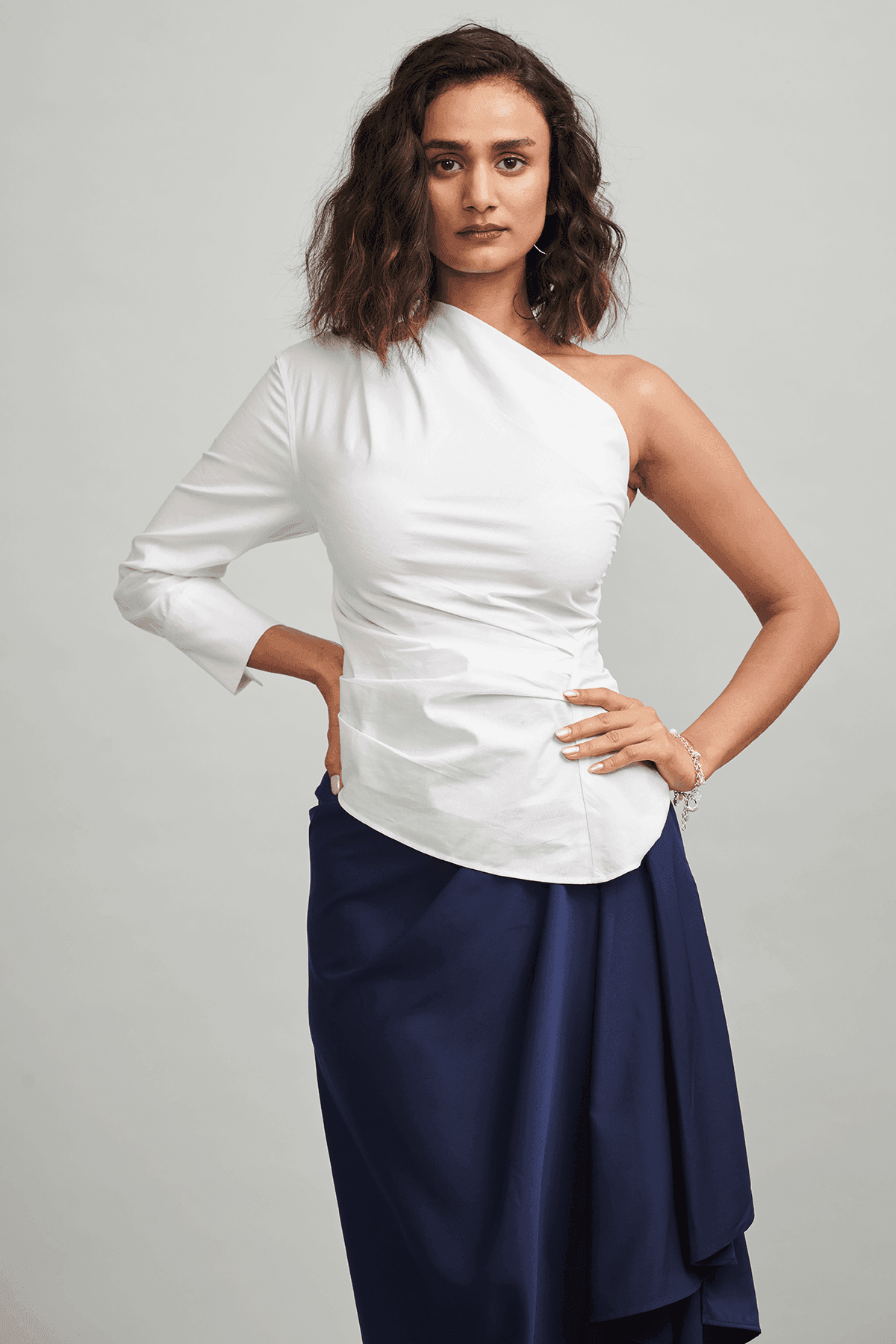Single shoulder shirt in white cotton poplin. Button down, semi fitted, with a single full sleeve.