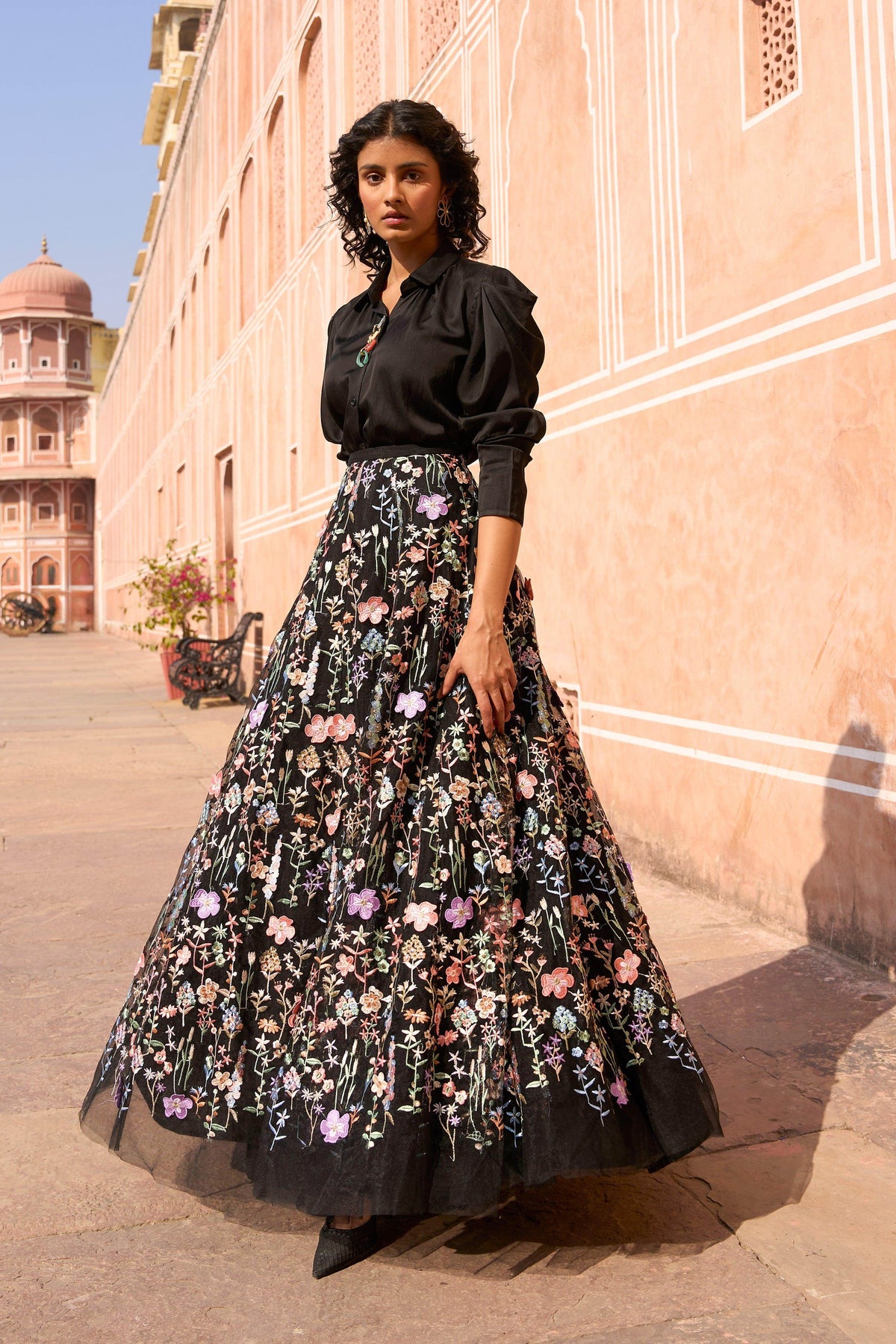 Dramatic 3D embroidered floral lace flared maxi skirt. Pastel toned florals on a black base. Hook/eye and zip closure in the side. Garment is fully lined.