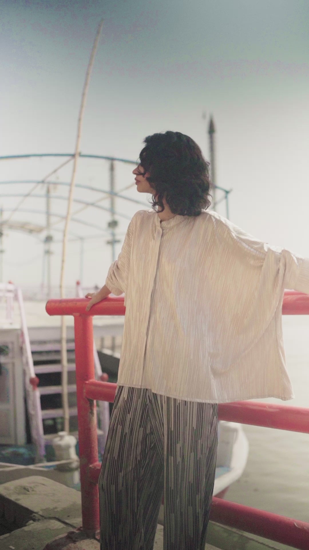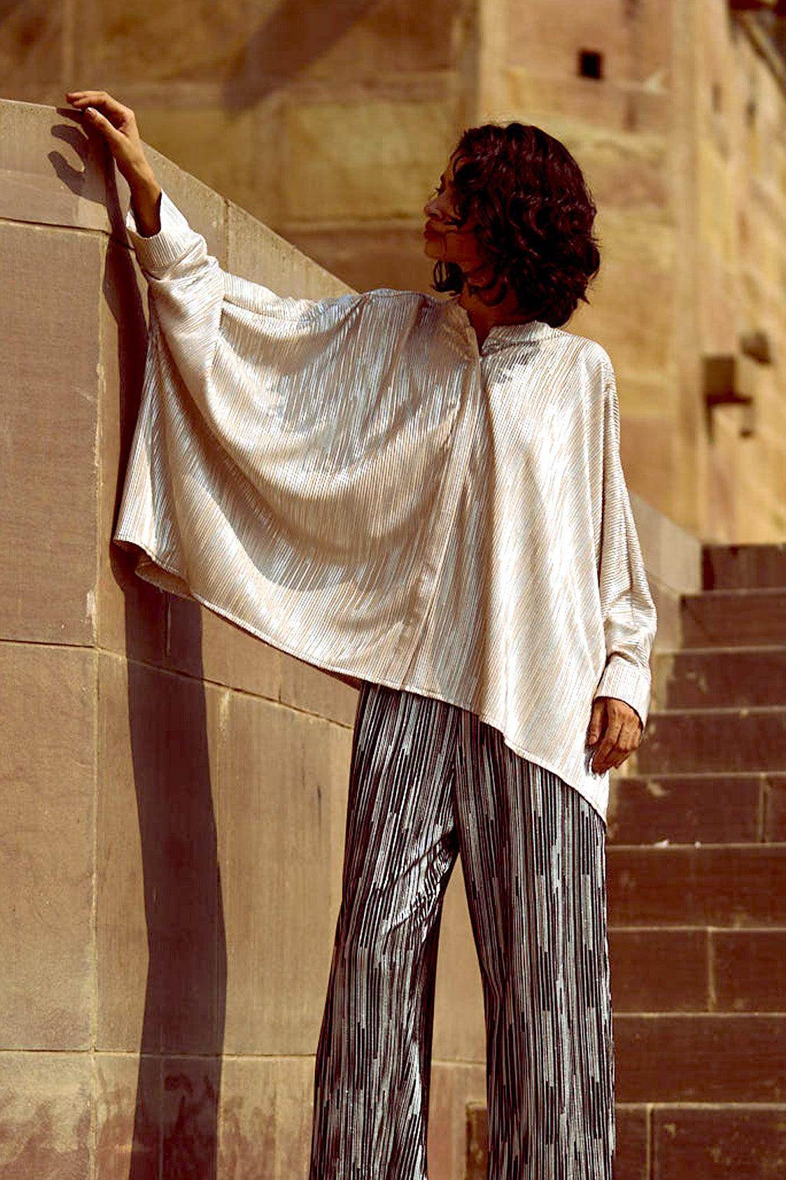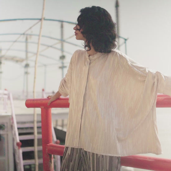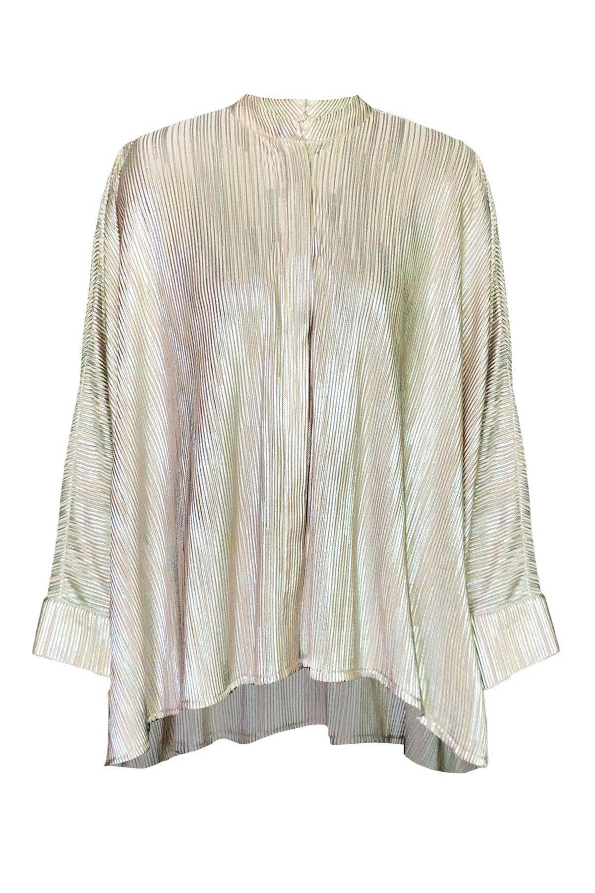 Ivory foil pleated boxy top with a band collar and snap button closure at the front. Horizontal pleating panels at the cuffs.