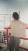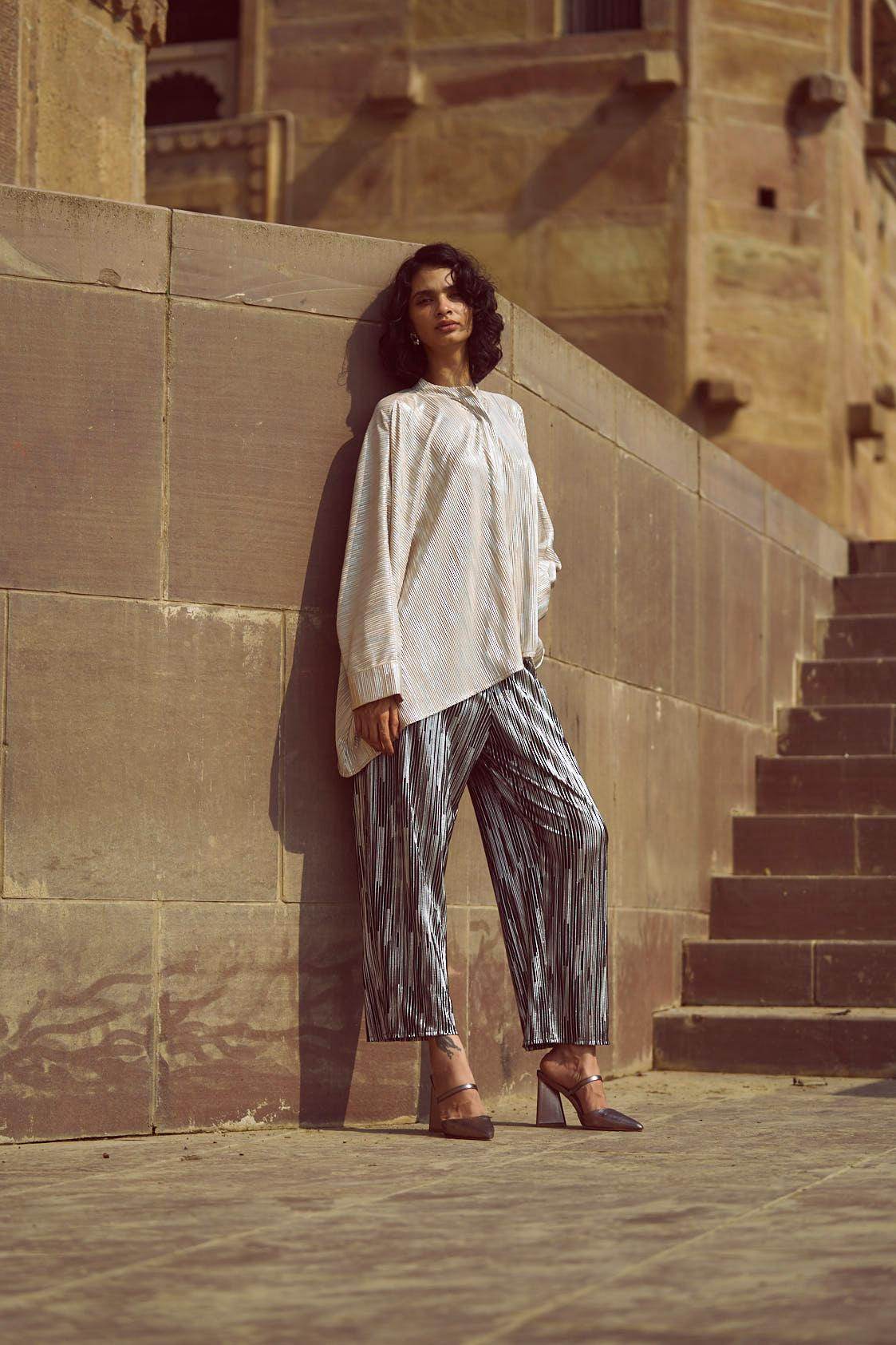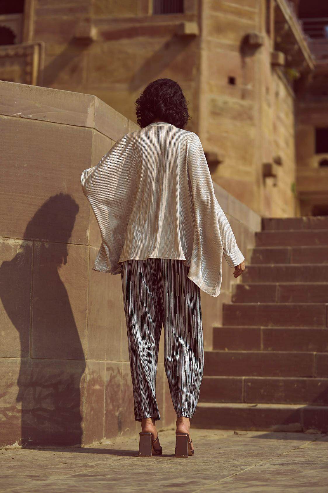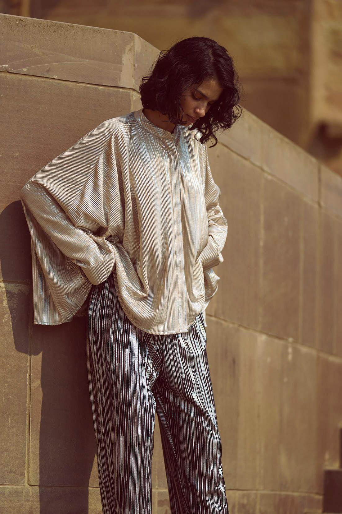 Ivory foil pleated boxy top with a band collar and snap button closure at the front. Horizontal pleating panels at the cuffs.
