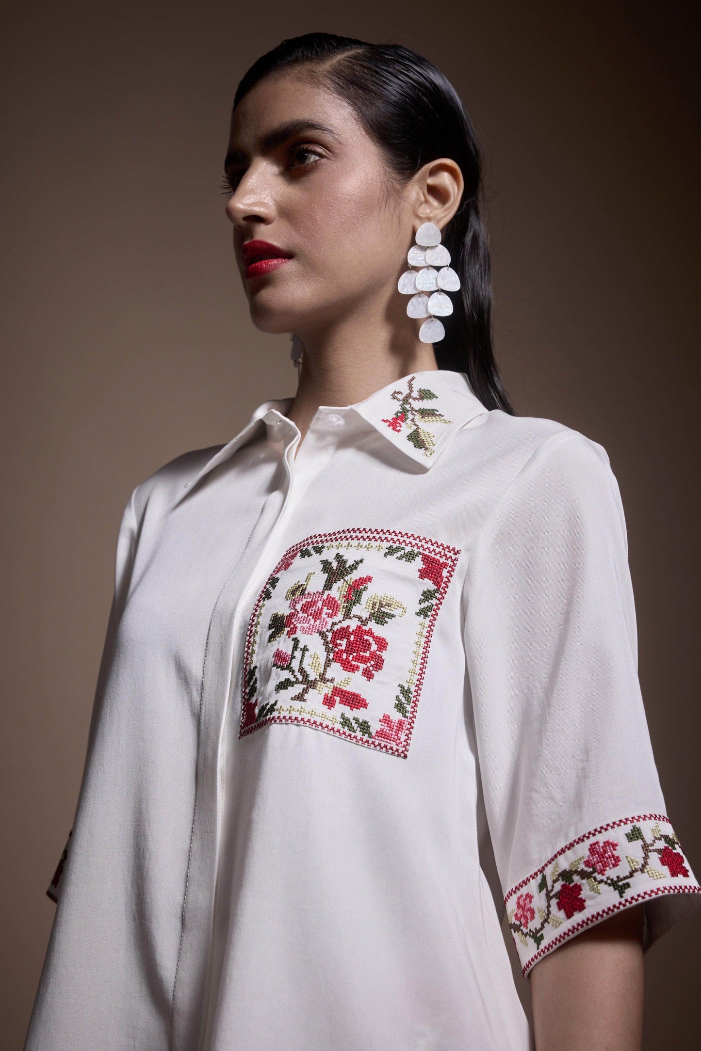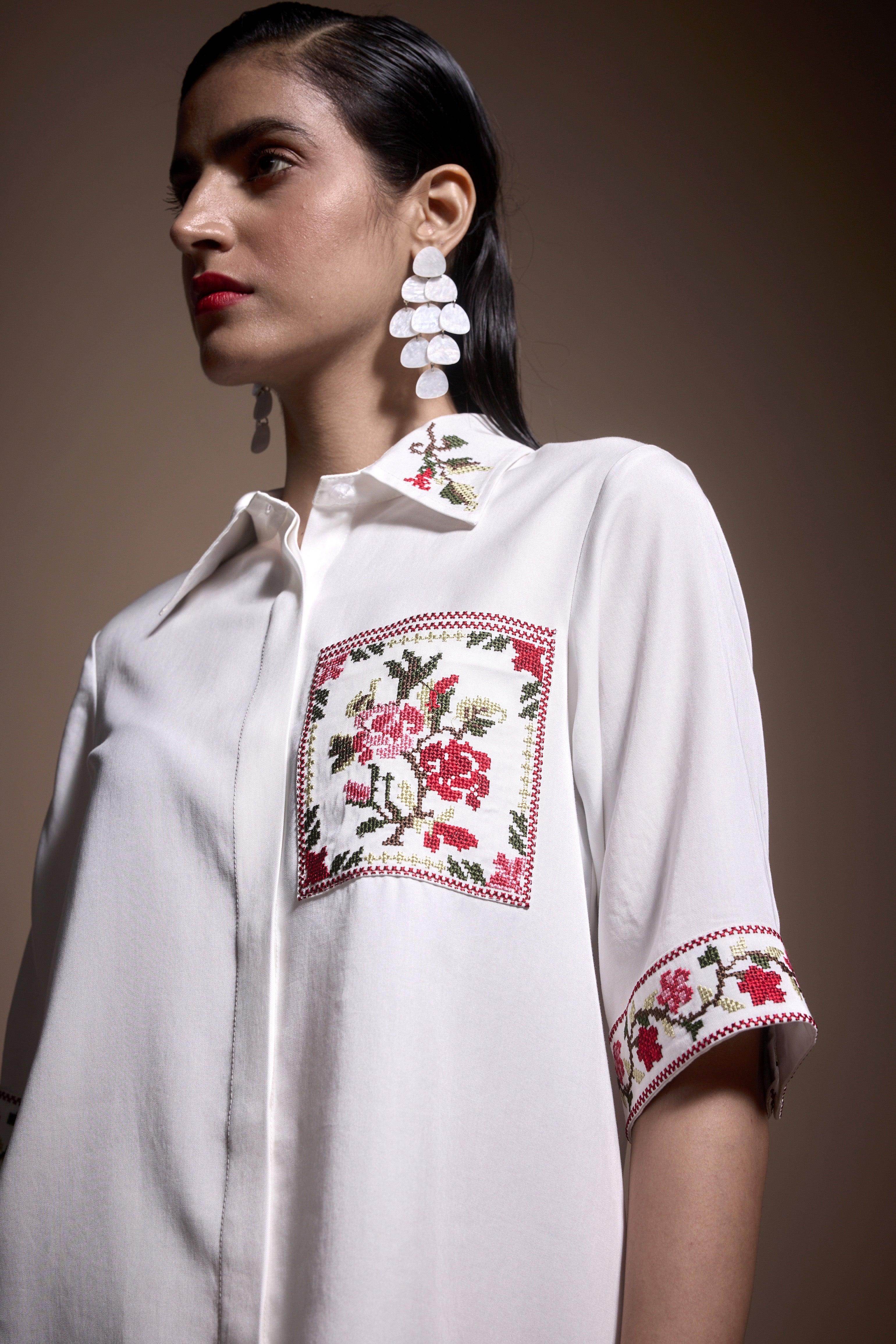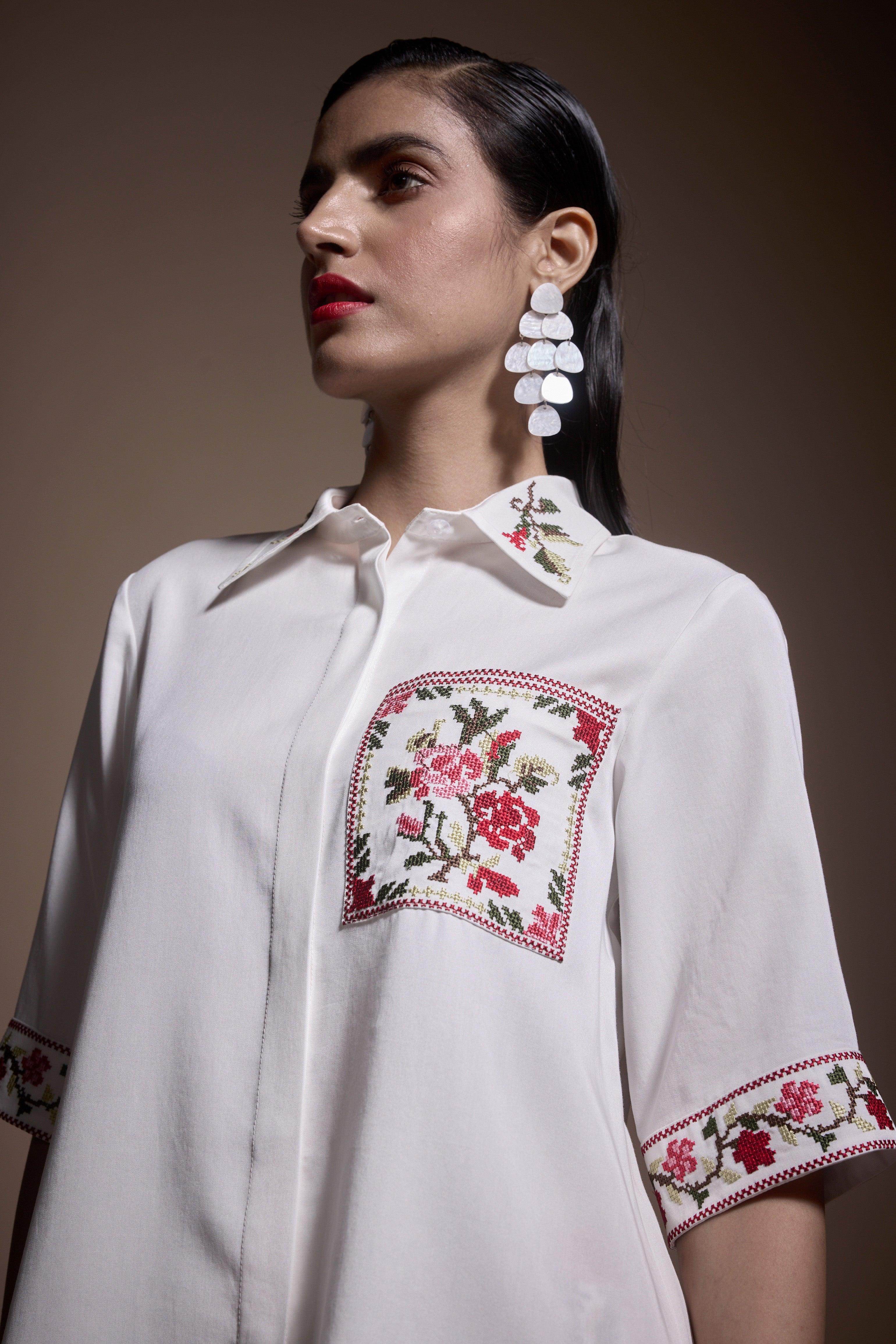 Ivory half-sleeve shirt with multicolor delicate cross-stitch embroidery on the patch pocket, cuffs, and collar. Features short sleeves, a concealed placket, and is made from sustainable, breathable Tencel.