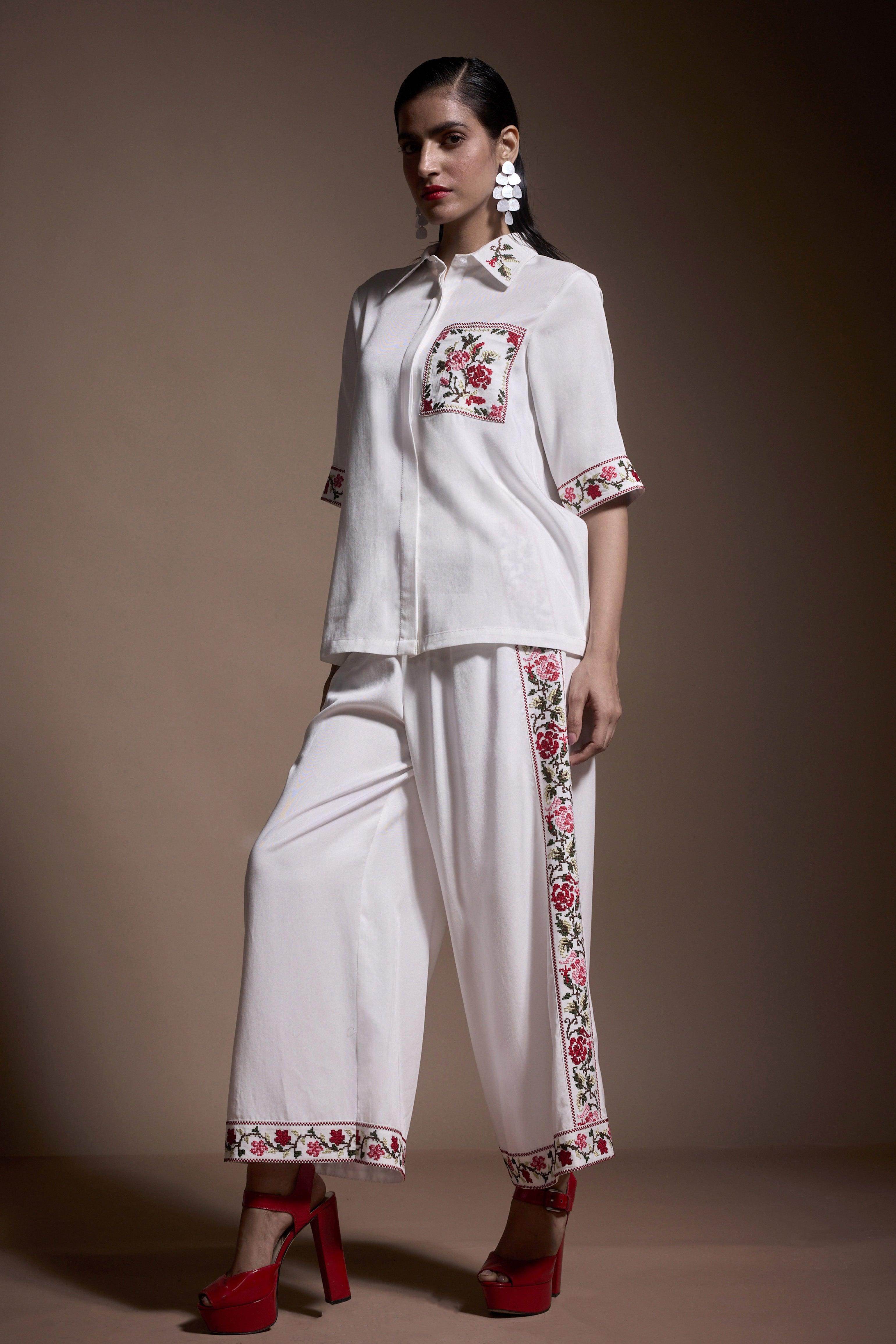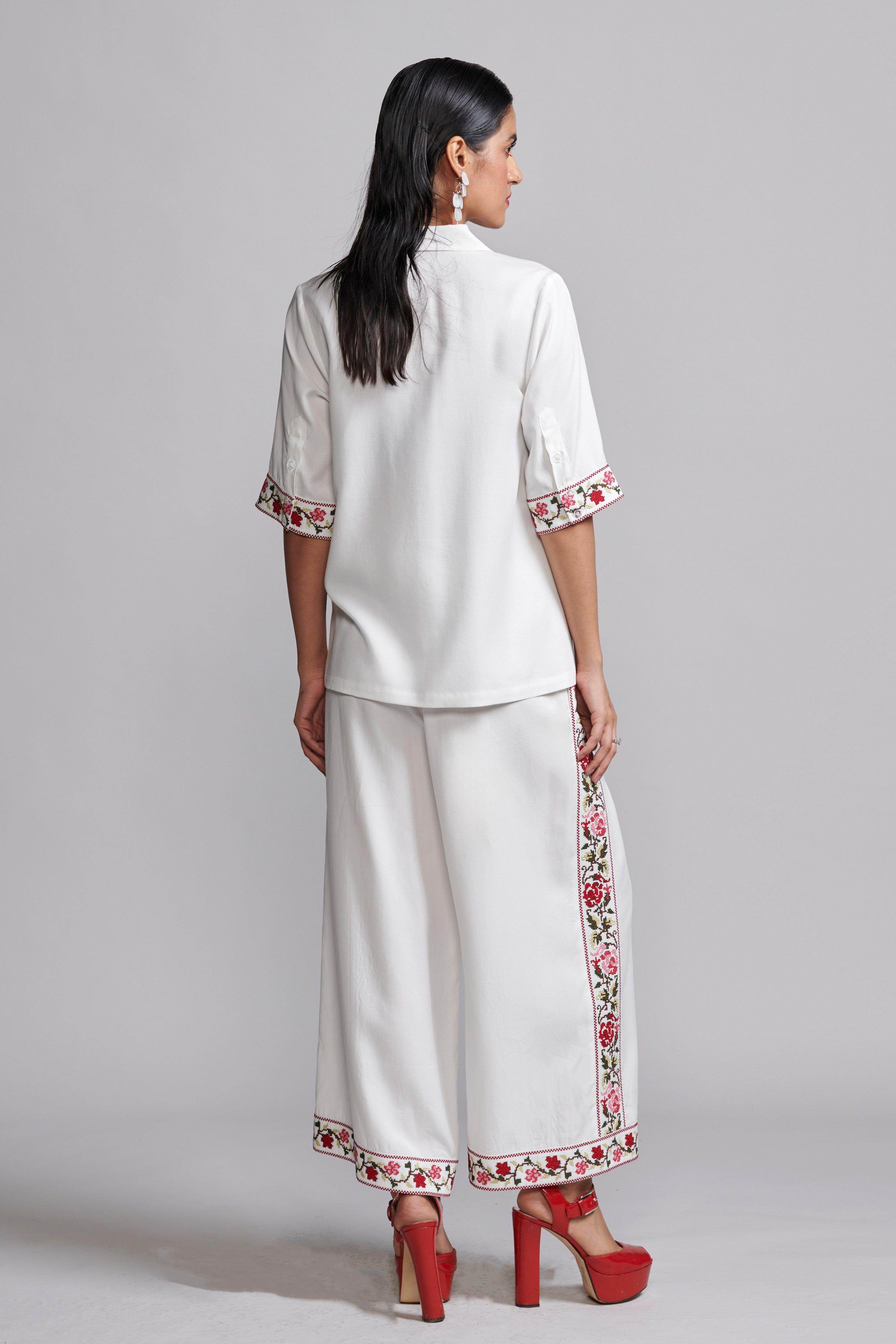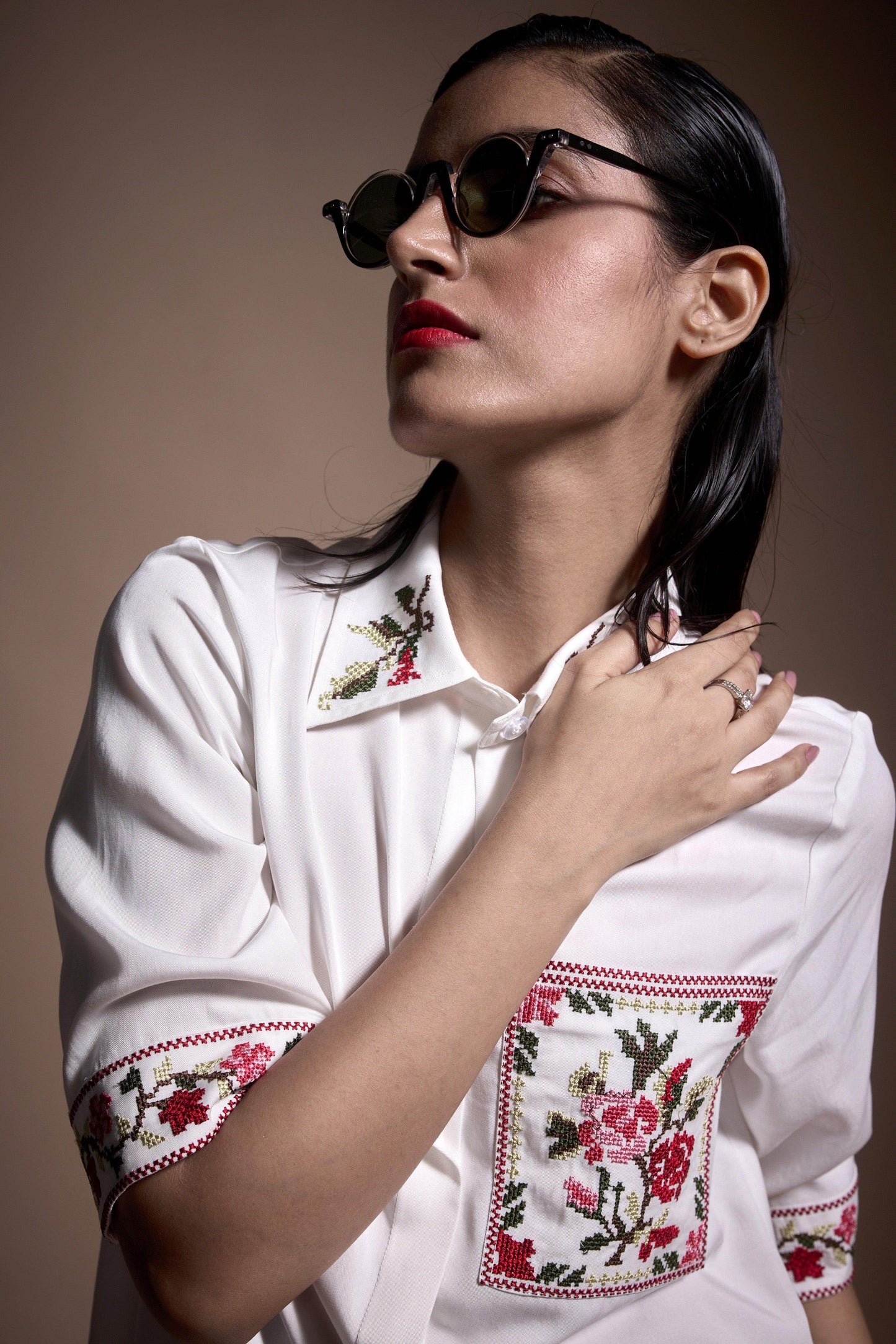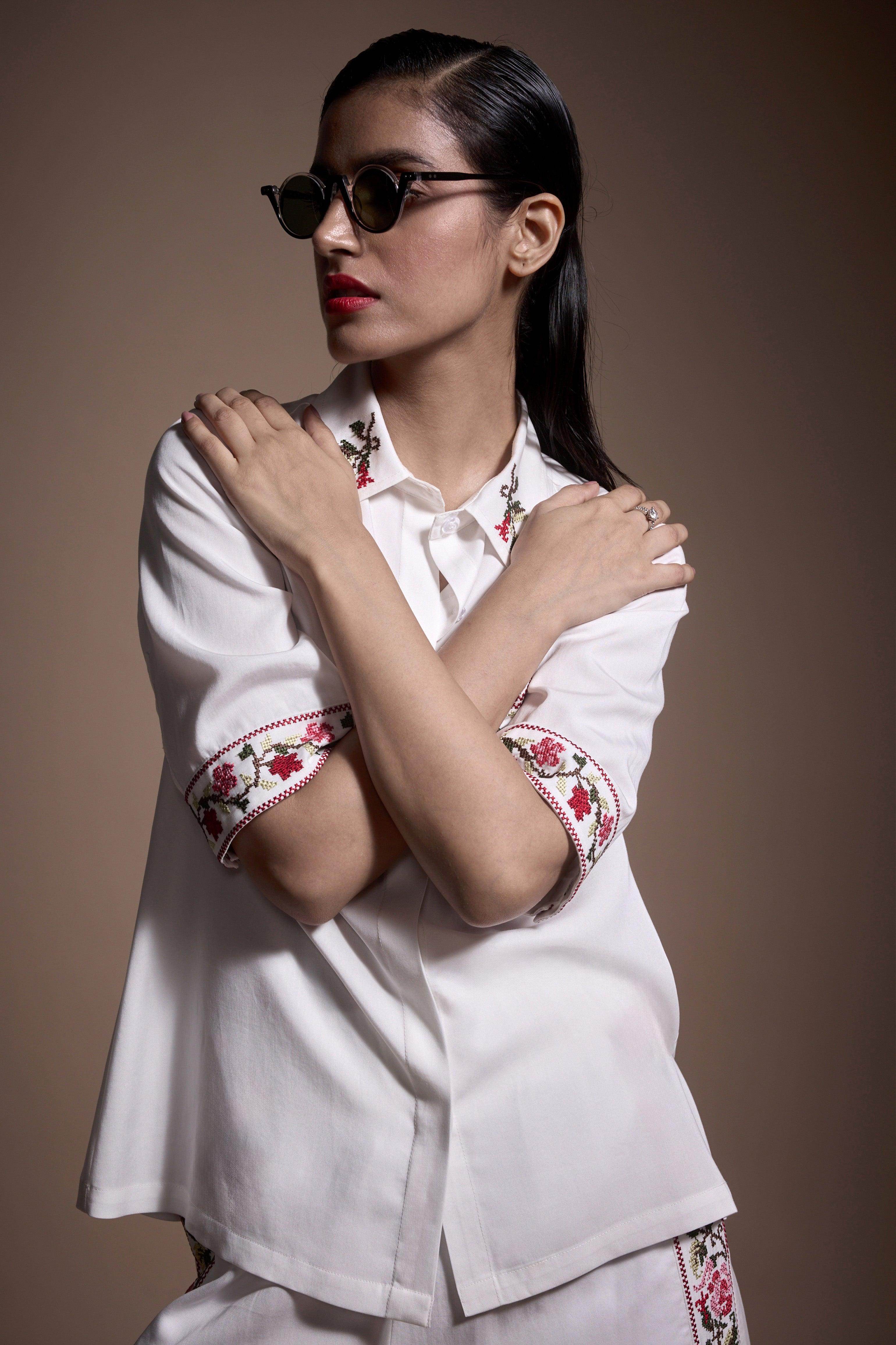 Ivory half-sleeve shirt with multicolor delicate cross-stitch embroidery on the patch pocket, cuffs, and collar. Features short sleeves, a concealed placket, and is made from sustainable, breathable Tencel.