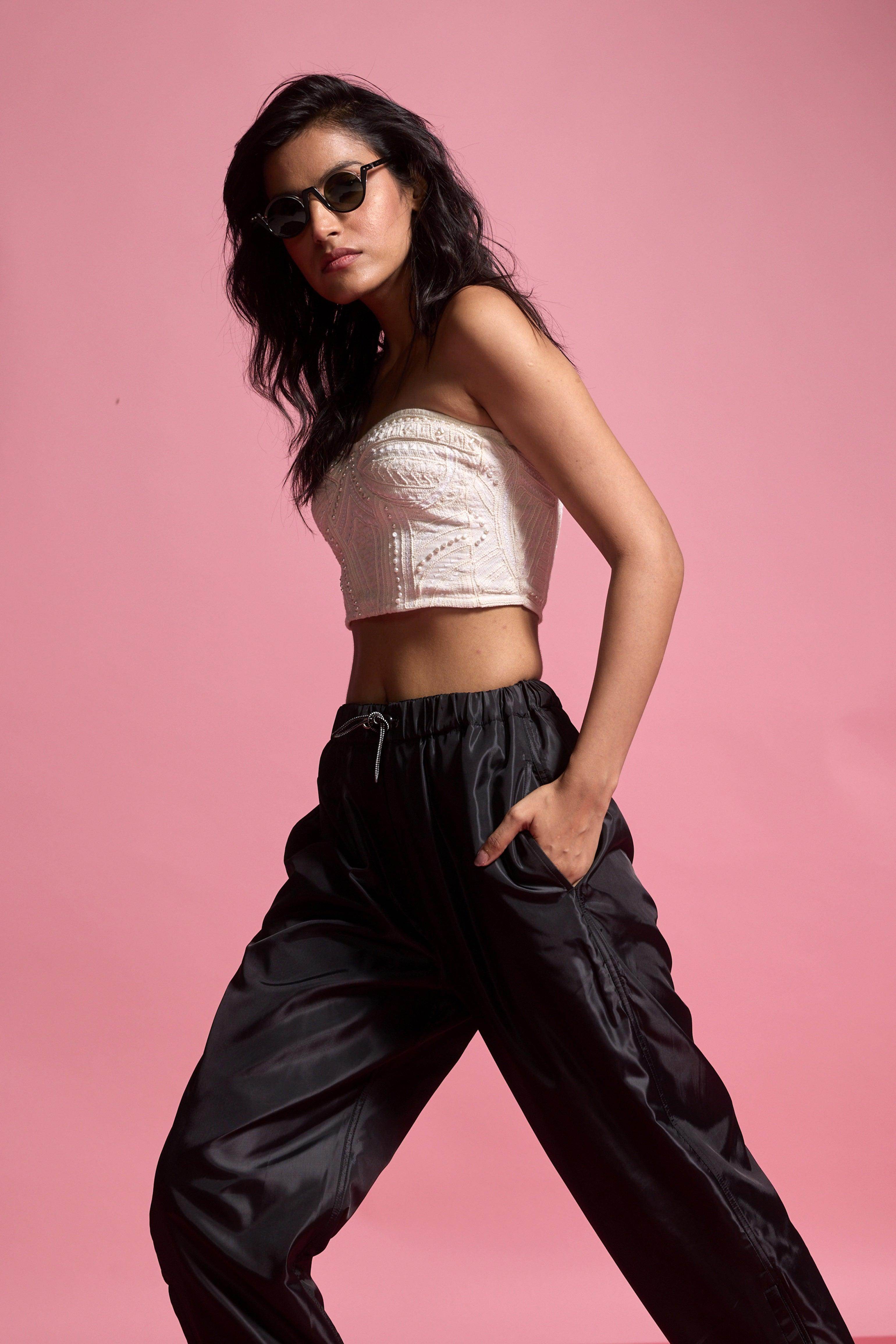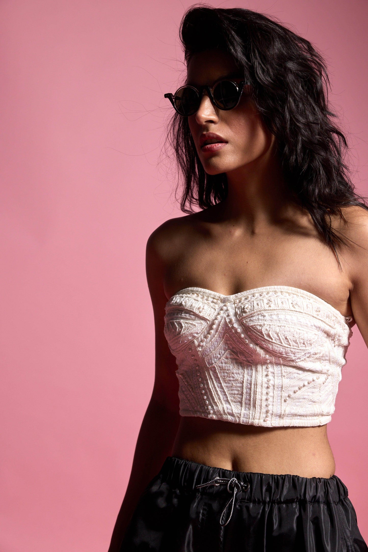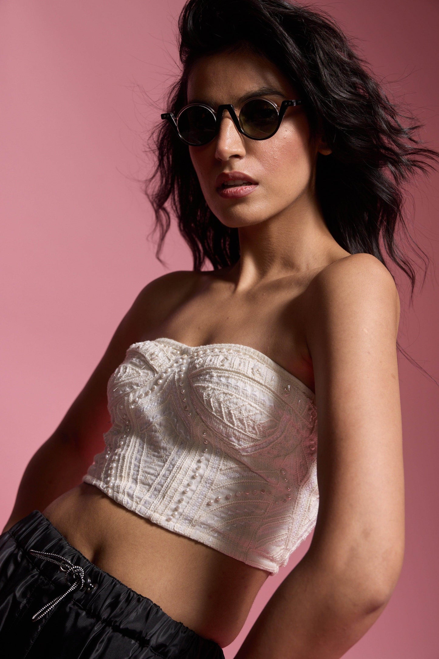 Tonal ivory bustier bralette, fully embroidered with thread and hand-applied pearl beads. Corset-inspired shape with smocked back for a comfortable fit. Fully lined. Detachable, adjustable straps included.