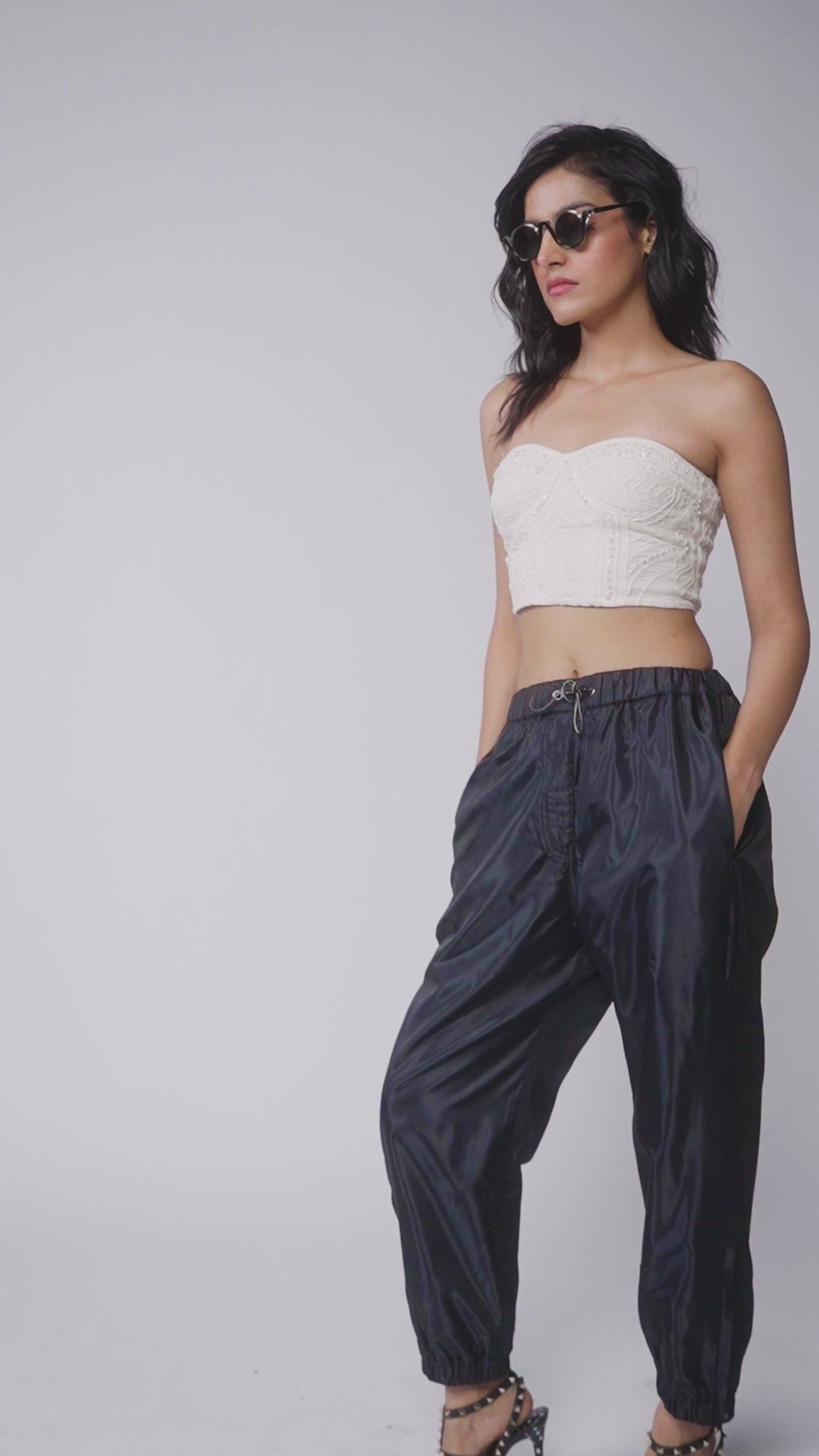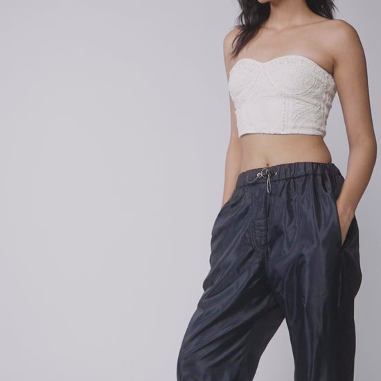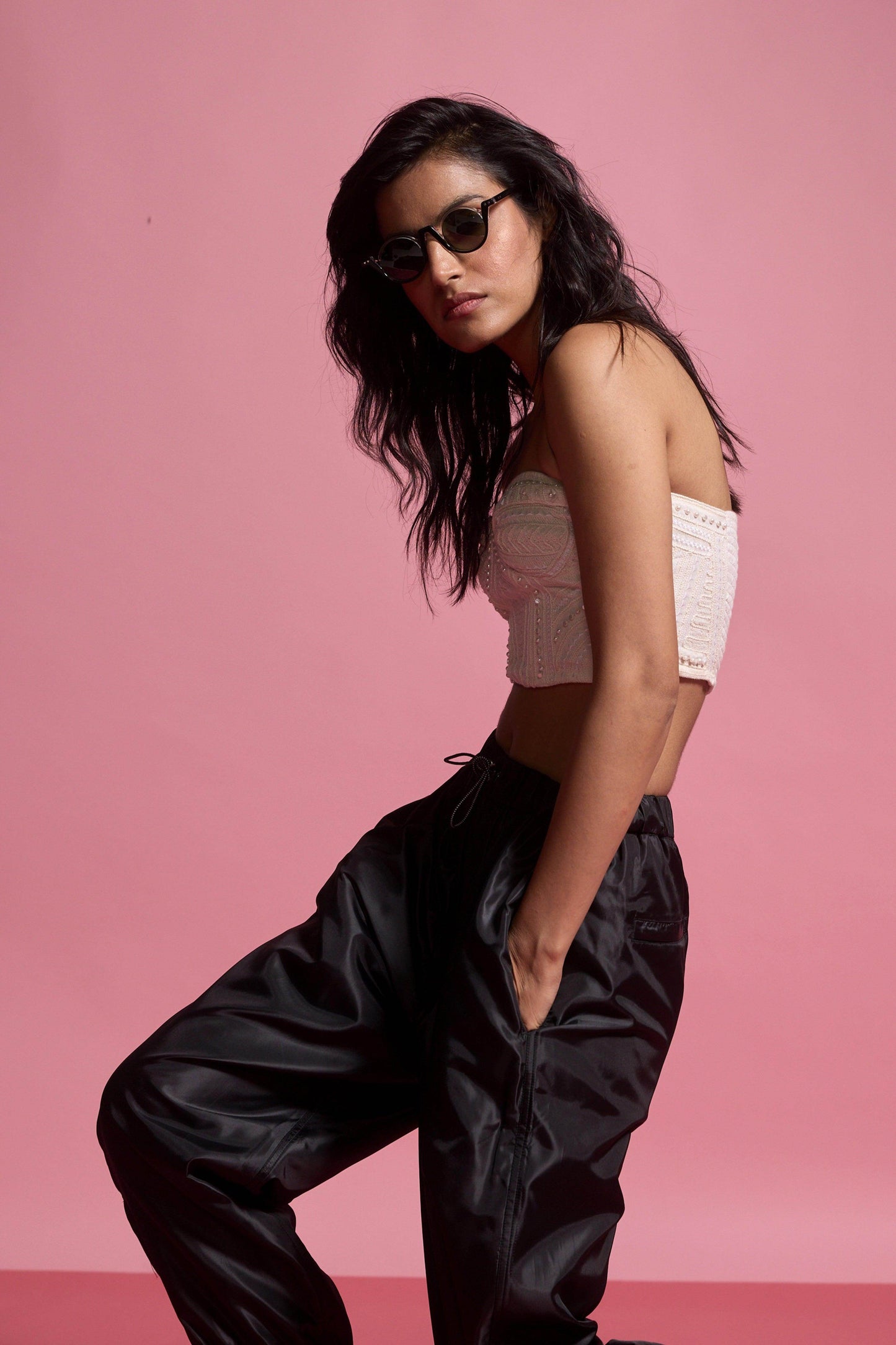 Tonal ivory bustier bralette, fully embroidered with thread and hand-applied pearl beads. Corset-inspired shape with smocked back for a comfortable fit. Fully lined. Detachable, adjustable straps included.