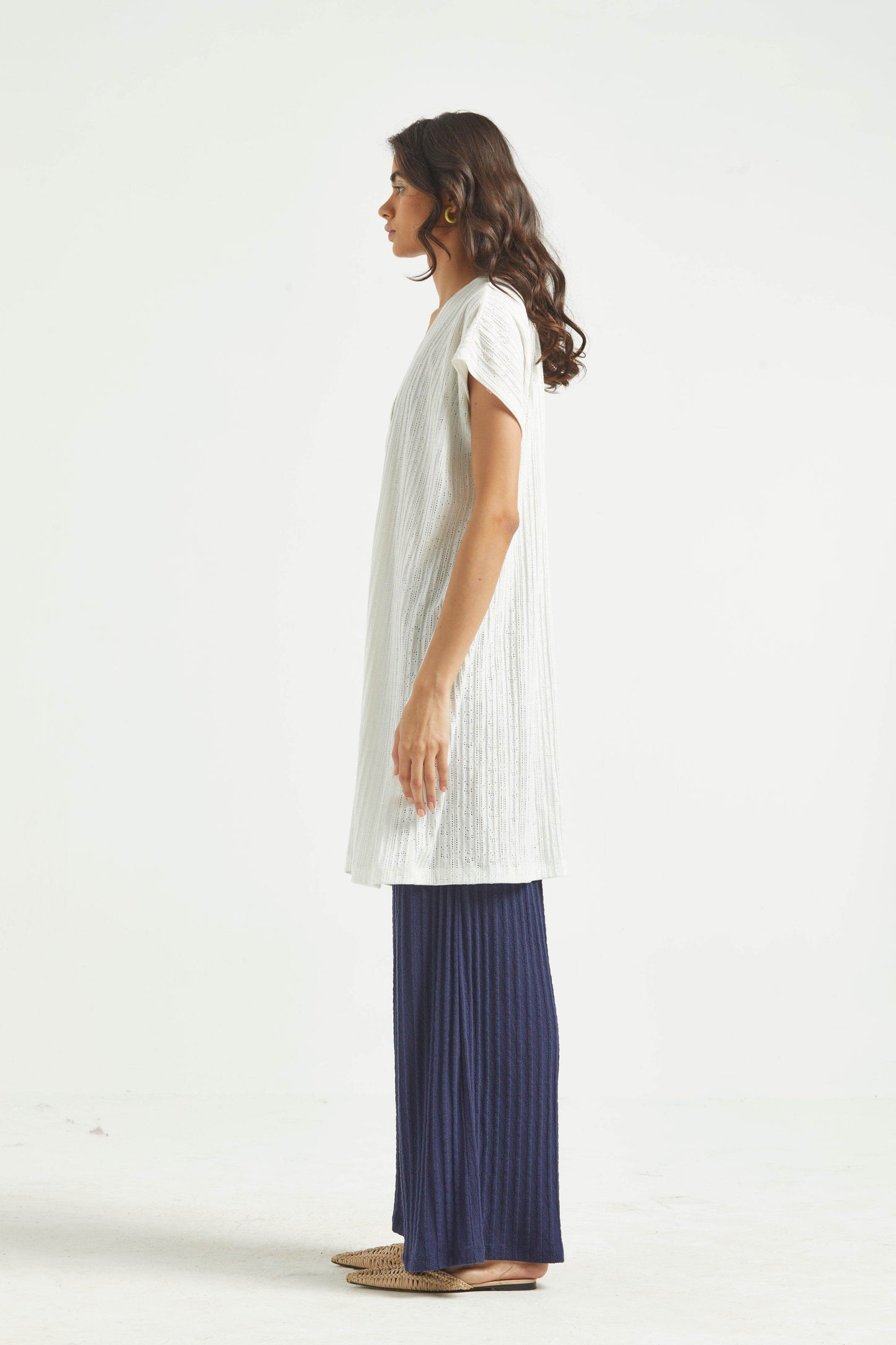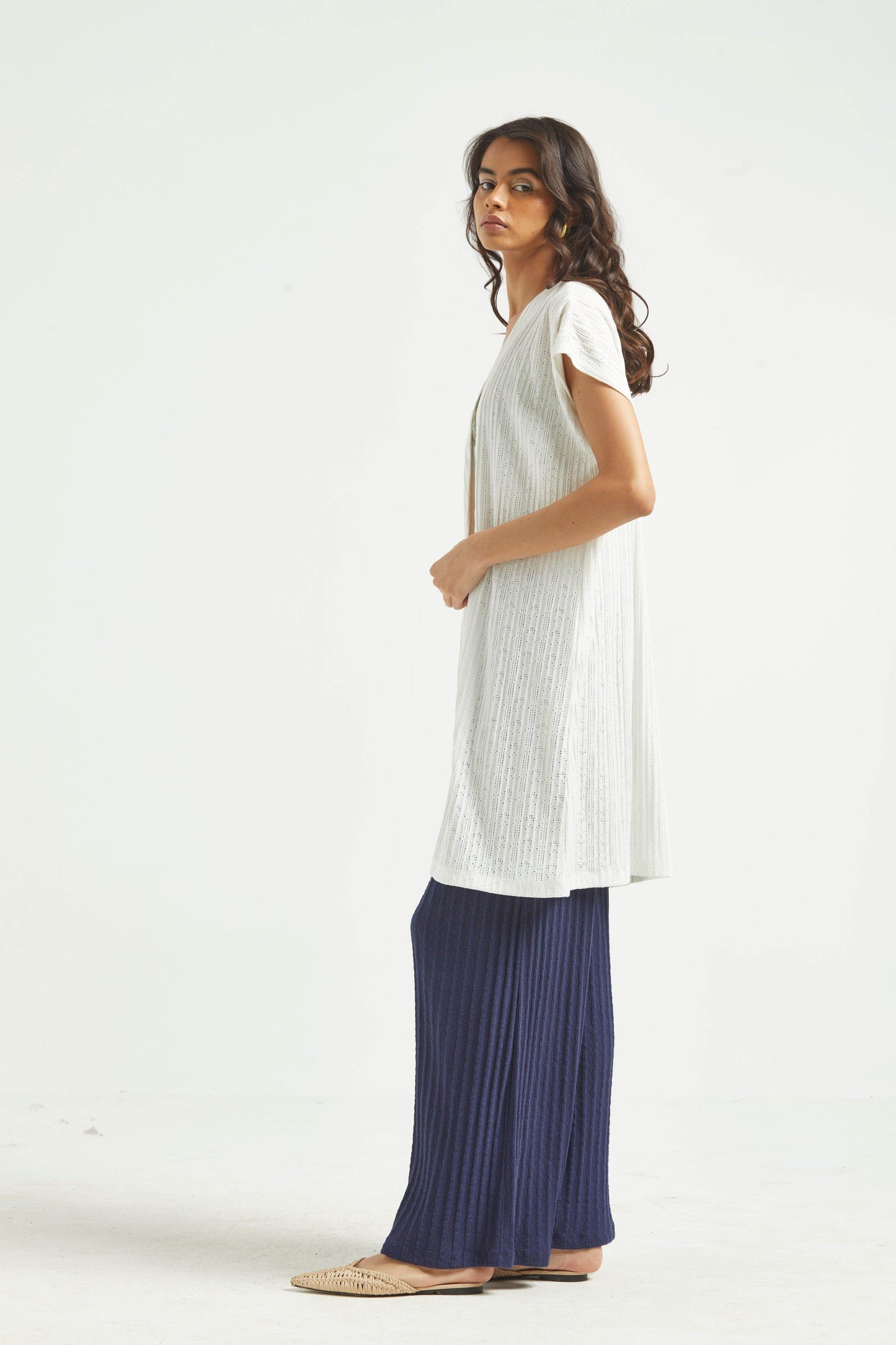 3 piece colour-blocked set in pointelle knitted fabric. Blue wide-legged, high-waist knit pants. White drop-shoulder longline patterned sleeveless cardigan. Military triangular bralette with adjustable straps and sift smocking in the back.
