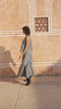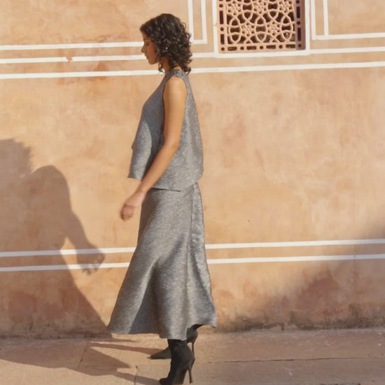Architectural asymmetric top in a foiled pleated fabric. Round neckline, asymmetric shoulders and slanting hem. Raw edge detailing. Paired with a matching architectural, wrap asymmetric skirt. A-line silhouette with a front overlap detail. Hook/eye and zip closure in the side. High/low hem.