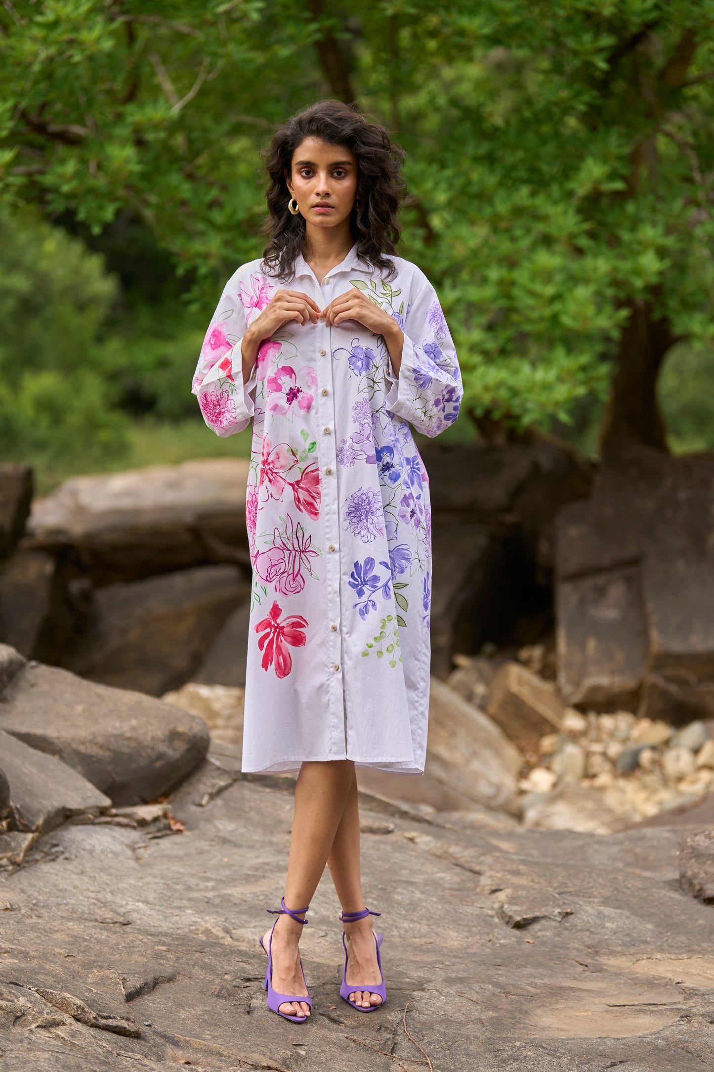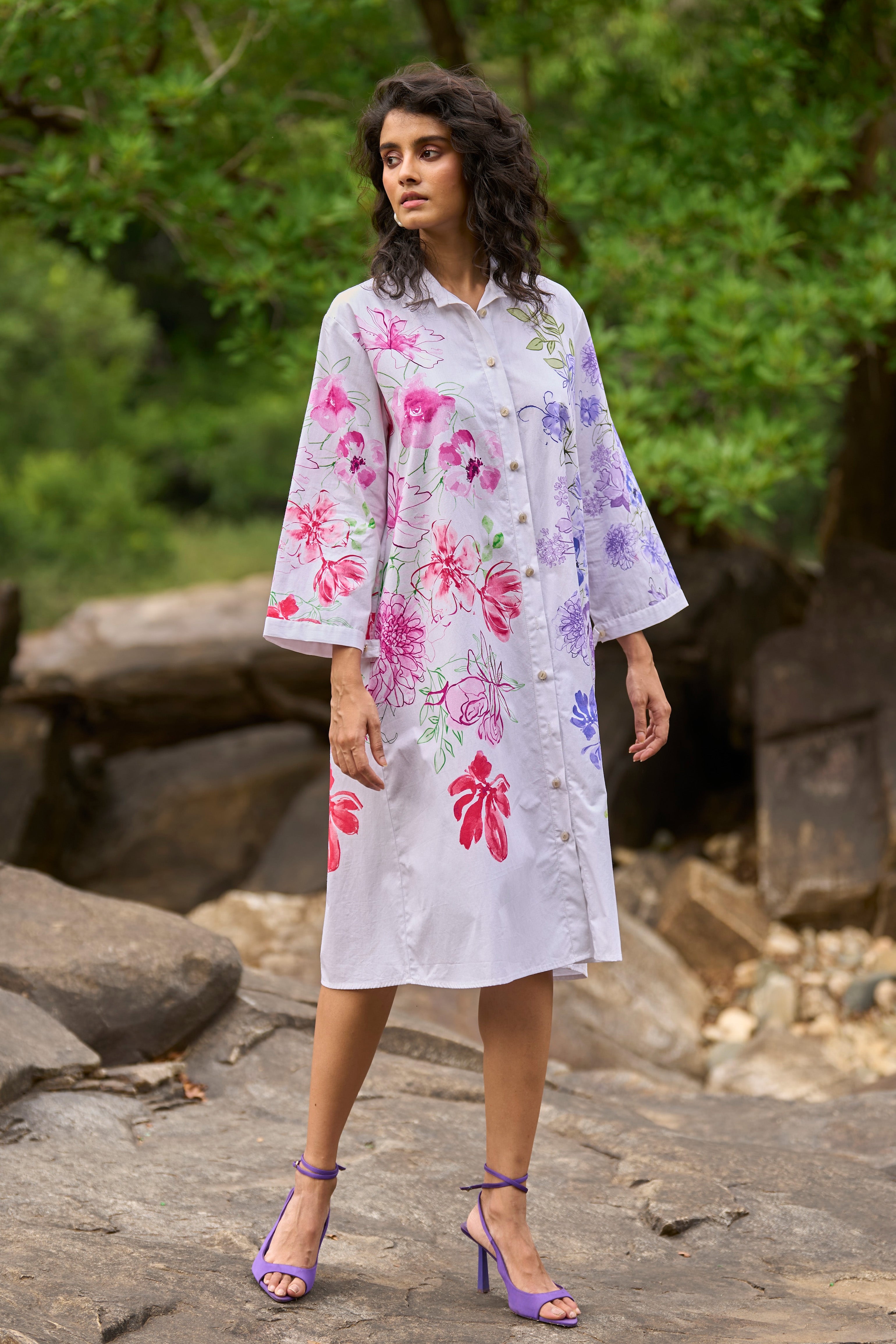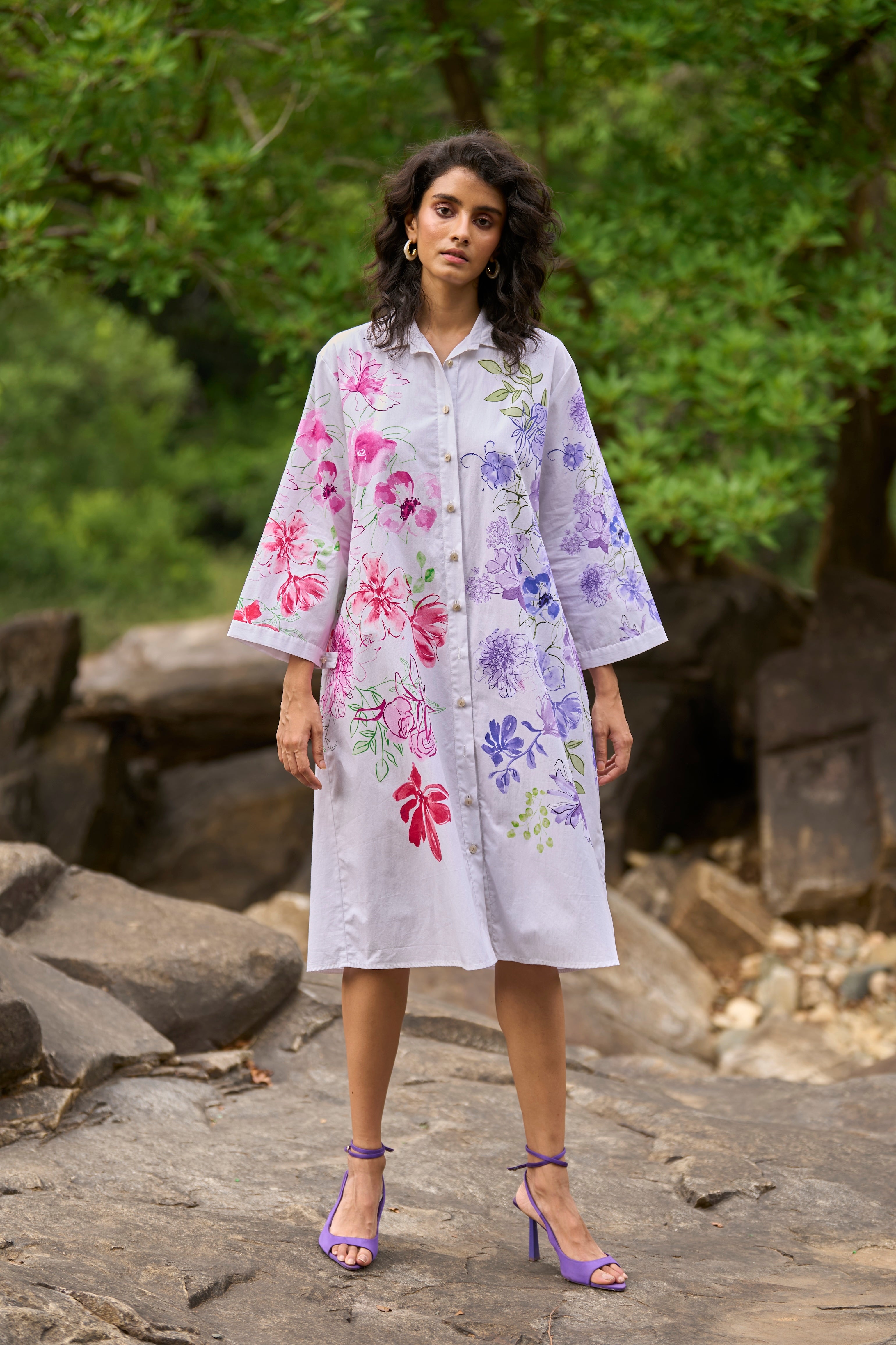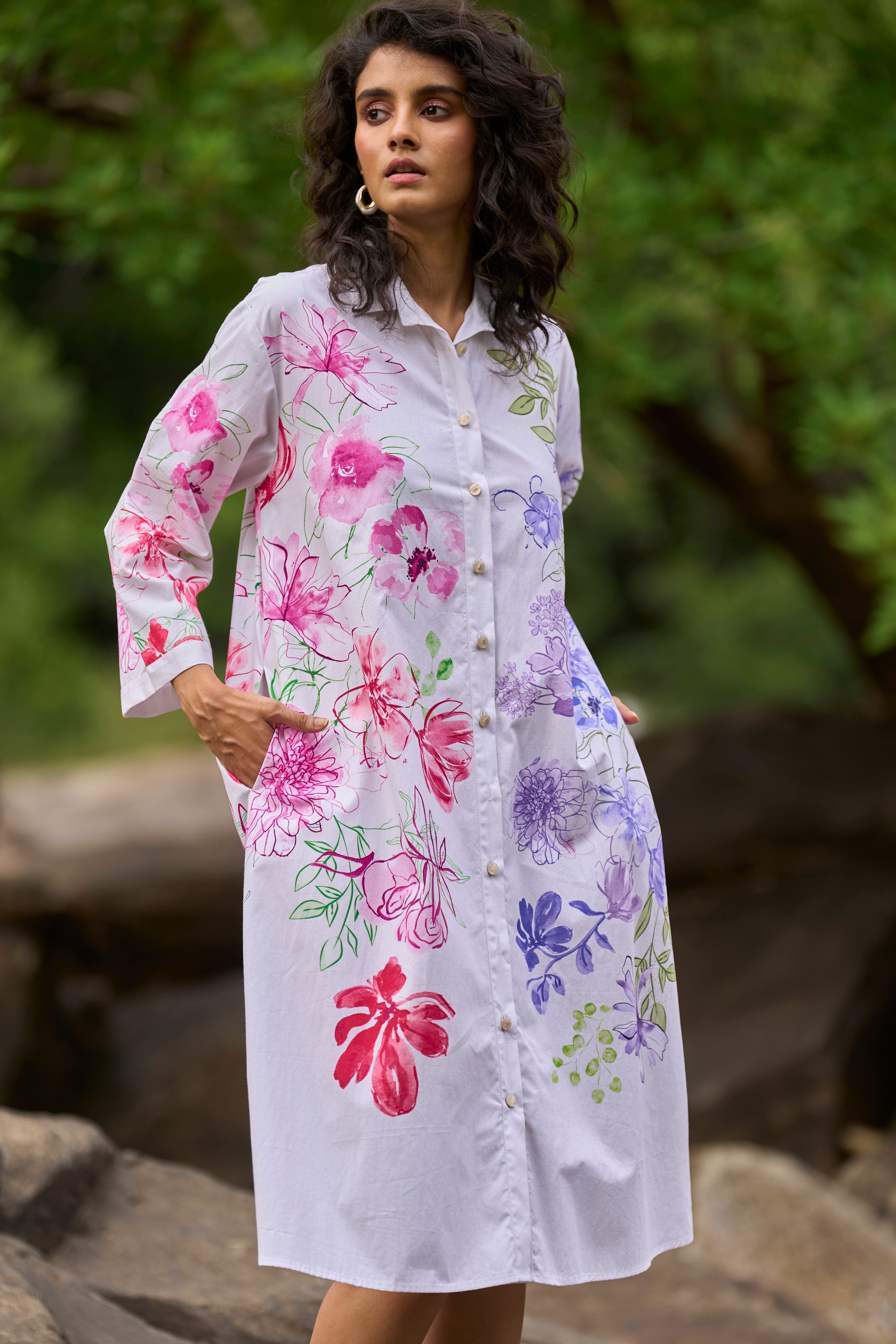 Asymmetric hand painted floral print on an organic cotton base. Front button down shirt dress. Relaxed fit. Cropped sleeves. Pockets in the sides.