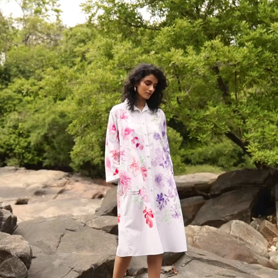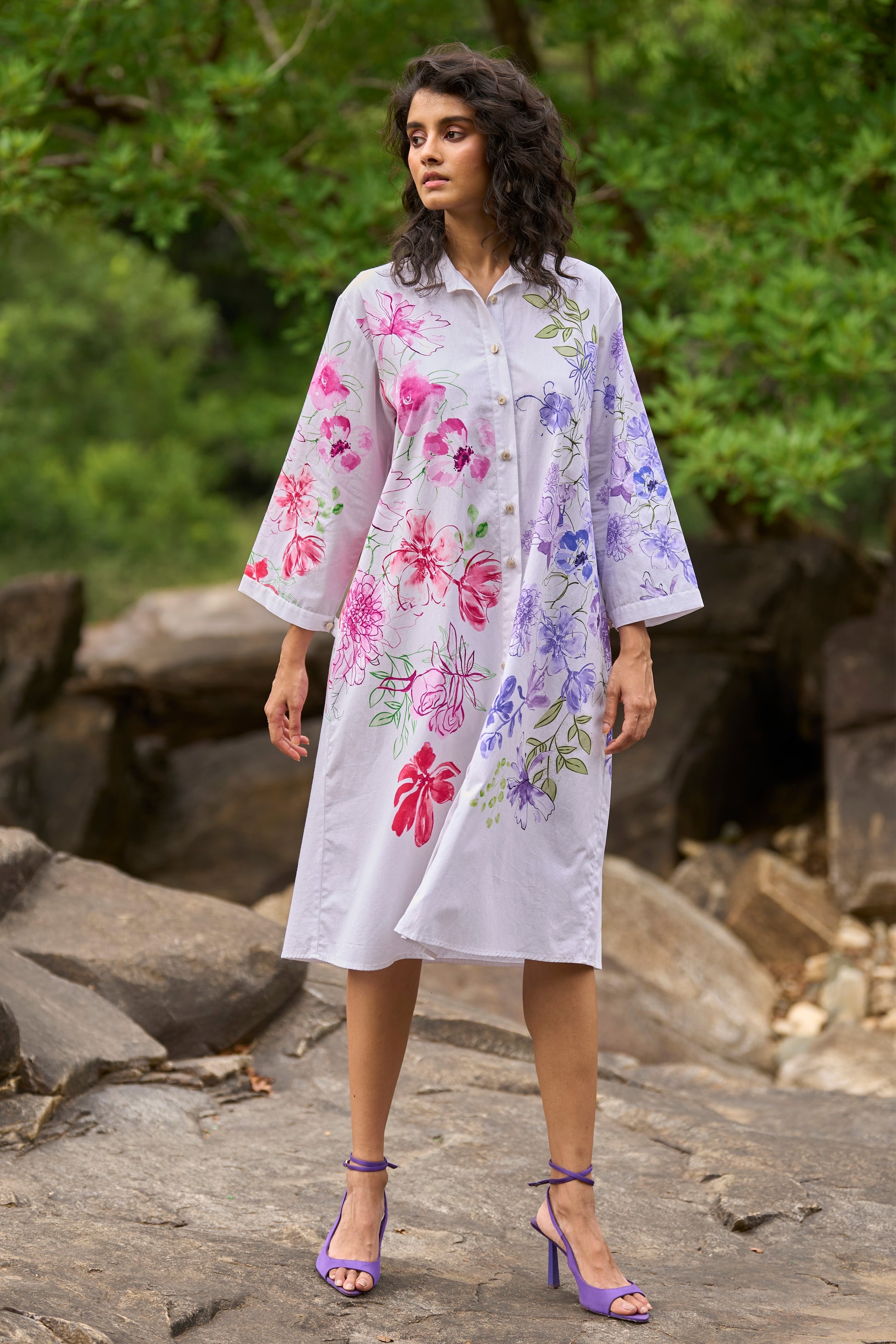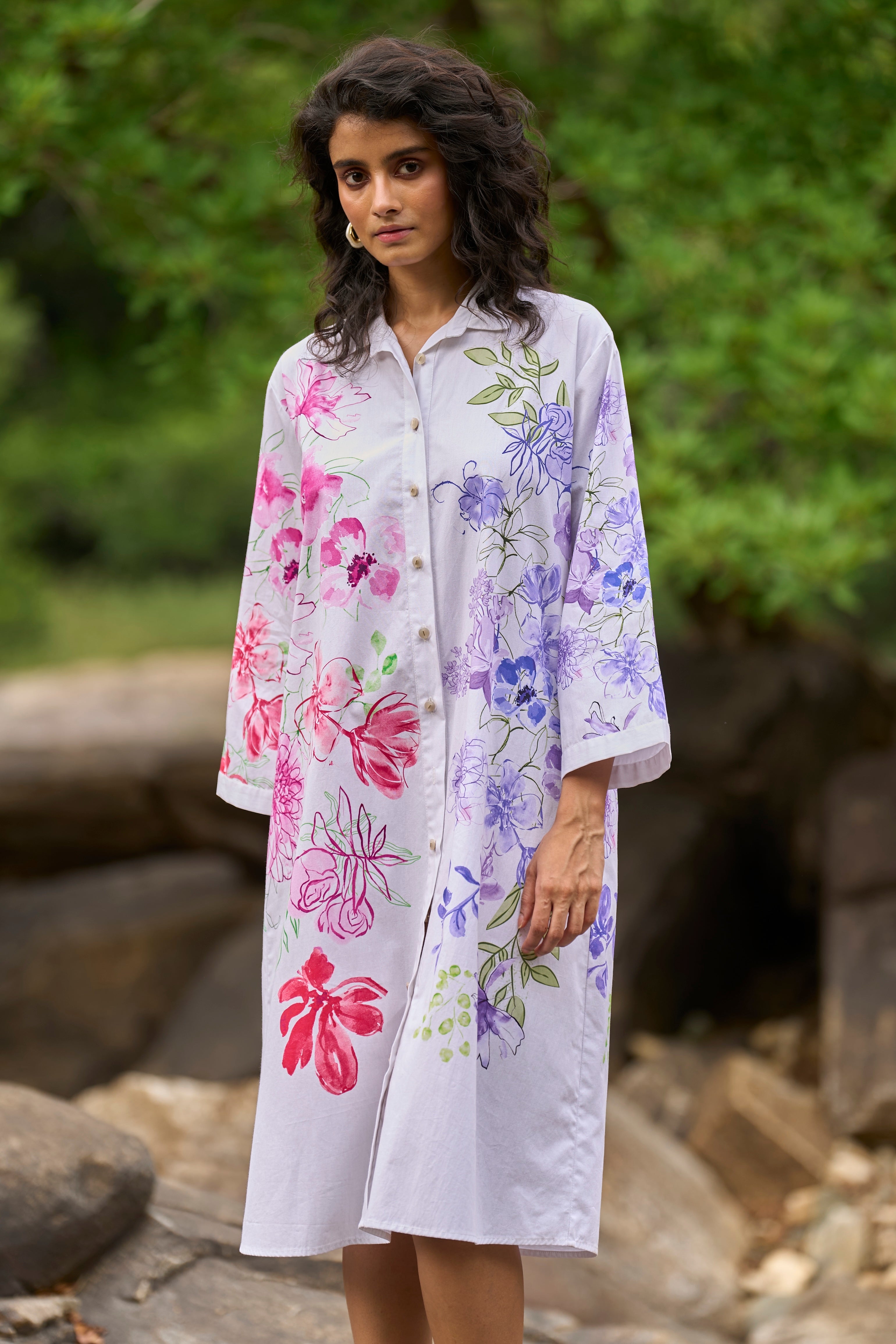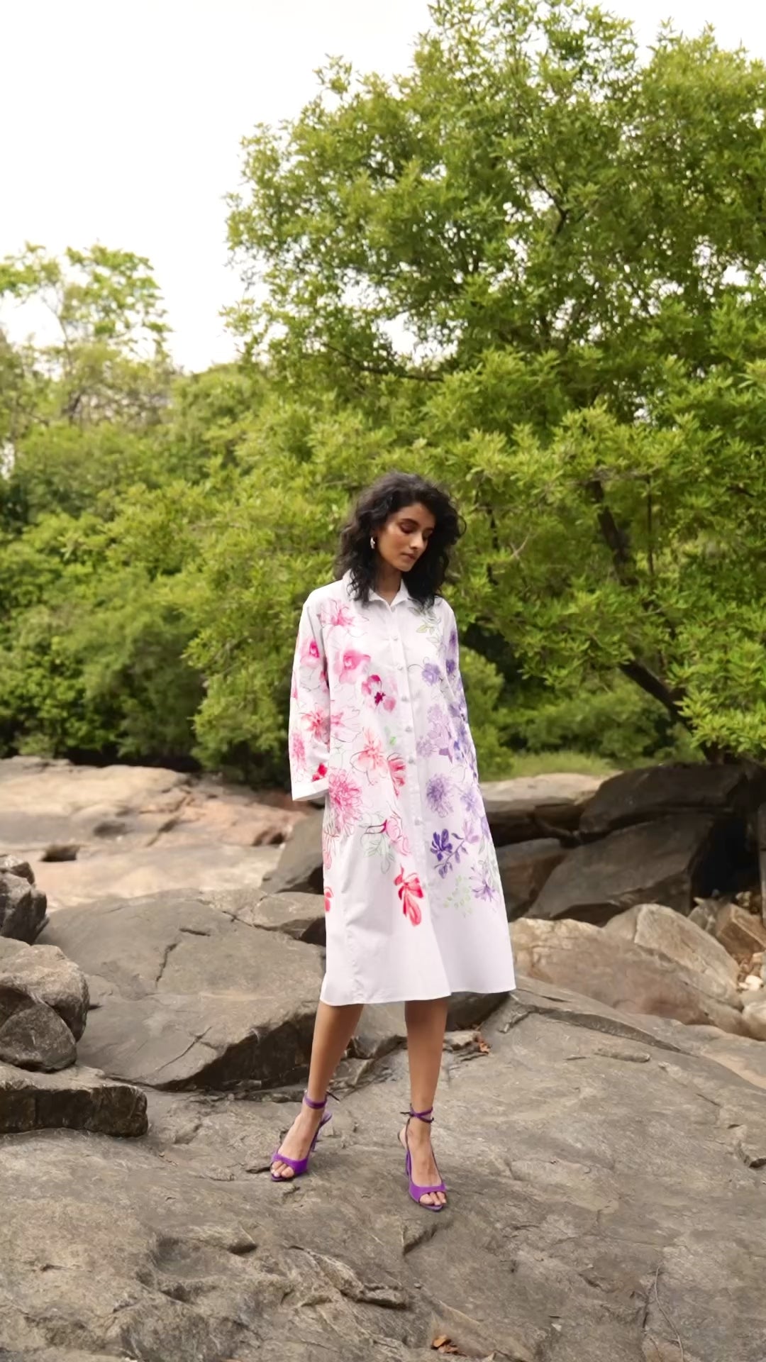 Asymmetric hand painted floral print on an organic cotton base. Front button down shirt dress. Relaxed fit. Cropped sleeves. Pockets in the sides.