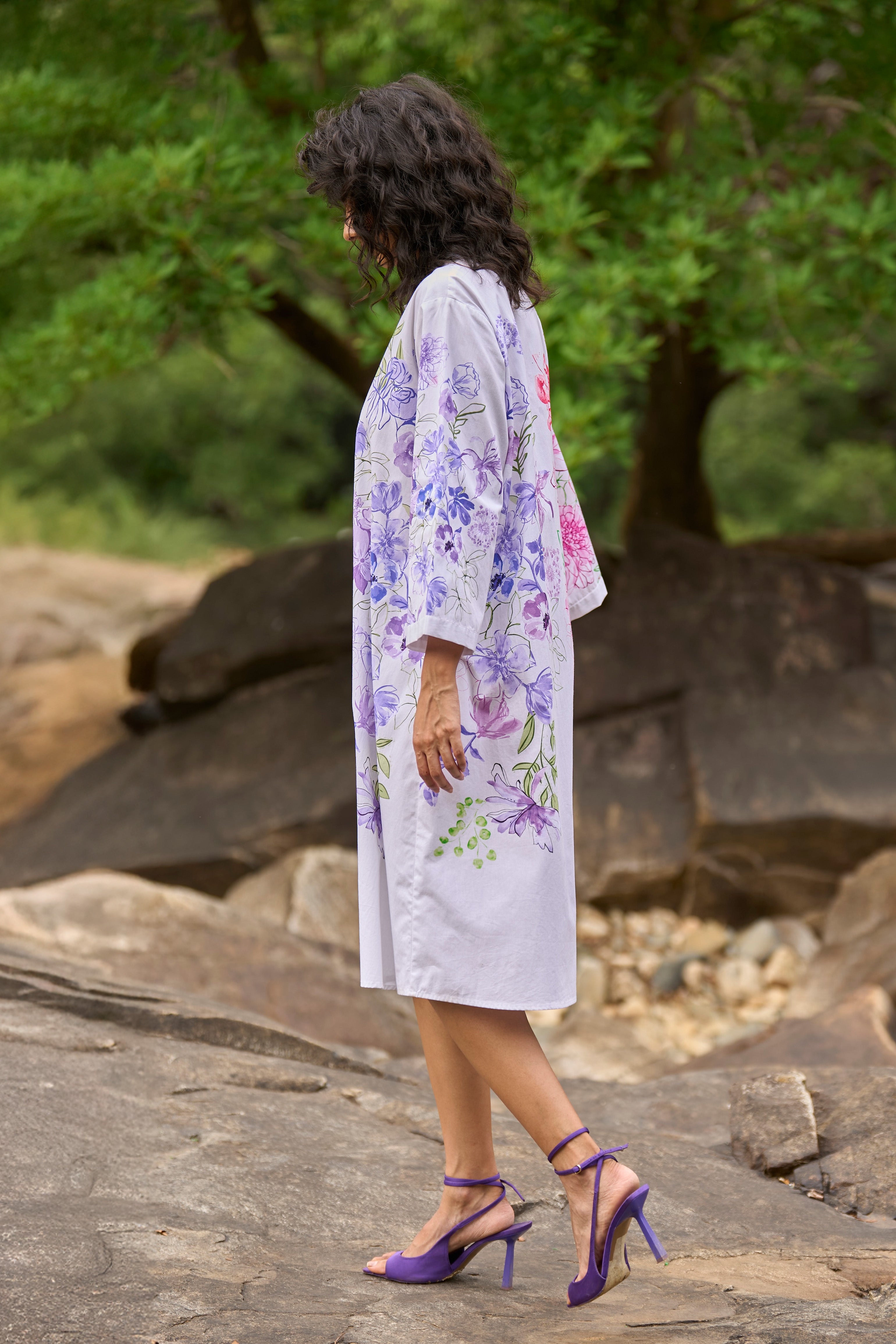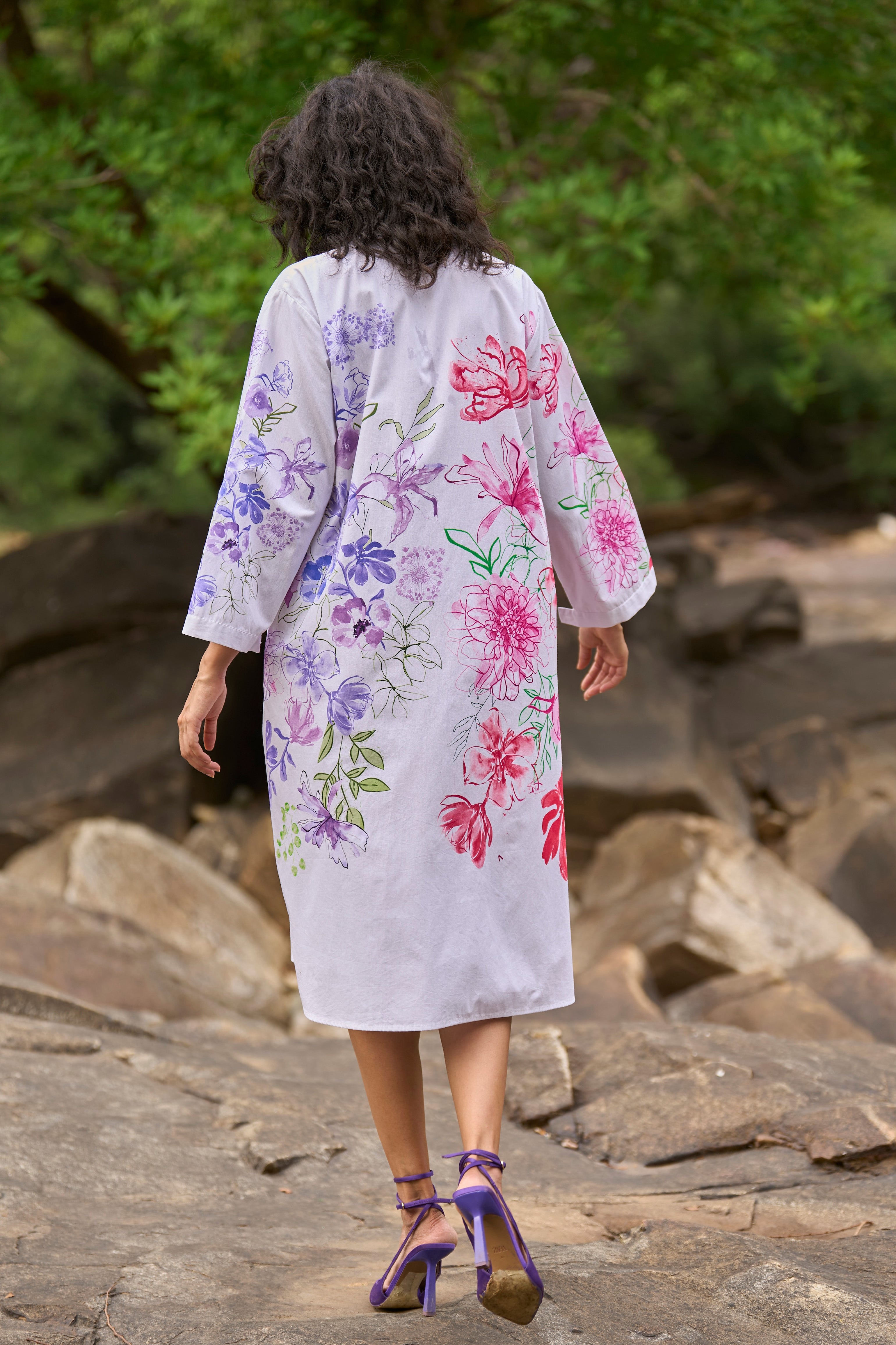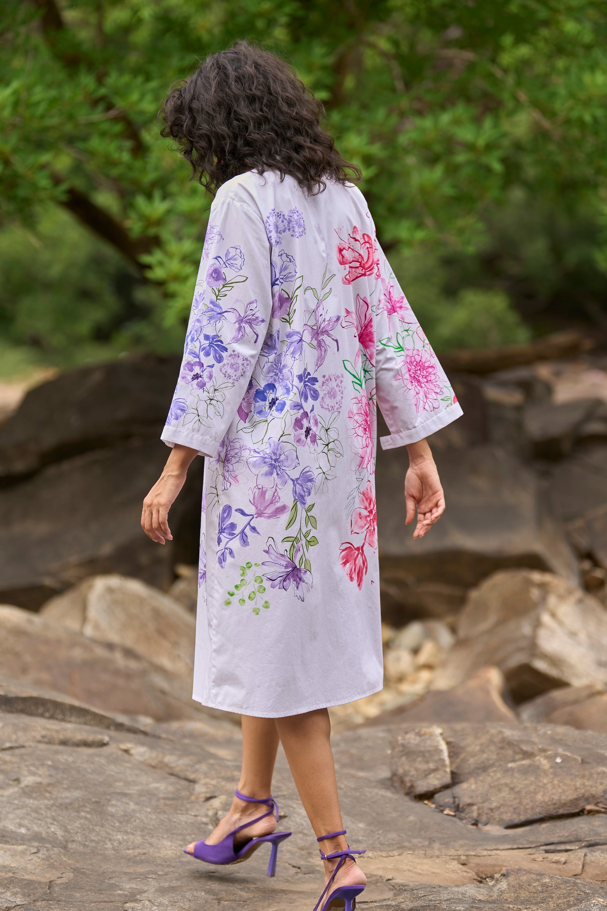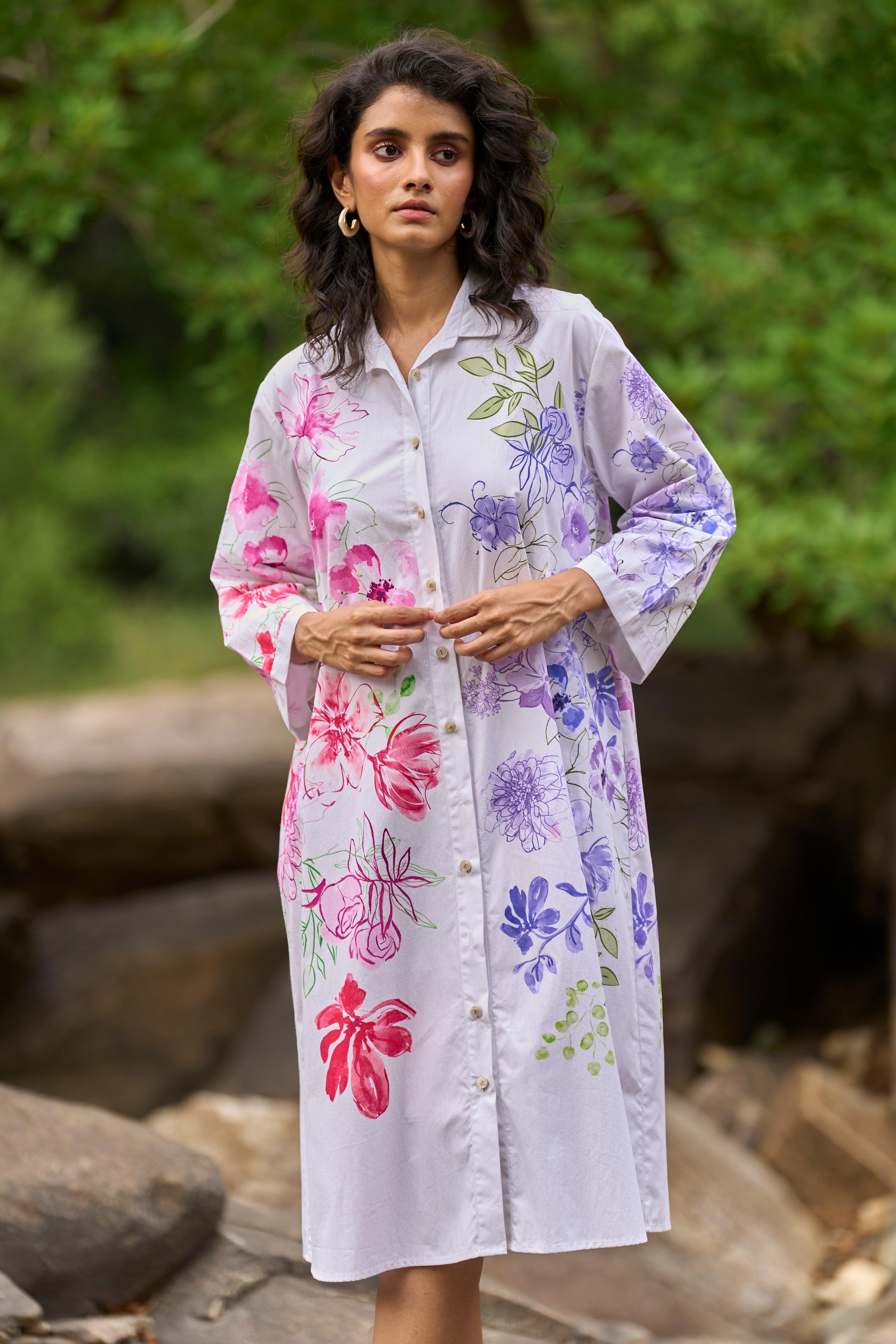 Asymmetric hand painted floral print on an organic cotton base. Front button down shirt dress. Relaxed fit. Cropped sleeves. Pockets in the sides.