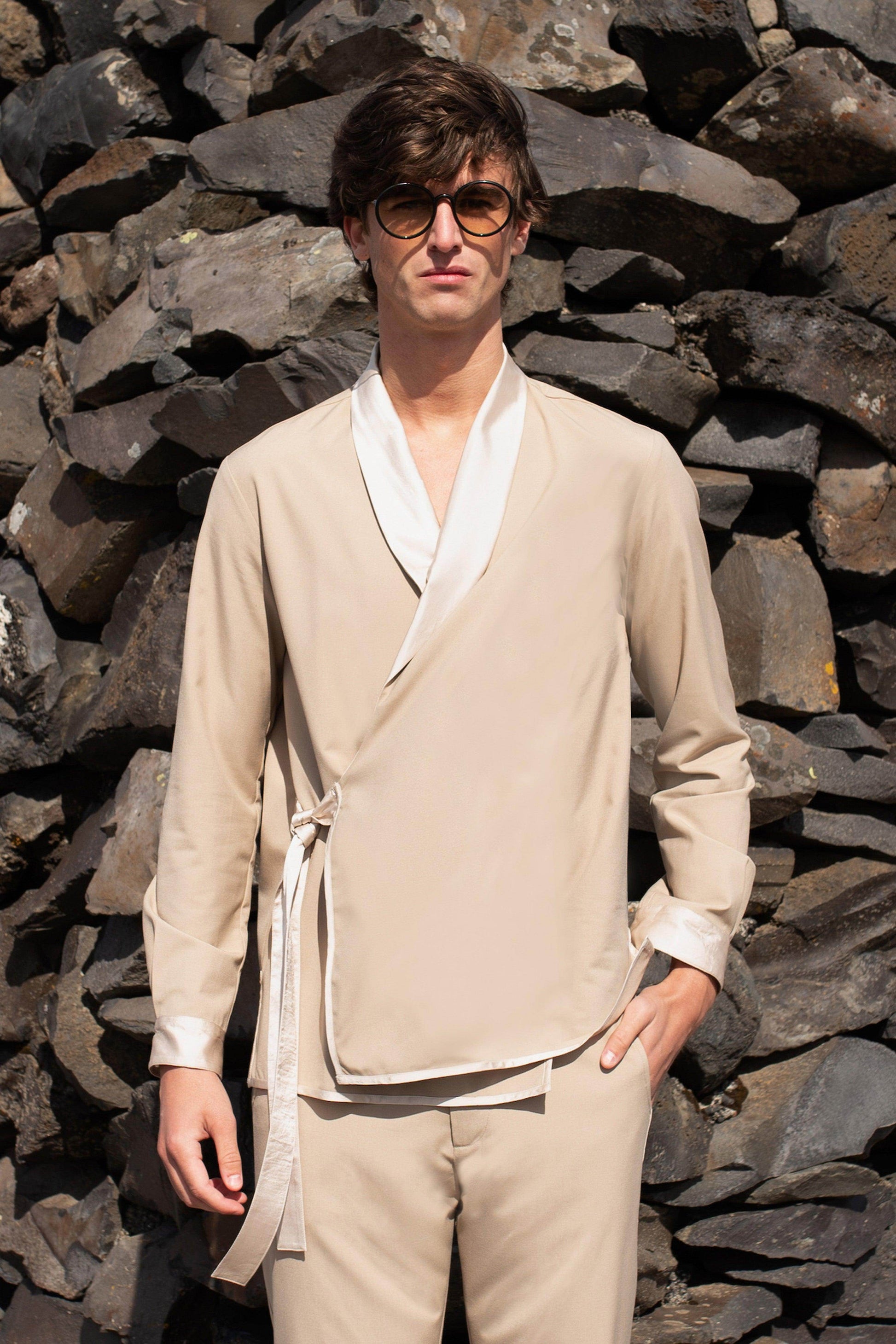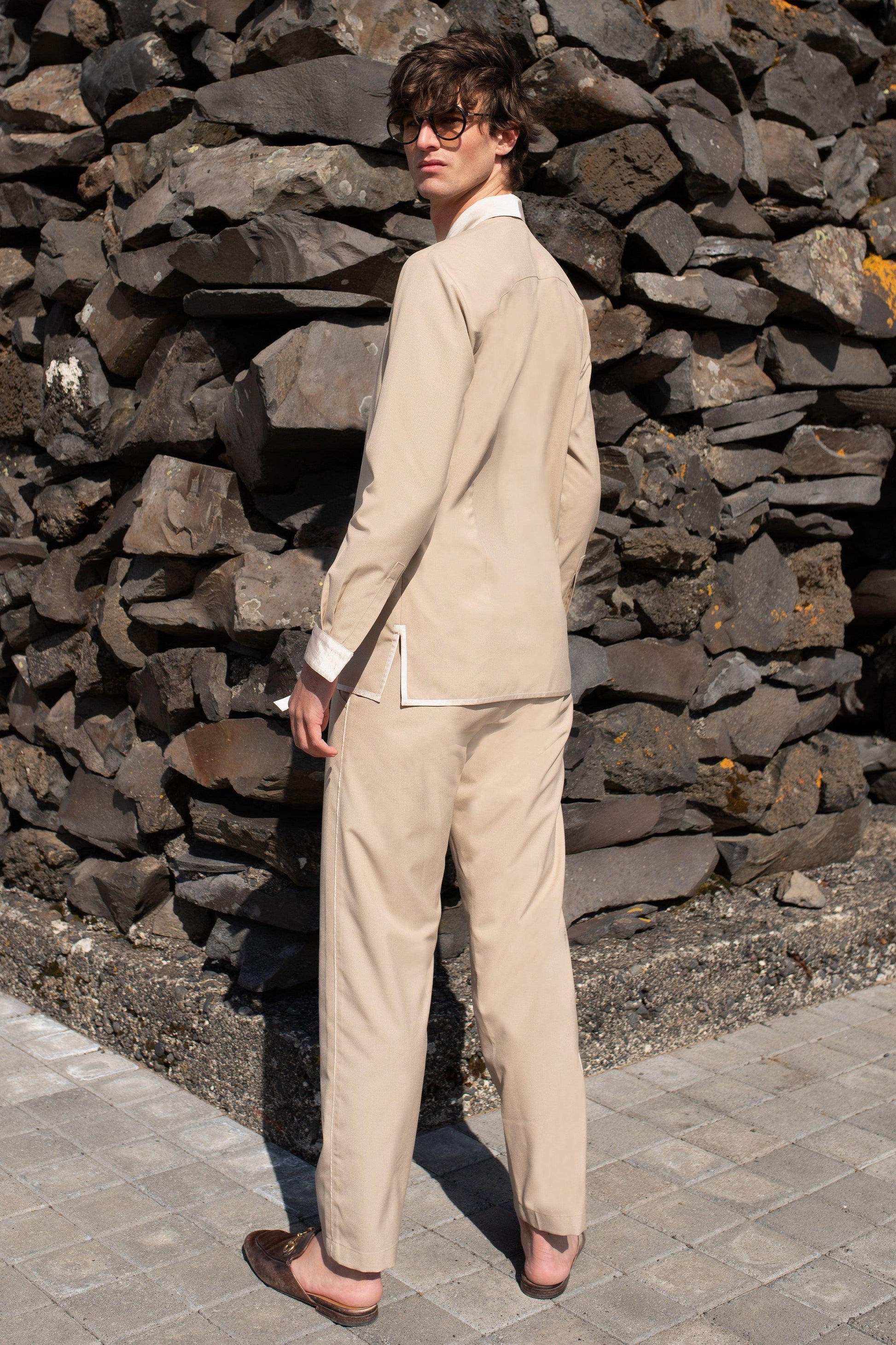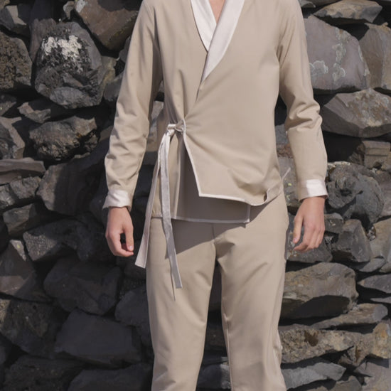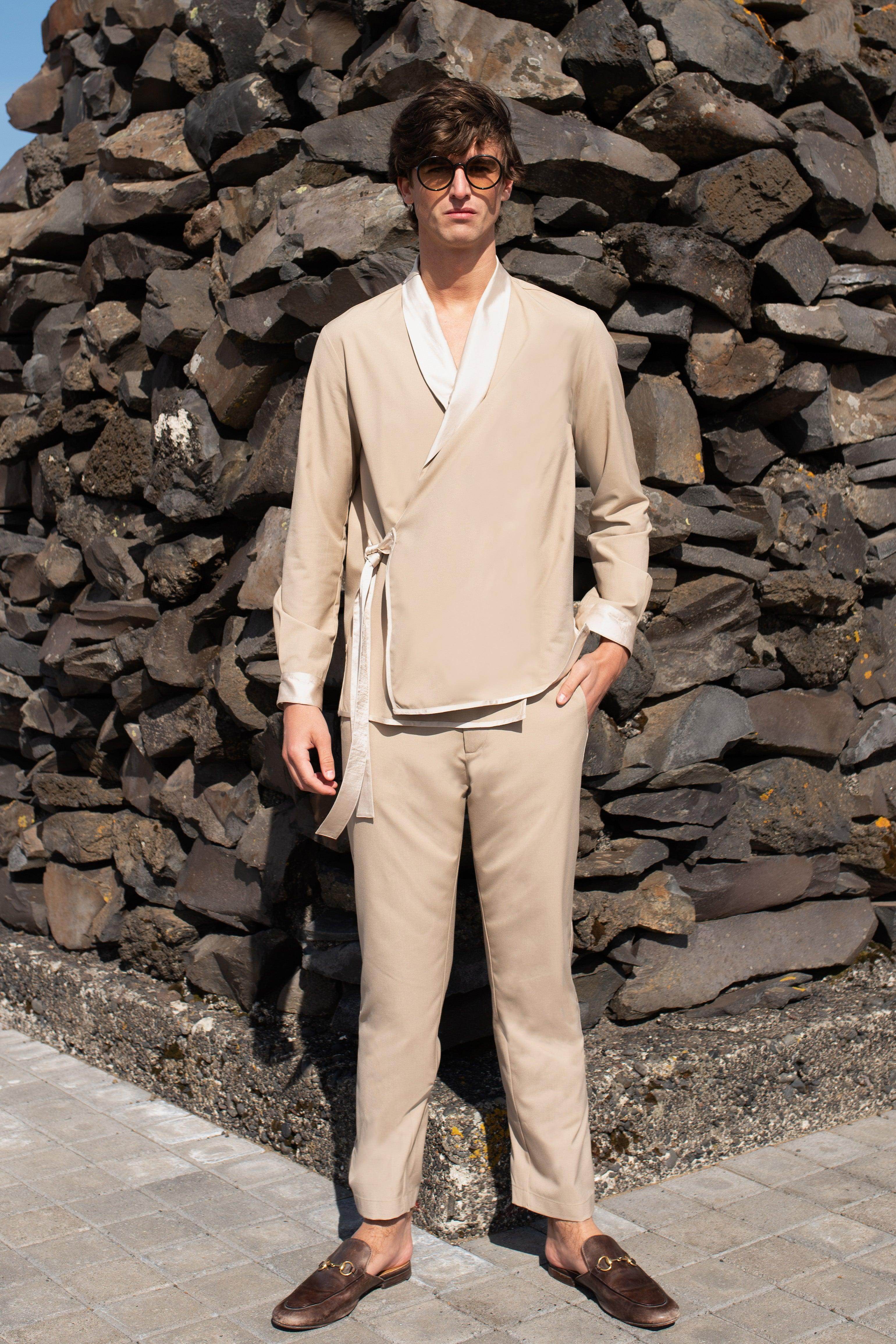 Light khaki shawl-collar jacket in all-weather suiting fabric. Front overlap with side tie. Tonal satin panel at the shawl collar, sleeve cuffs and side tie. Satin piping at the front and bottom hem. Snap button closure at the front and the cuff of the full sleeves. Relaxed fit. Paired with matching straight-fit pants. Tonal satin piping down the side. Semi-elasticated at the waist, belt loops. Hook and zip closure. Pockets on the side.