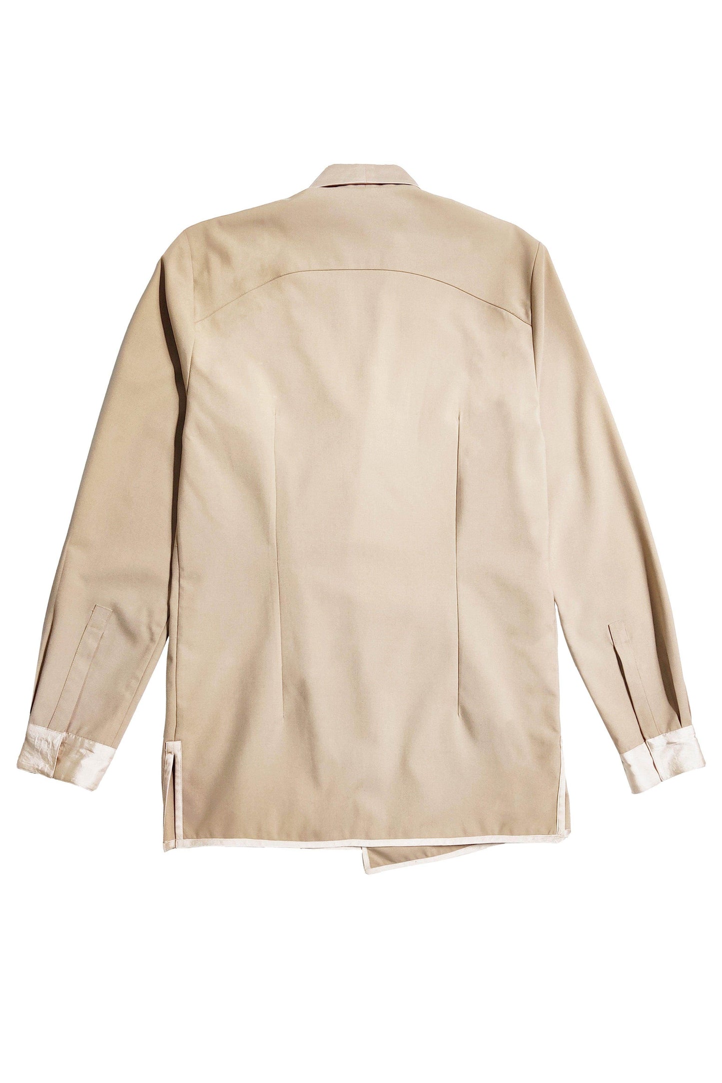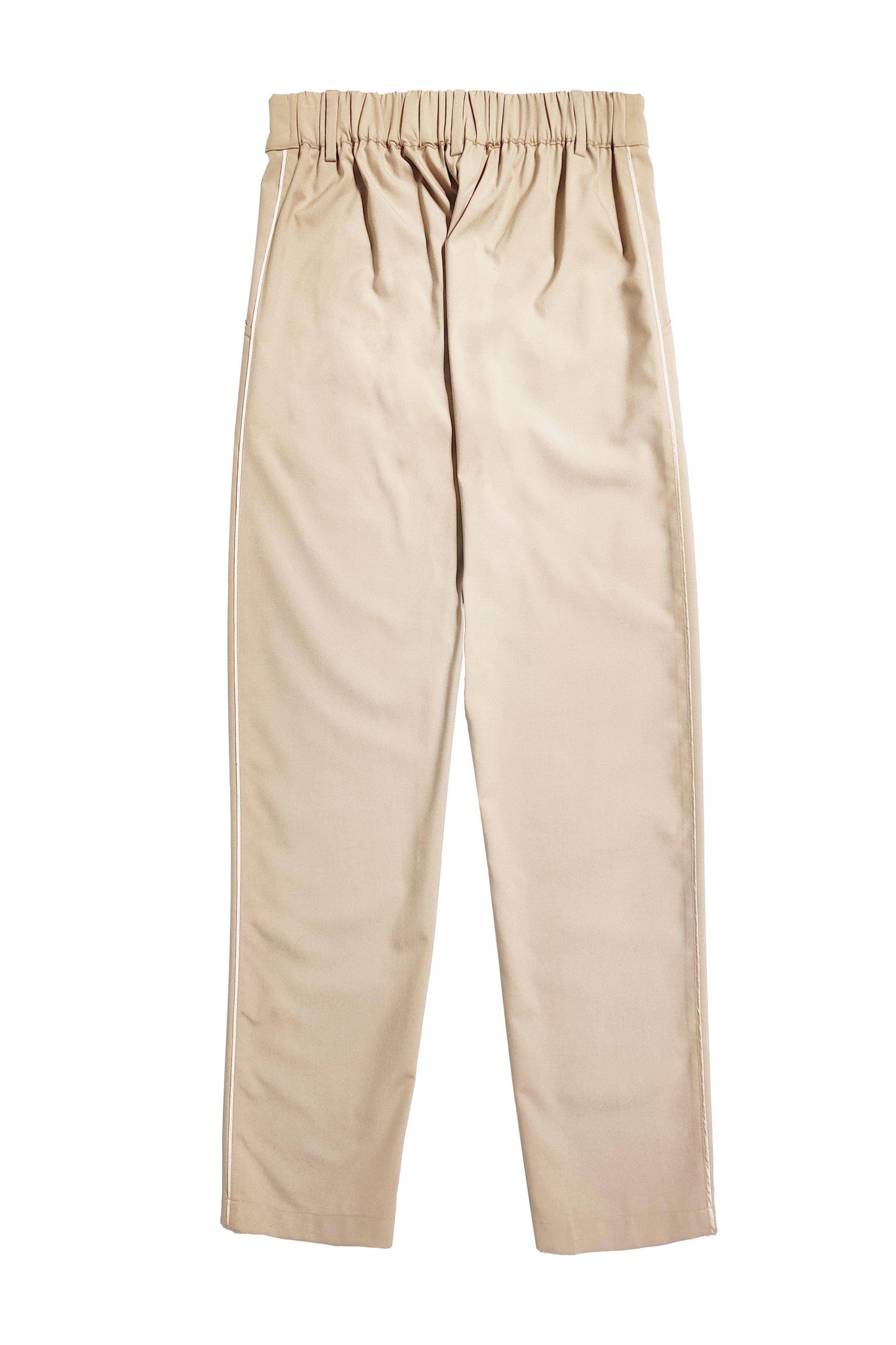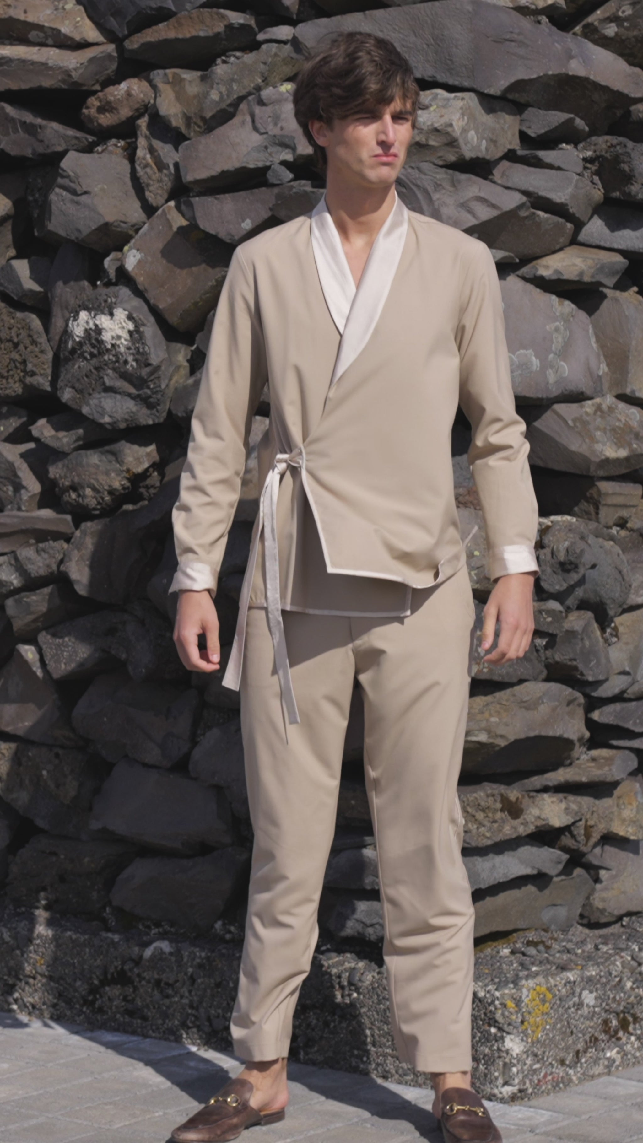 Light khaki shawl-collar jacket in all-weather suiting fabric. Front overlap with side tie. Tonal satin panel at the shawl collar, sleeve cuffs and side tie. Satin piping at the front and bottom hem. Snap button closure at the front and the cuff of the full sleeves. Relaxed fit. Paired with matching straight-fit pants. Tonal satin piping down the side. Semi-elasticated at the waist, belt loops. Hook and zip closure. Pockets on the side.