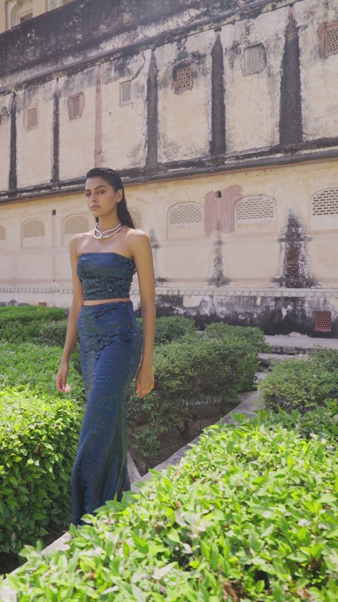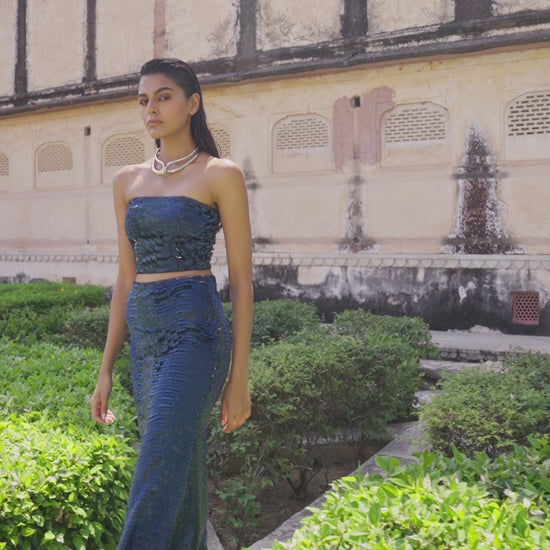 Bandeau bralette in a shimmering blue allover sequin embroidery. Single side sewn pipe bead sequins in a flattering wave pattern. Removable pad pockets. Zipper in the back. Garment is fully lined. Paired with a matching maxi skirt in a delicate mermaid cut. Zipper in the side. Garment is fully lined.