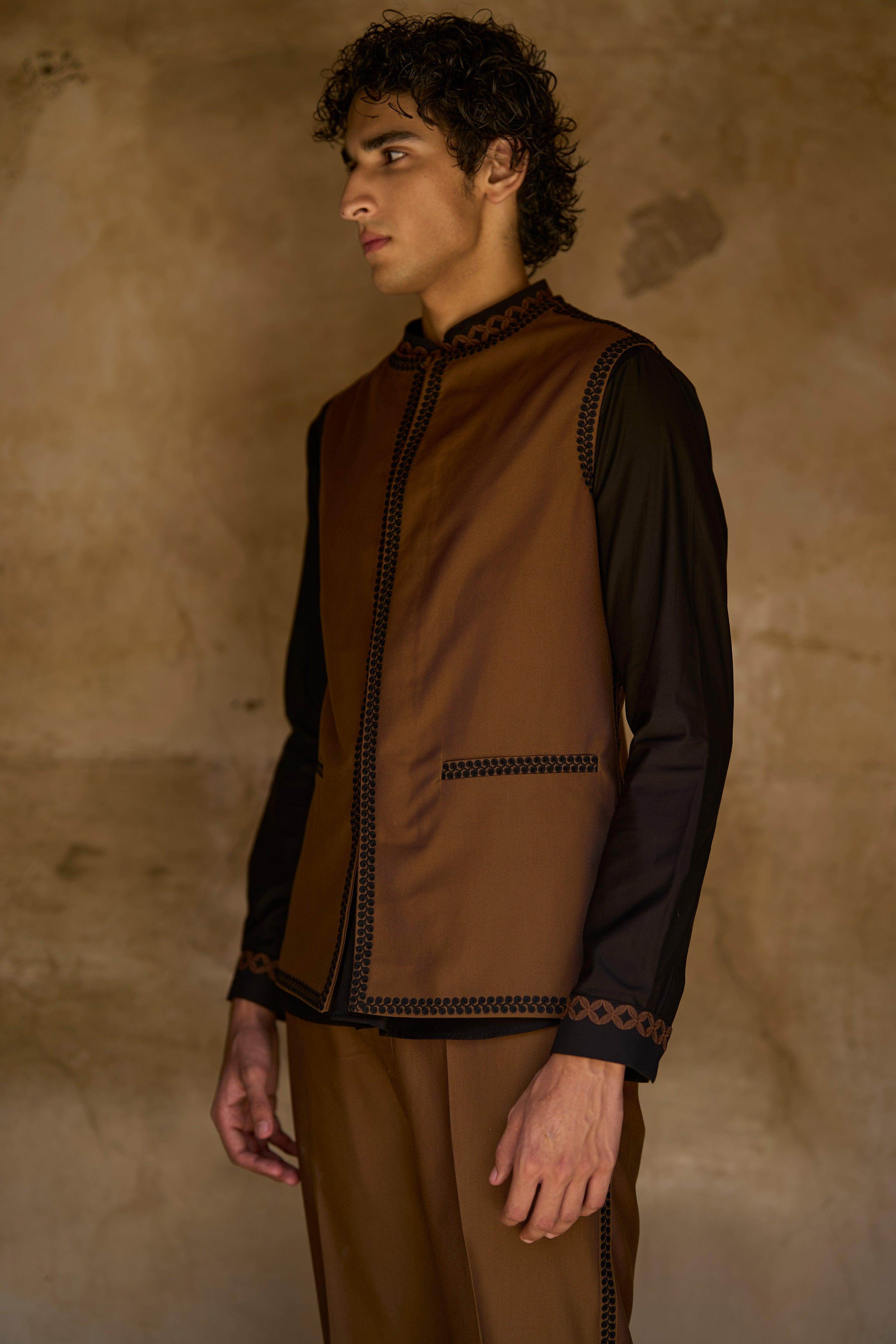 Sleeveless 'bandi' jacket in brown all weather suiting material. Placed geometric borders in contrast black embroidery on the front seams and pockets, and back seams. Round neck, concealed placket. Garment is fully lined. Paired with matching straight cut pant with placed geometric borders in contrast black embroidery down the side seams of the pant. Pockets in the front and back. Belt loops, hook/eye and zip closure in the front.