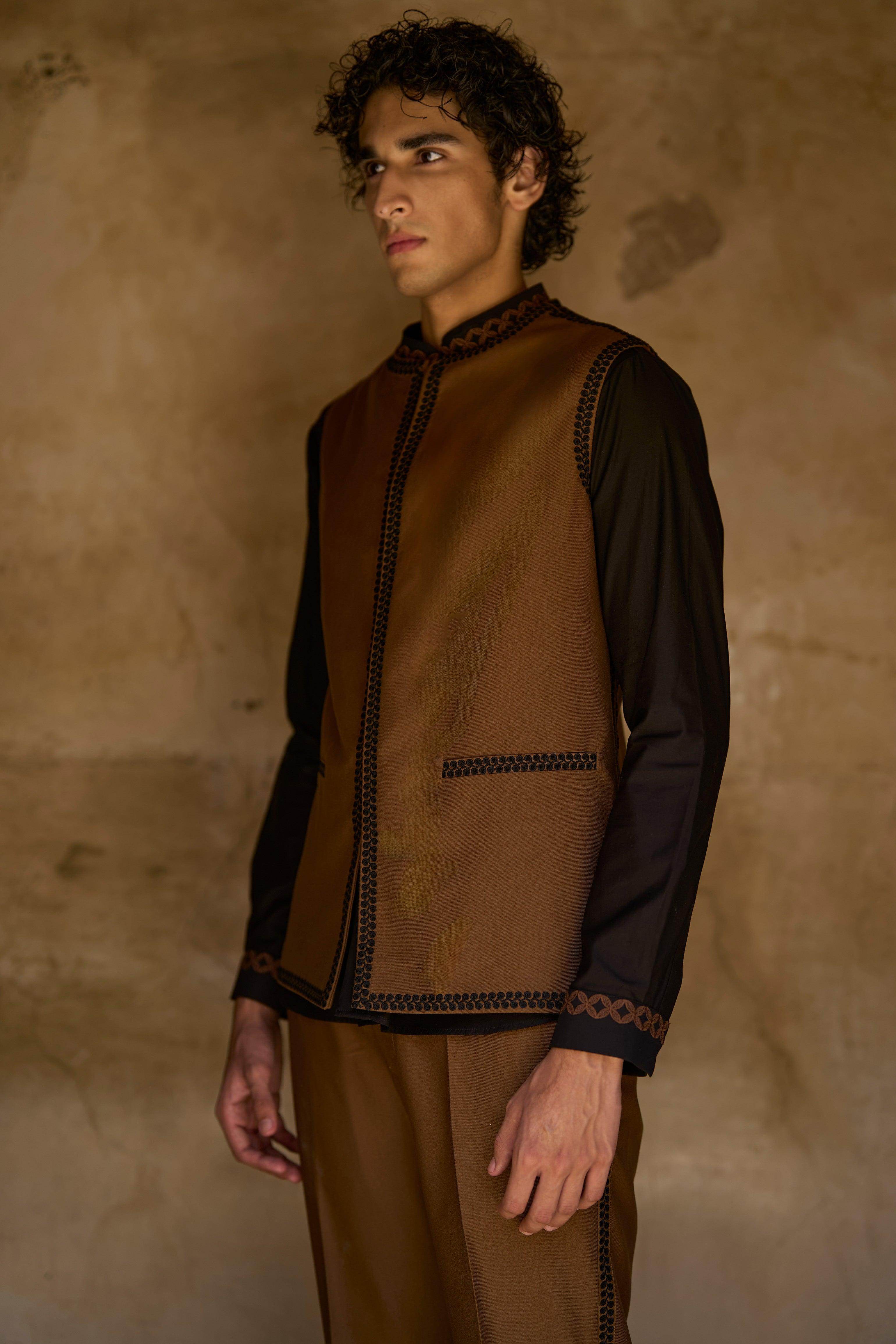 Sleeveless 'bandi' jacket in brown all weather suiting material. Placed geometric borders in contrast black embroidery on the front seams and pockets, and back seams. Round neck, concealed placket. Garment is fully lined.