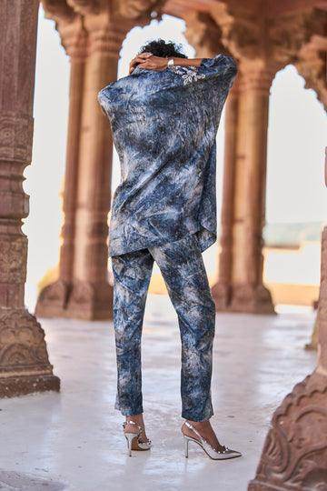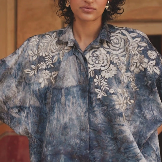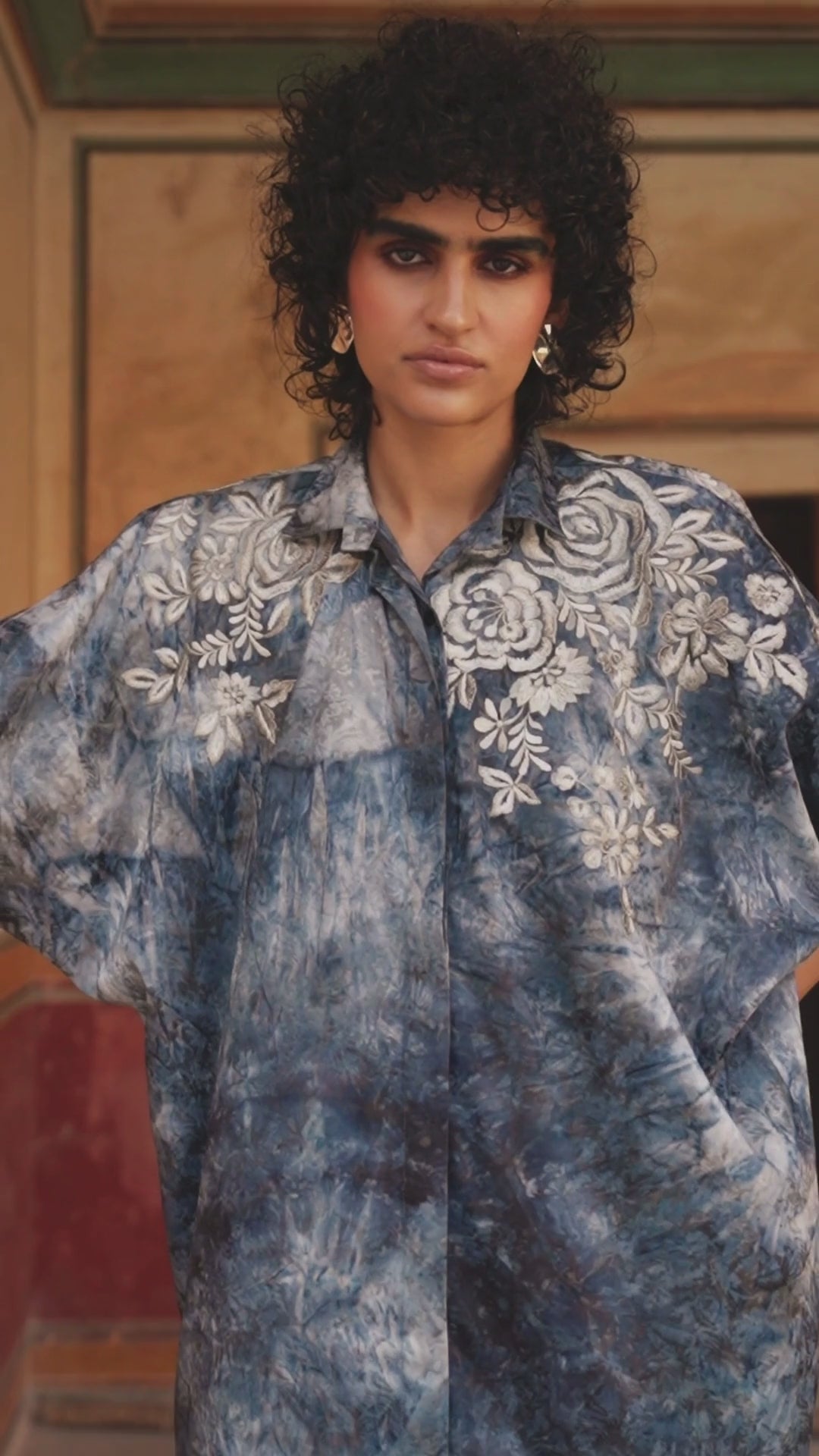 Rich drapey jacquard with an allover tie dye effect in evening shades of gray and blue. Boxy shirt with metallic silver and grey floral embroidery placed on the shoulders. Concealed placket, 3/4th dolman sleeves with snap buttons on the cuff. Curved shirt hem in the front, straight hem in the back. Paired with matching straight pant. Semi elasticated at the waist. Pockets in the sides. Hook/eye and zip closure in the front.