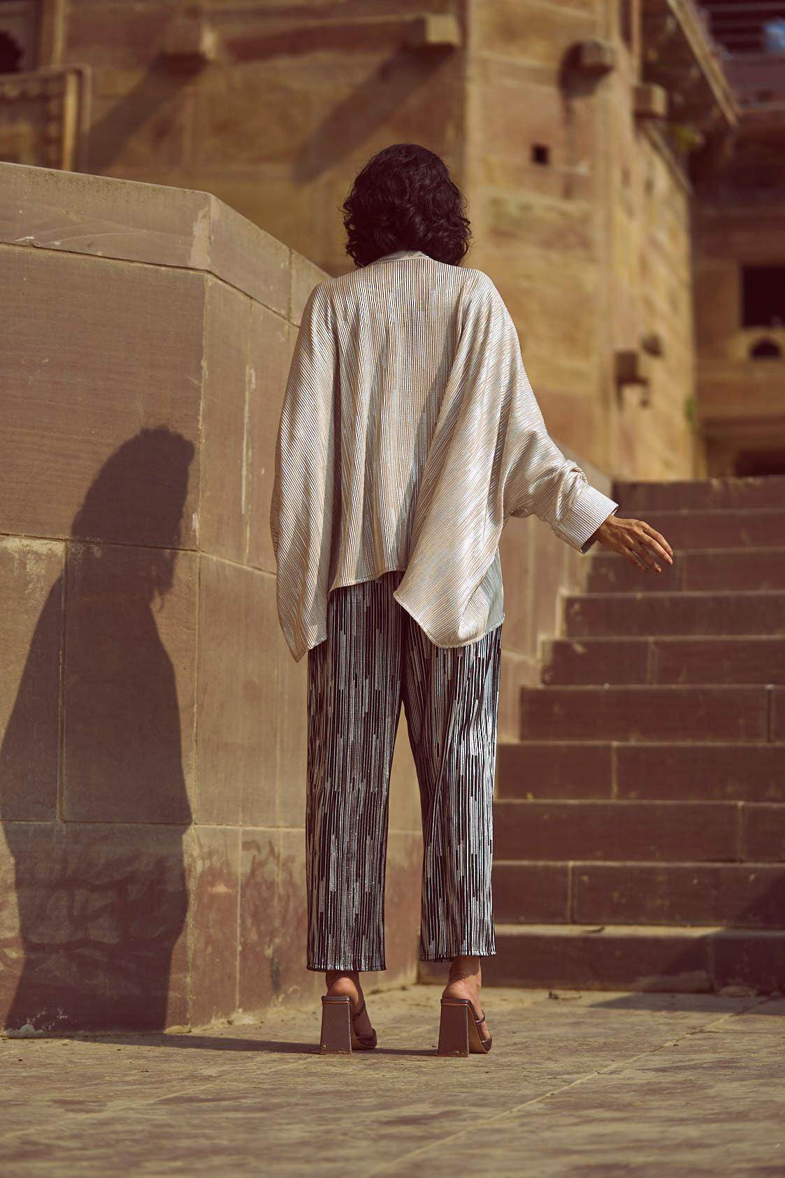 Ivory foil pleated boxy top with a band collar and snap button closure at the front. Horizontal pleating panels at the cuffs. Paired with black foil pleated wide-legged. Elasticated at the waist. Relaxed fit.