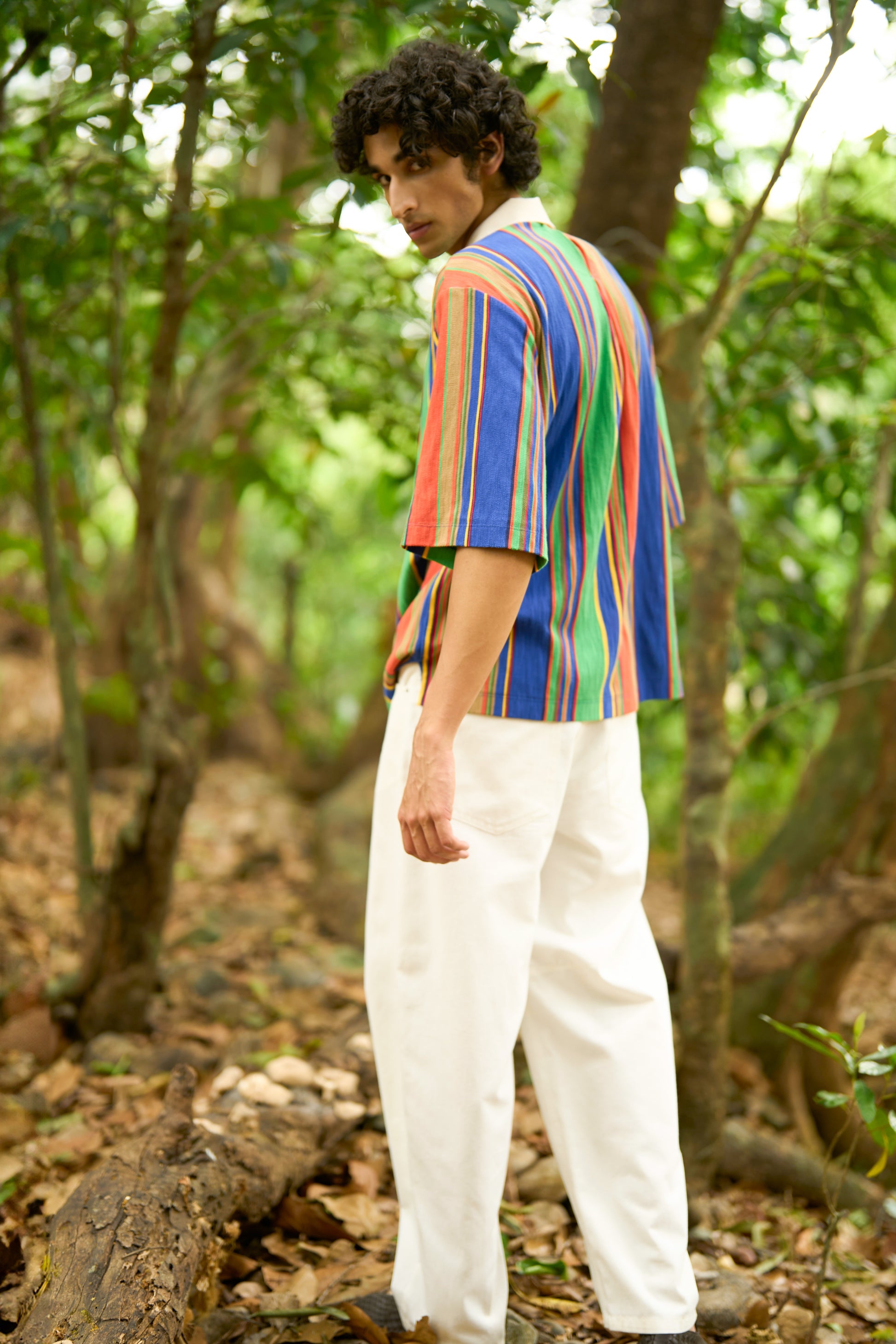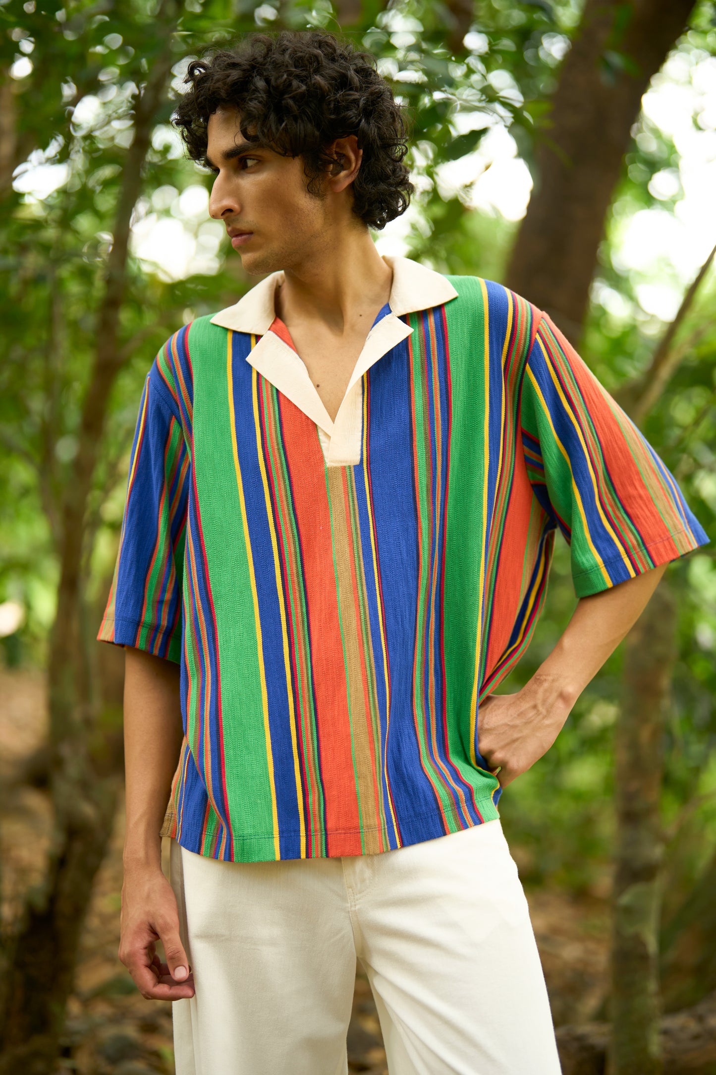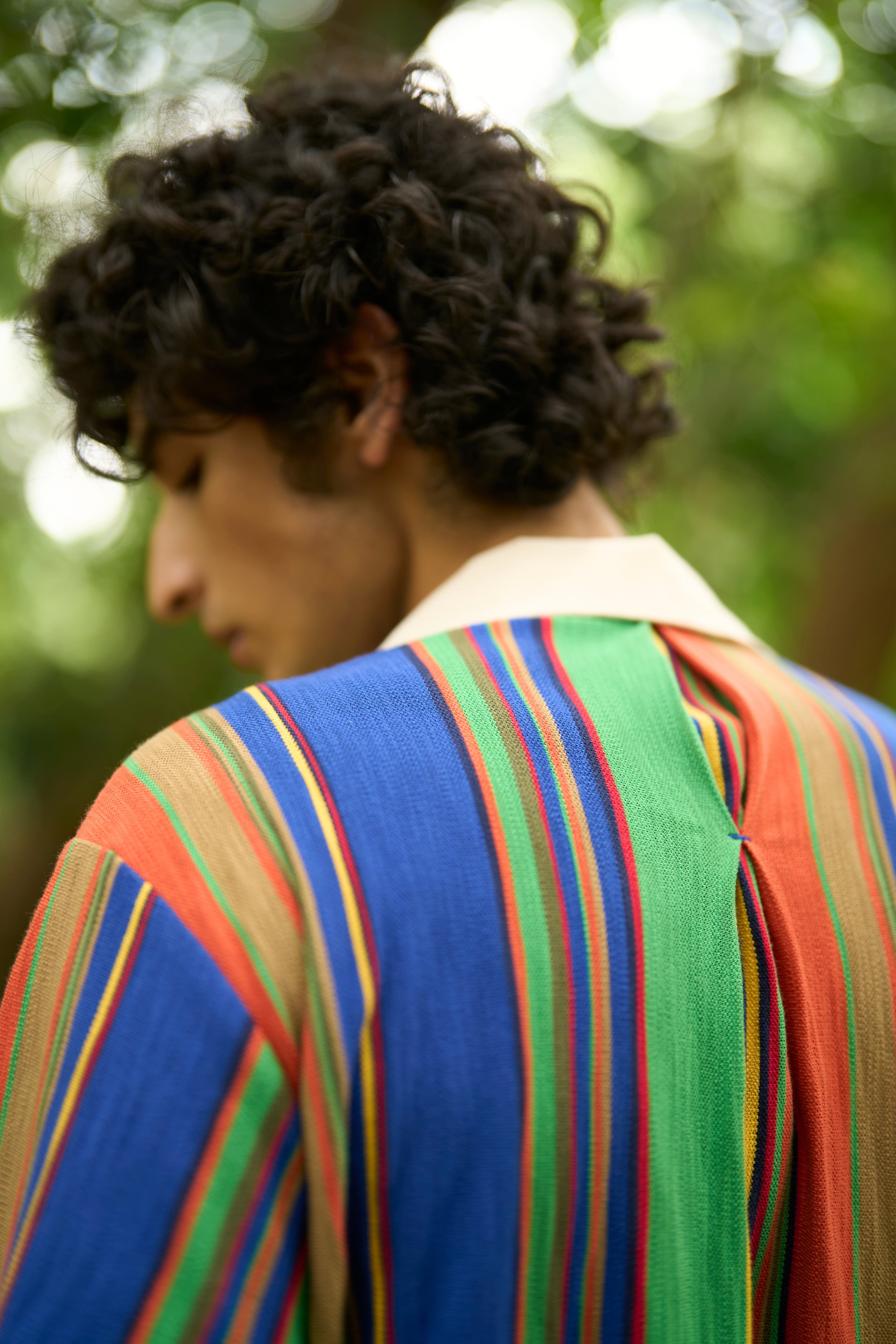 Relaxed-fit piqué polo in a bold multicolour vertical stripe. Contrast V-neck and ivory collar, drop shoulder and elbow length sleeves. Inverted pleat with a hand tuck detail at the back.