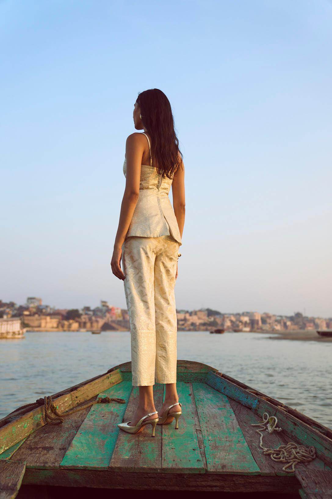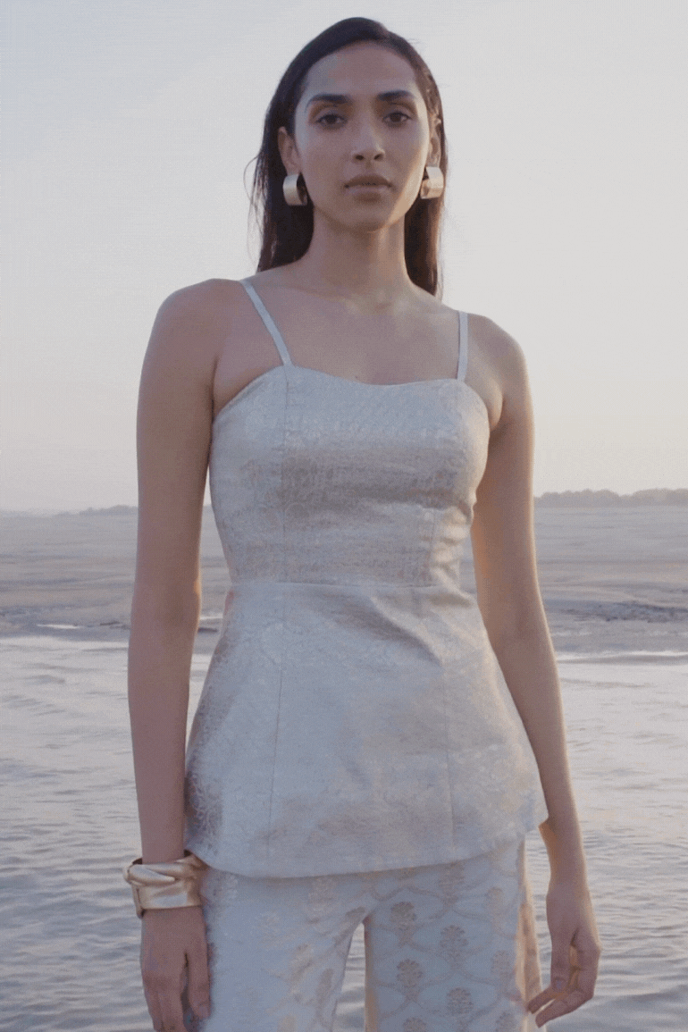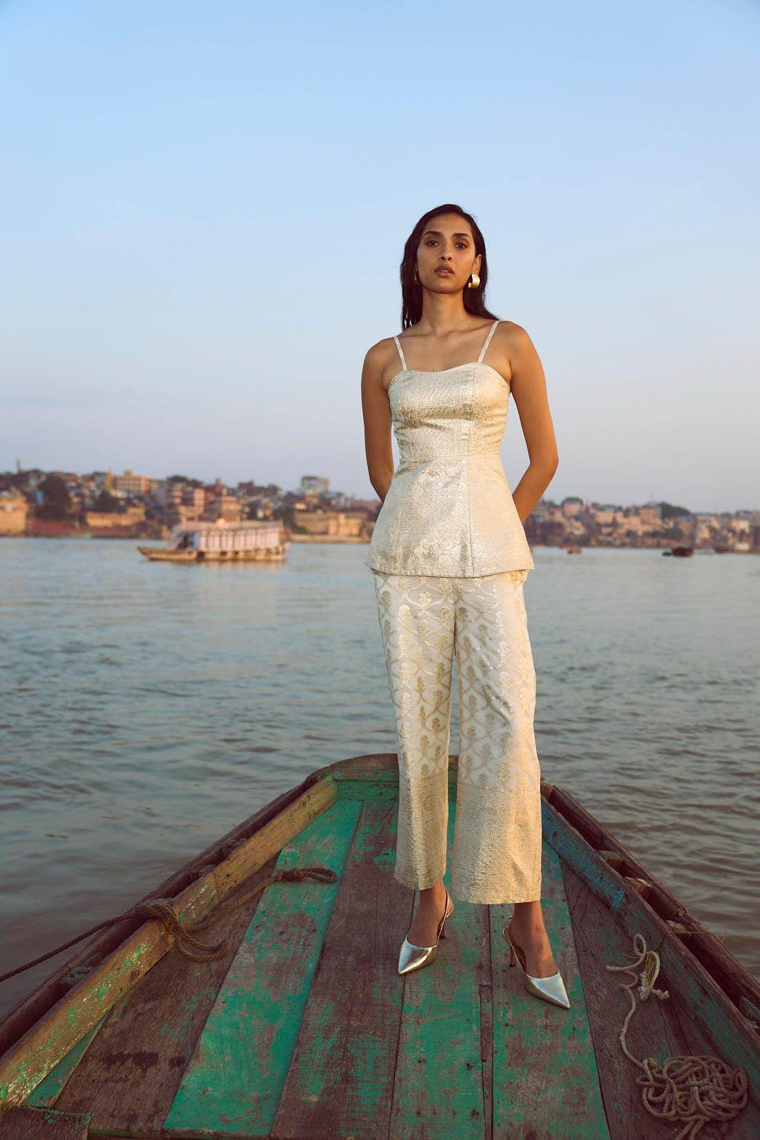 Off-white corset top made of placed brocade borders champagne lurex chanderi fabric. Peplum style off-shoulder top with a sweetheart neckline. Comes with adjustable, detachable straps. Zip closure at the back. Paired with matching brocade chanderi wide-legged pants. Placed border at the hem. Hook and zip closure at the front. Semi elasticated at the waist. Both garments are fully lined.
