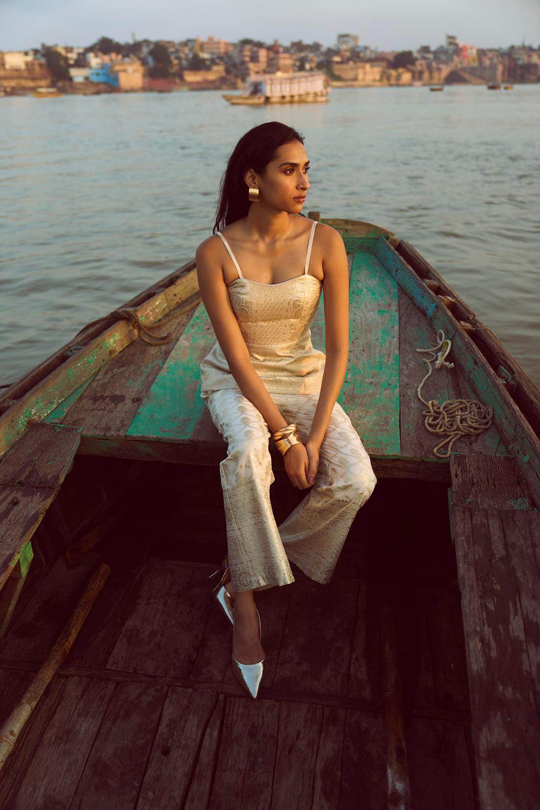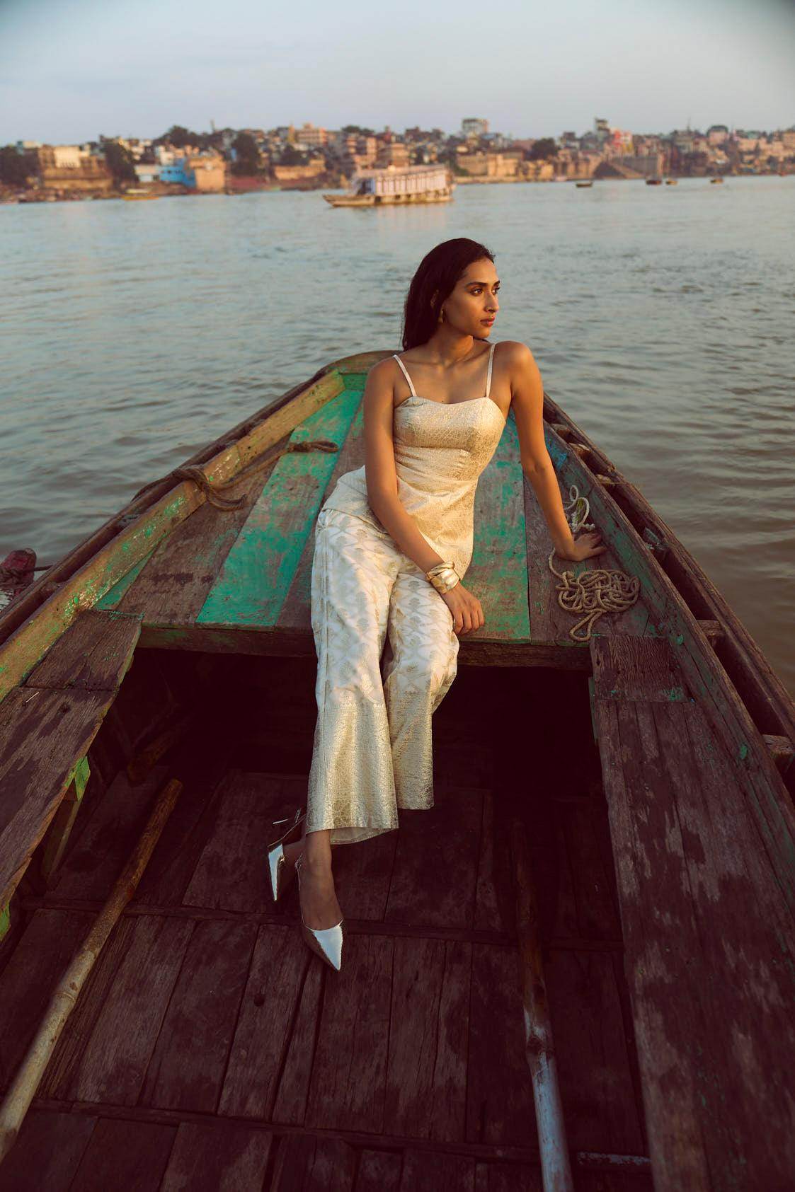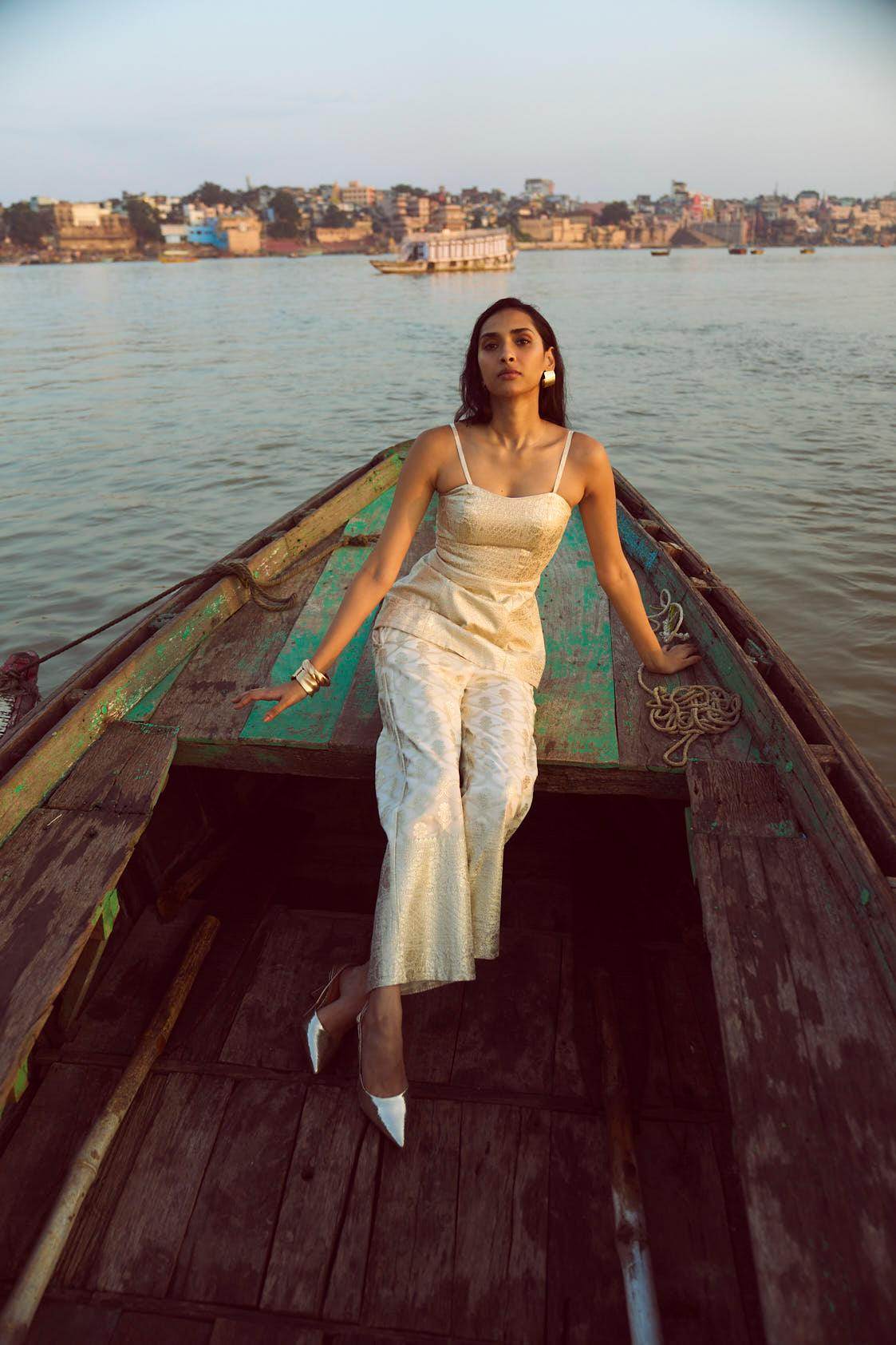 Off-white corset top made of placed brocade borders champagne lurex chanderi fabric. Peplum style off-shoulder top with a sweetheart neckline. Comes with adjustable, detachable straps. Zip closure at the back. Paired with matching brocade chanderi wide-legged pants. Placed border at the hem. Hook and zip closure at the front. Semi elasticated at the waist. Both garments are fully lined.