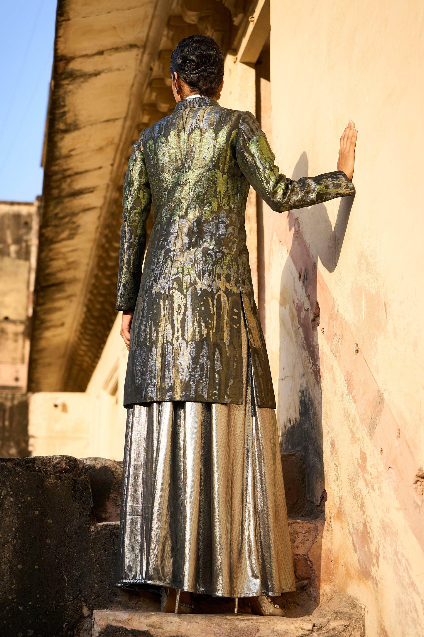 Ombré pattern structured longline jacket in soft brocade. Graded tones of green, pewter and gold. Full sleeve, band collar. Hammered metal silver buttons in the front. Garment is fully lined. Paired with a silver foil lamé flared skirt in flowy fabric. Exaggerated smocking detail at the high waist accentuating the fit and flare silhouette.