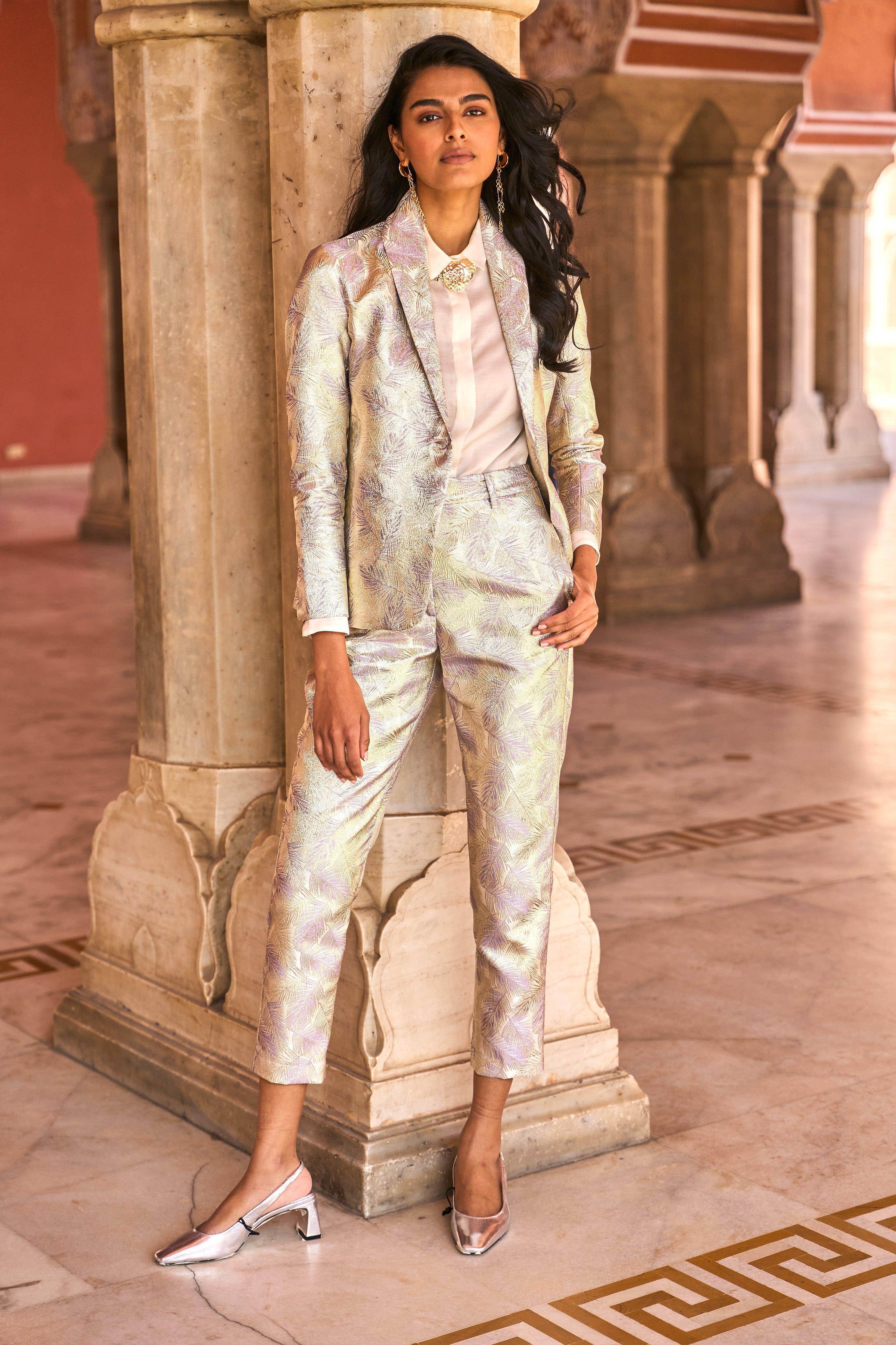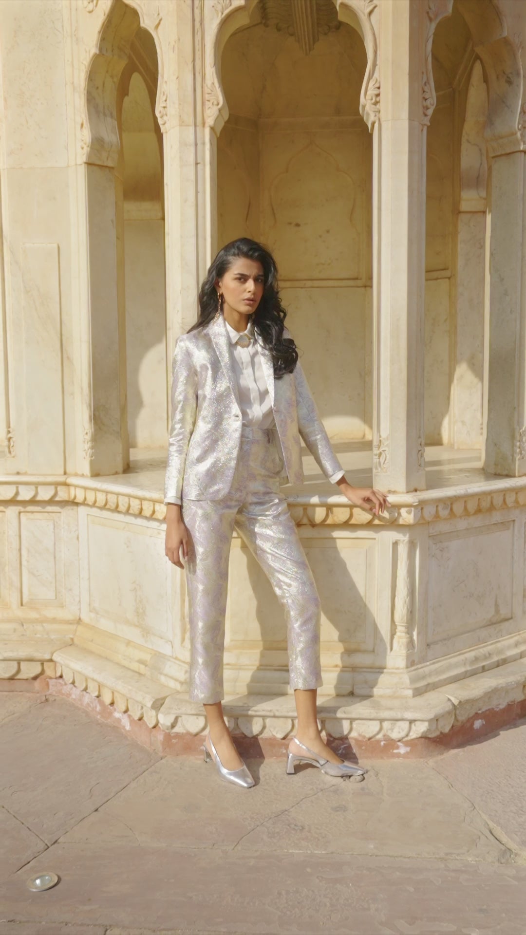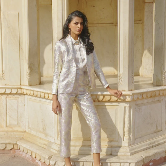 Blazer jacket in lilac and silver soft brocade. Single button closure at the front, snap button closure on the sleeves.The garment is fully lined. Paired with matching high waisted brocade pants. Hook and zip closure at the front. Pockets on the side, belt loops at the waist.