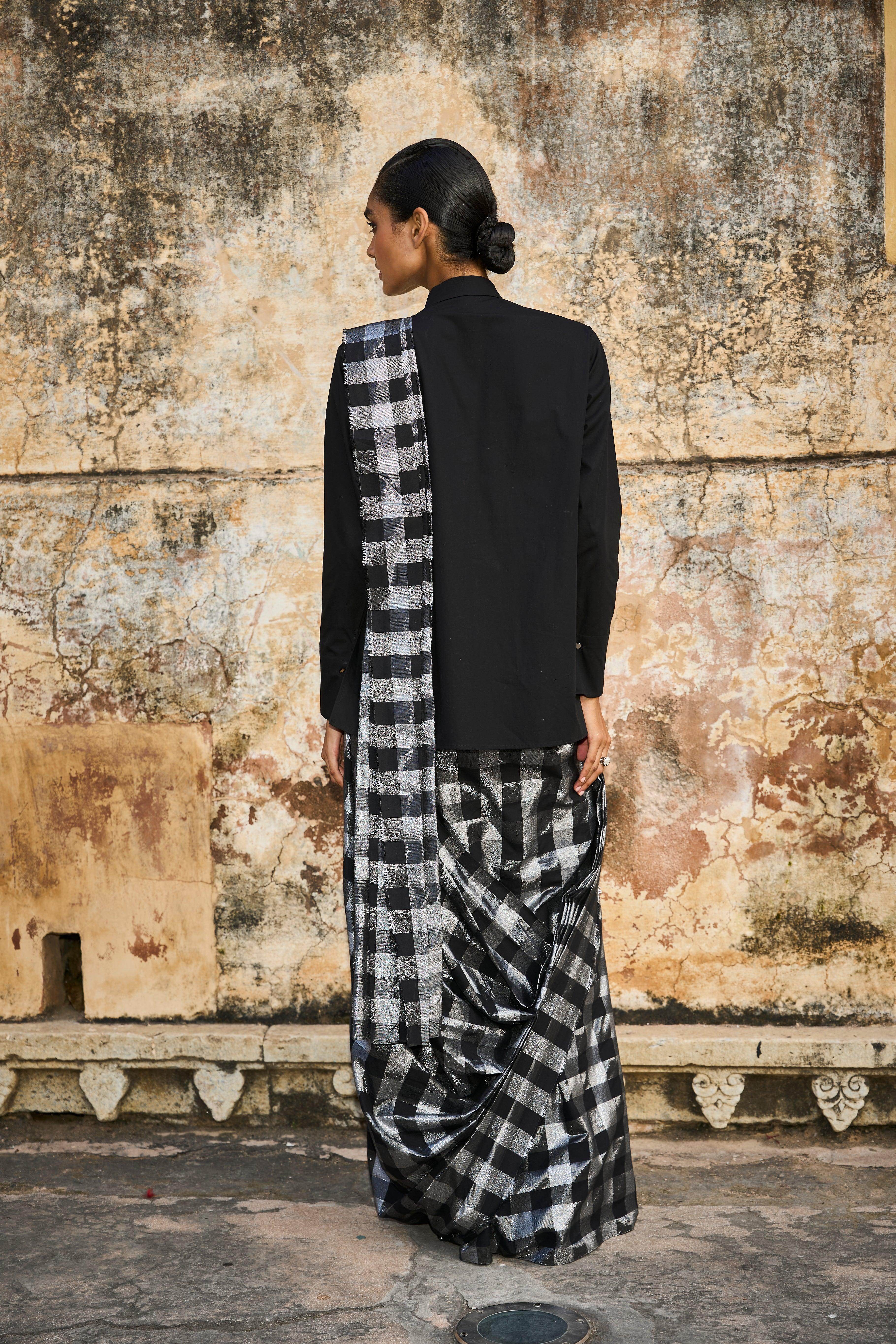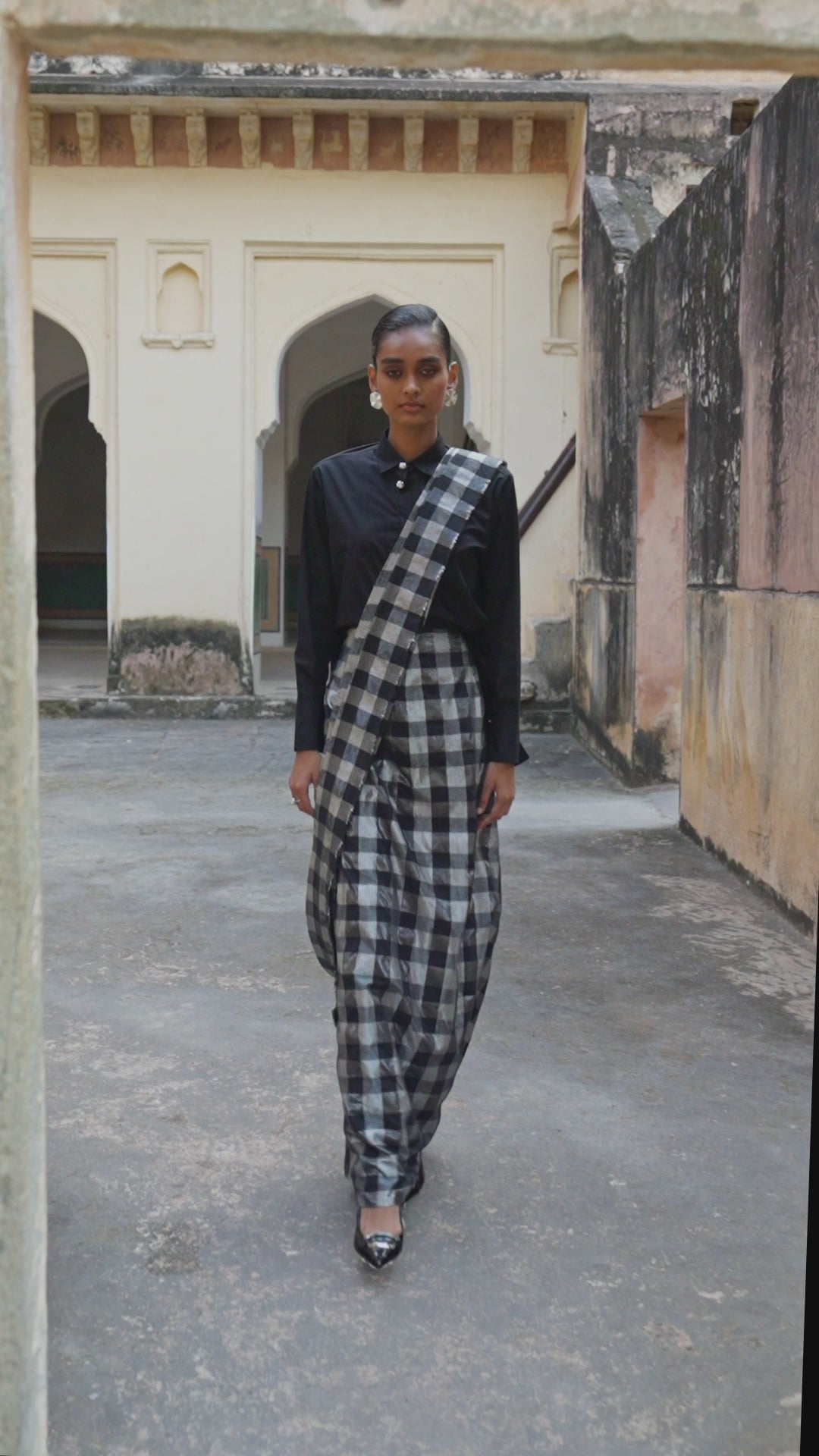 Black organic cotton poplin full sleeve shirt with a high/low front & back hem. Pearl and metal broach pin attached to the front neck and collar. Concealed placket. Full sleeves with notched cuffs and metal button closure. Relaxed fit. Paired with a draped and wrapped straight cut maxi-skirt with hand applied pleats in a shimmering metallic and black check pattern. Free flowing pleated panel with soft raw edge hems wraps around the waist and over the shoulder in a sari-inspired drape detail. Zipper in the side. Garment is fully lined.