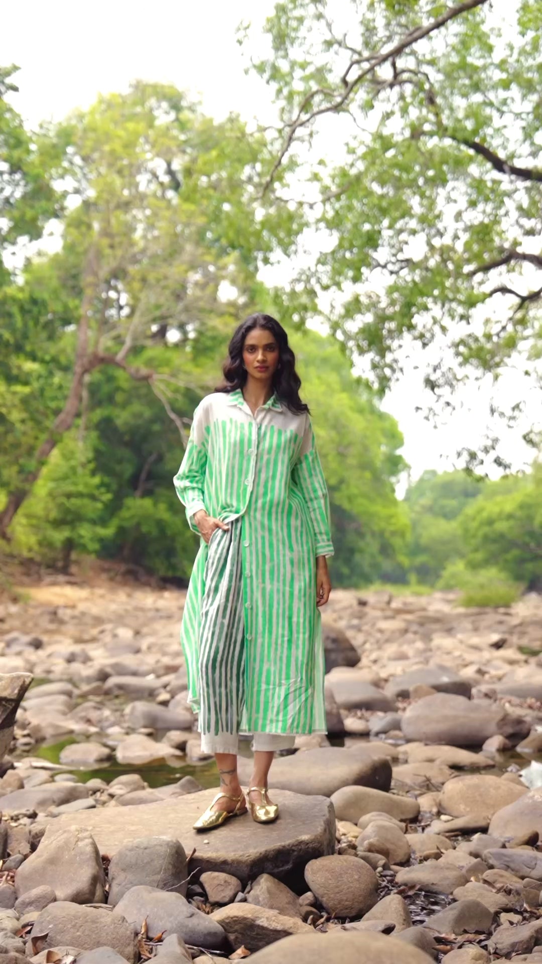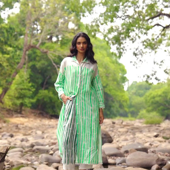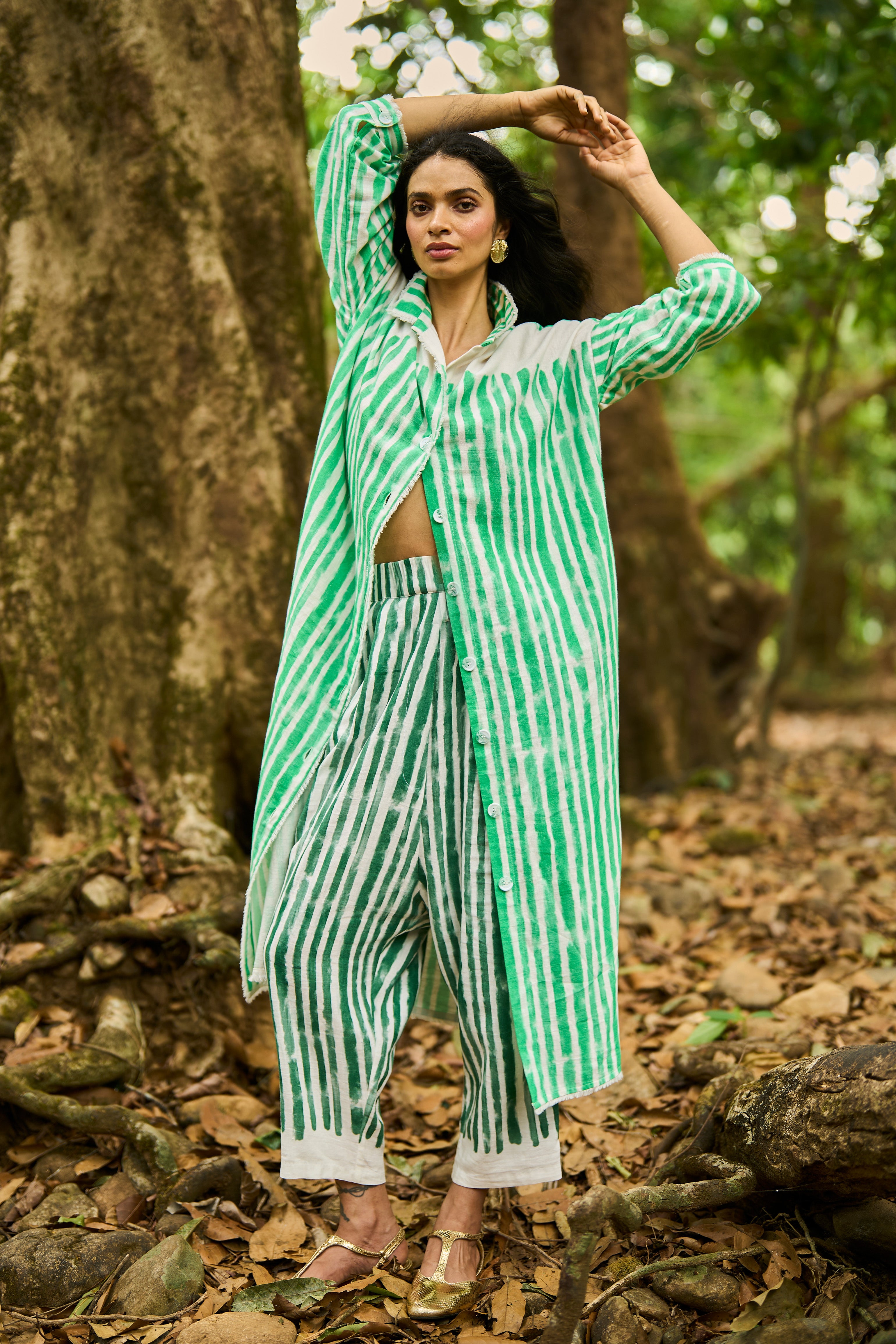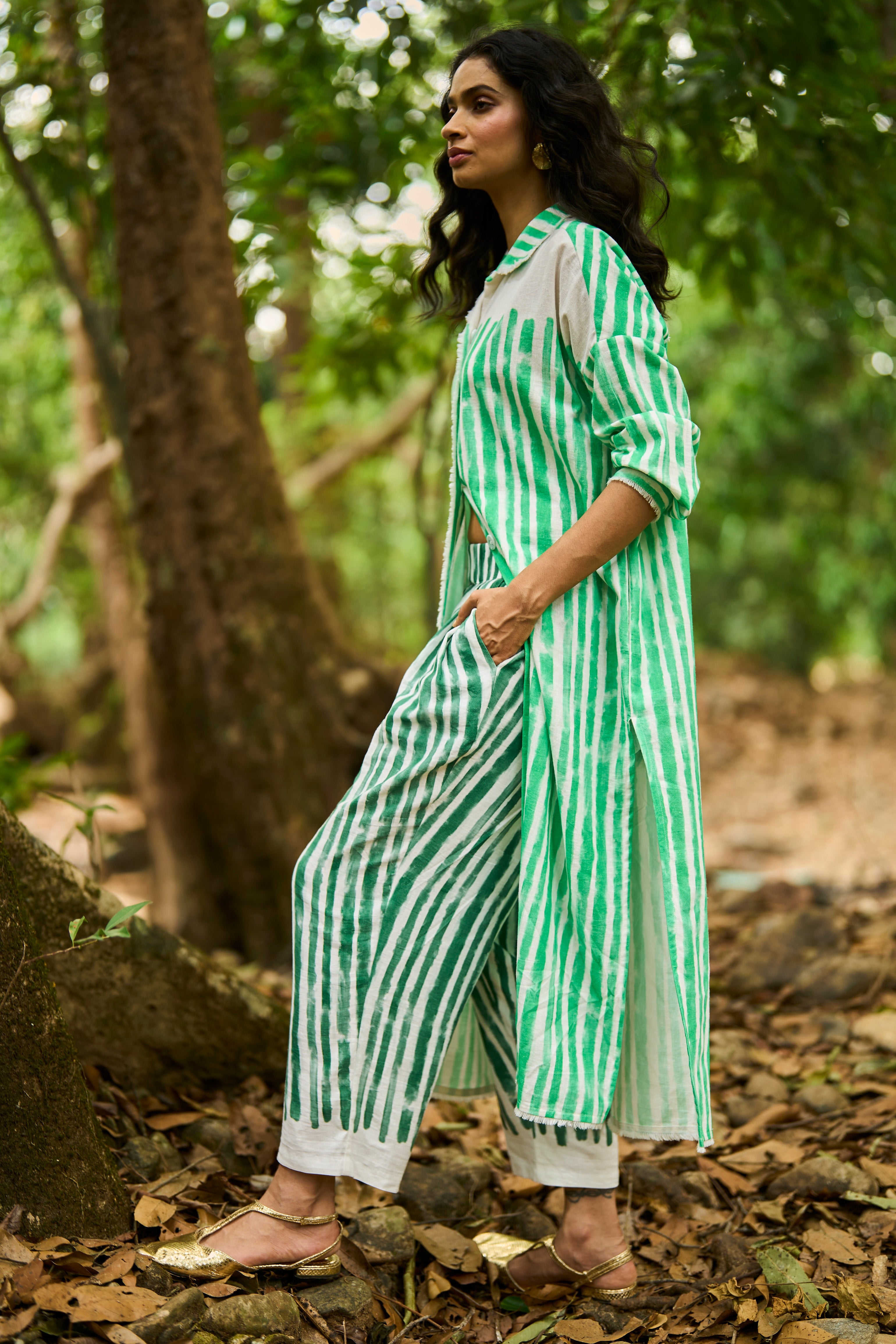 Architectural pants in a breathable drapey linen blend fabric. Placed handpainted stripe in a moss green. Features hand-sewn pleats in the front, elasticated waistband at the back with side pockets. Cropped length.