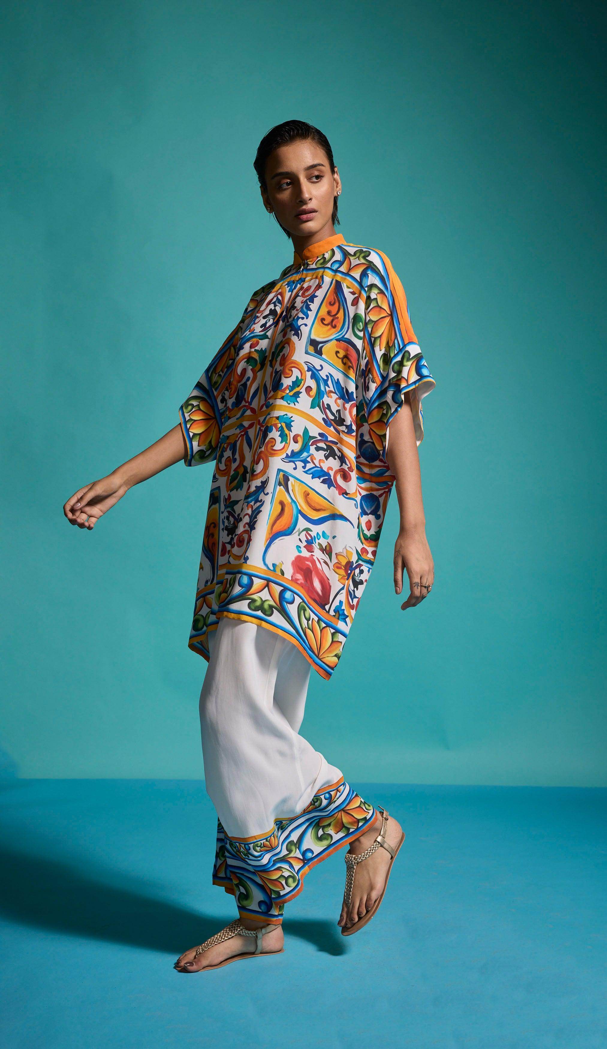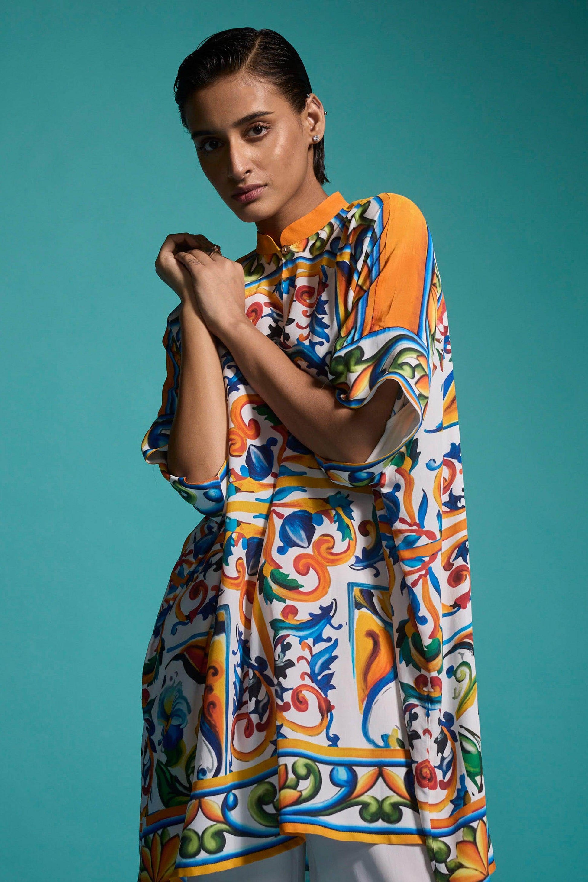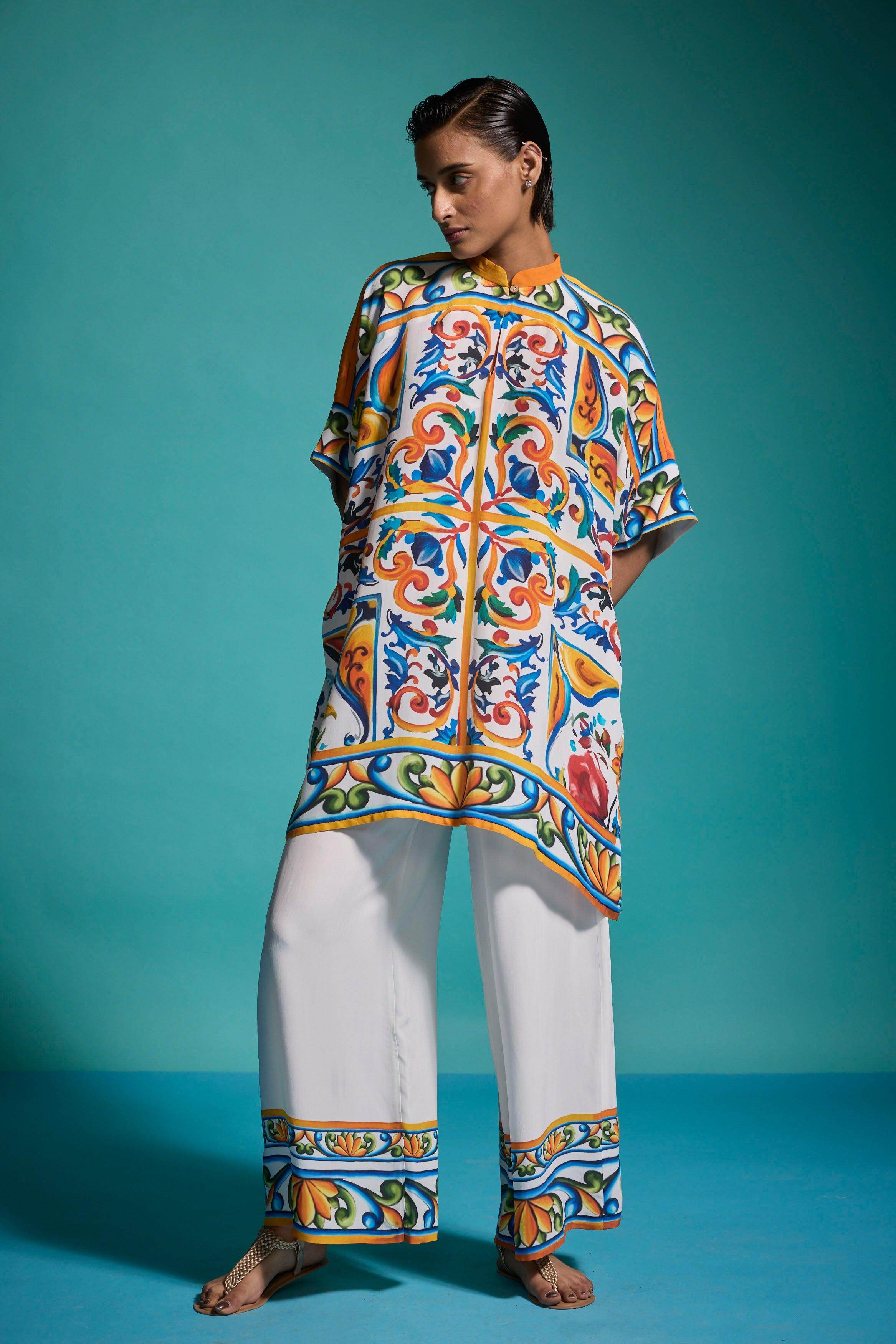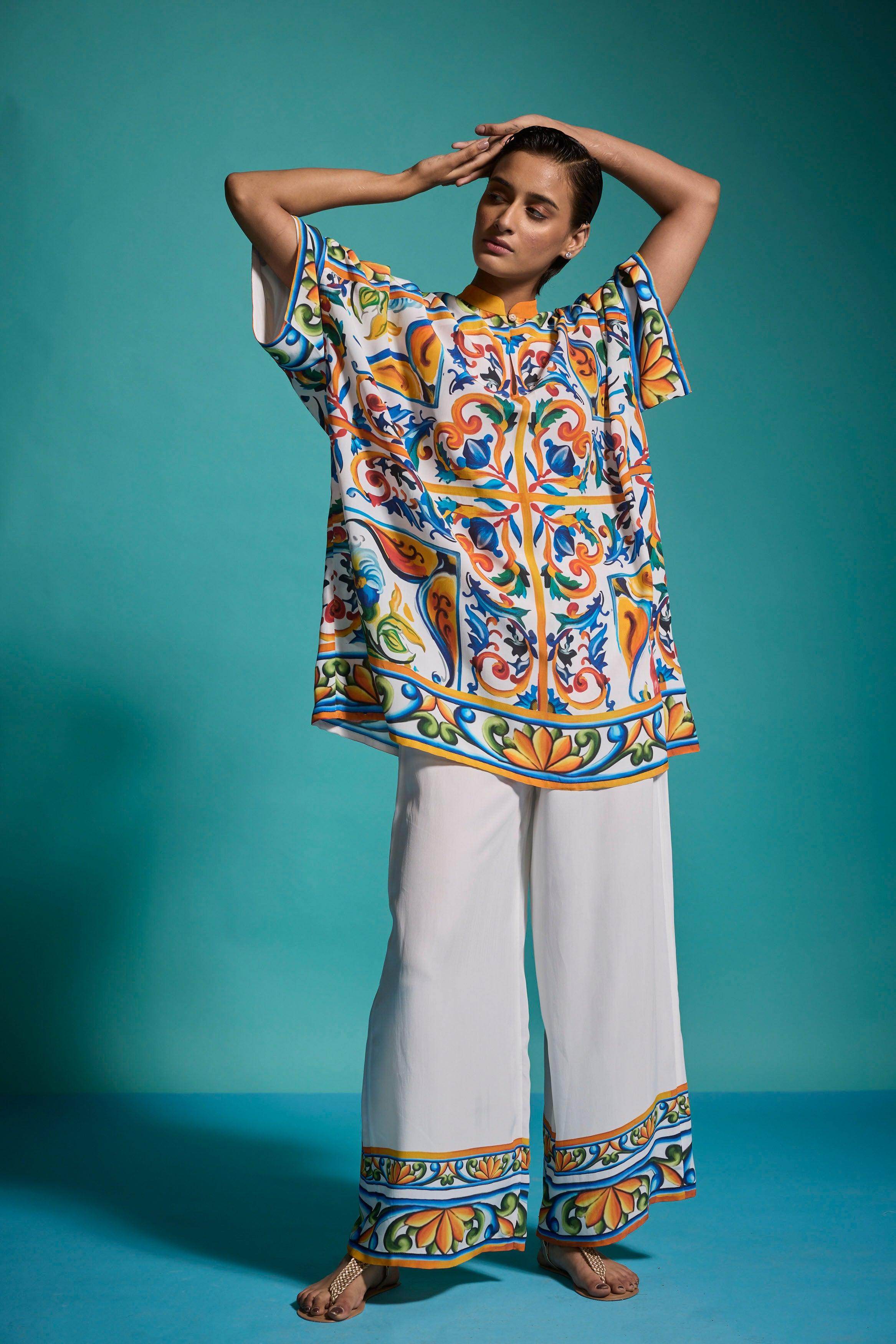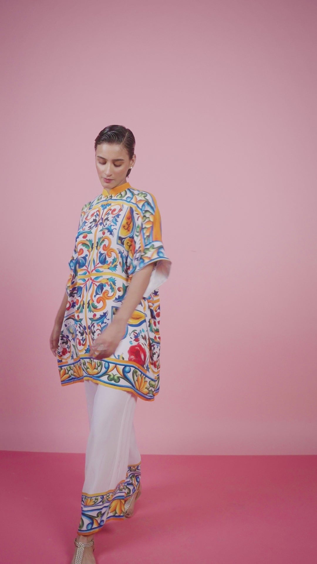 Boxy popover longline top with a multicolor hand-painted print. Features a band collar with a front keyhole, button and loop closure. Drop shoulder with a wide cuff. Relaxed fit. Paired with White wide-legged pants with a multicolor hand-painted print at the hem. Elasticated waistband with drawstrings. Side pockets.