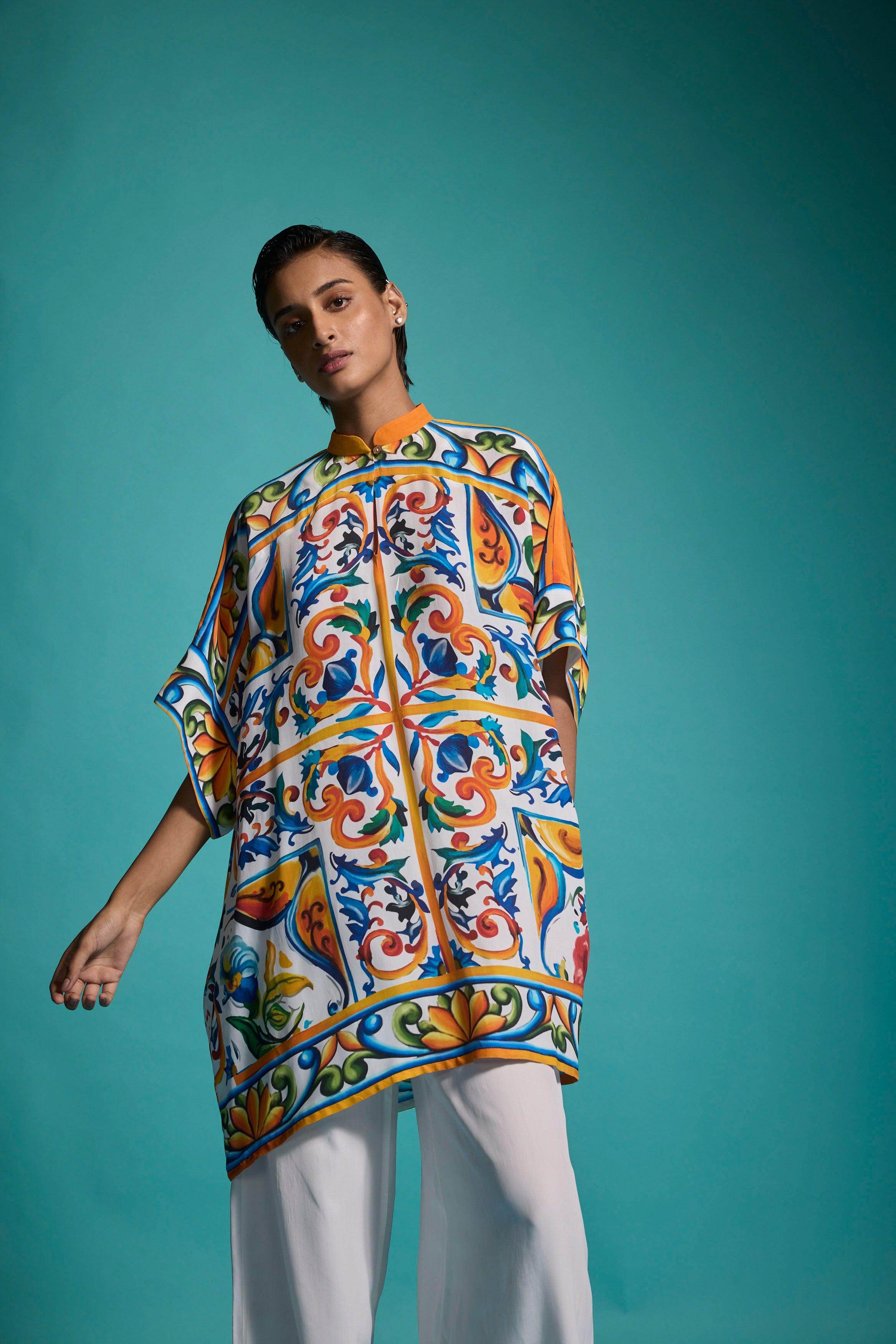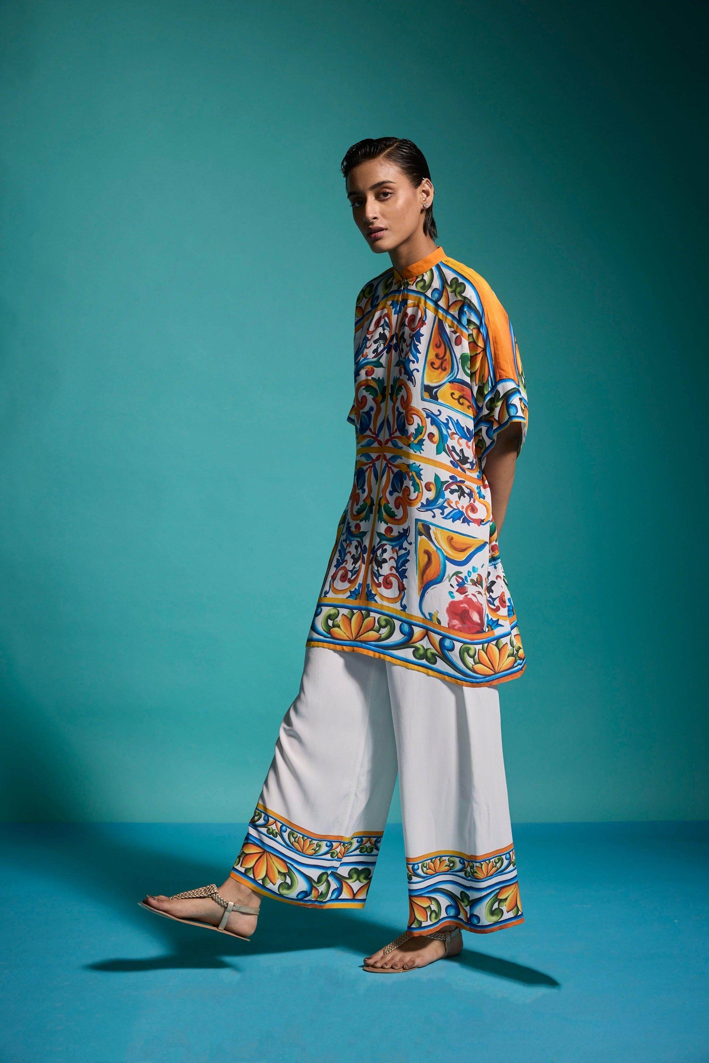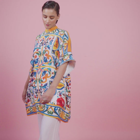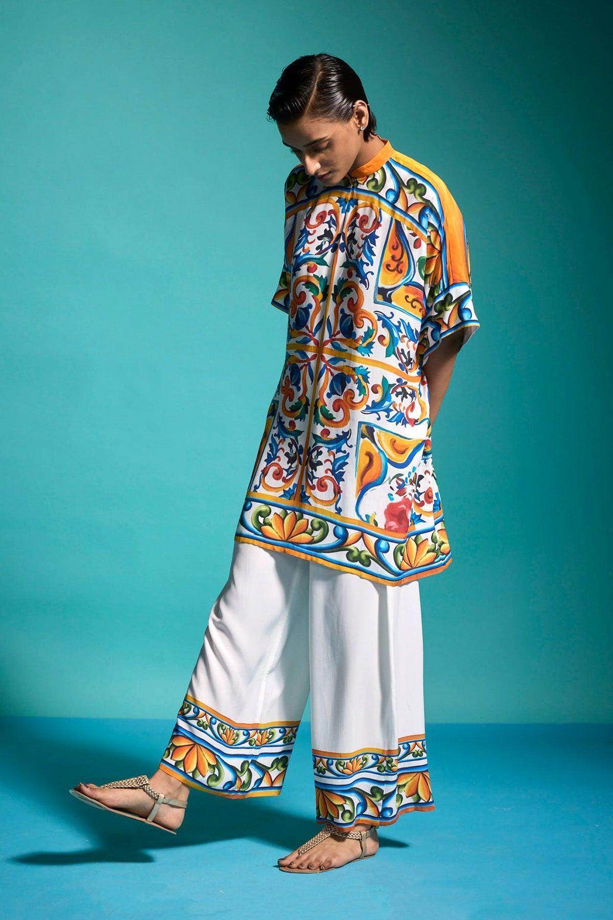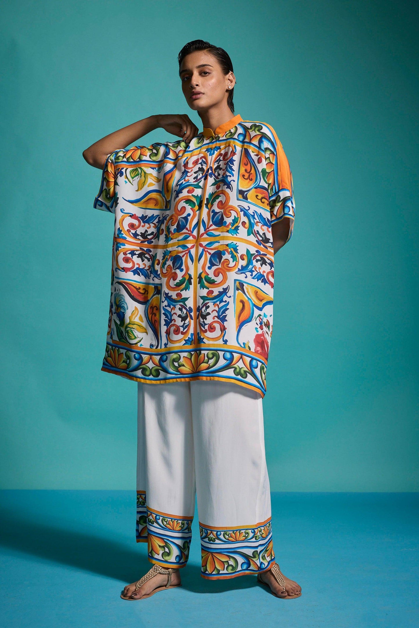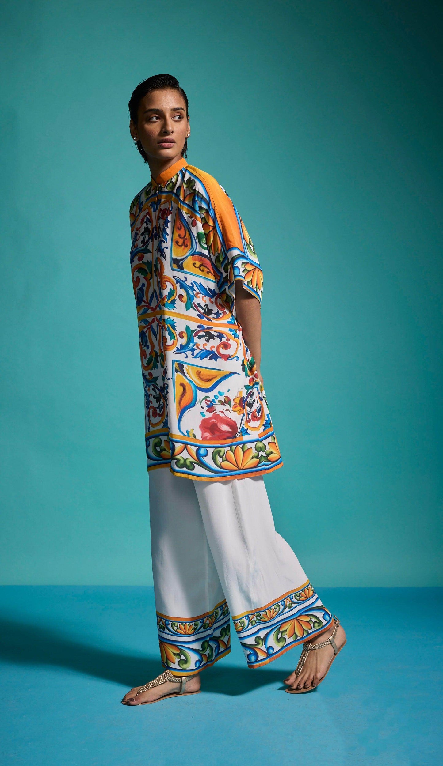 Boxy popover longline top with a multicolor hand-painted print. Features a band collar with a front keyhole, button and loop closure. Drop shoulder with a wide cuff. Relaxed fit. Paired with White wide-legged pants with a multicolor hand-painted print at the hem. Elasticated waistband with drawstrings. Side pockets.