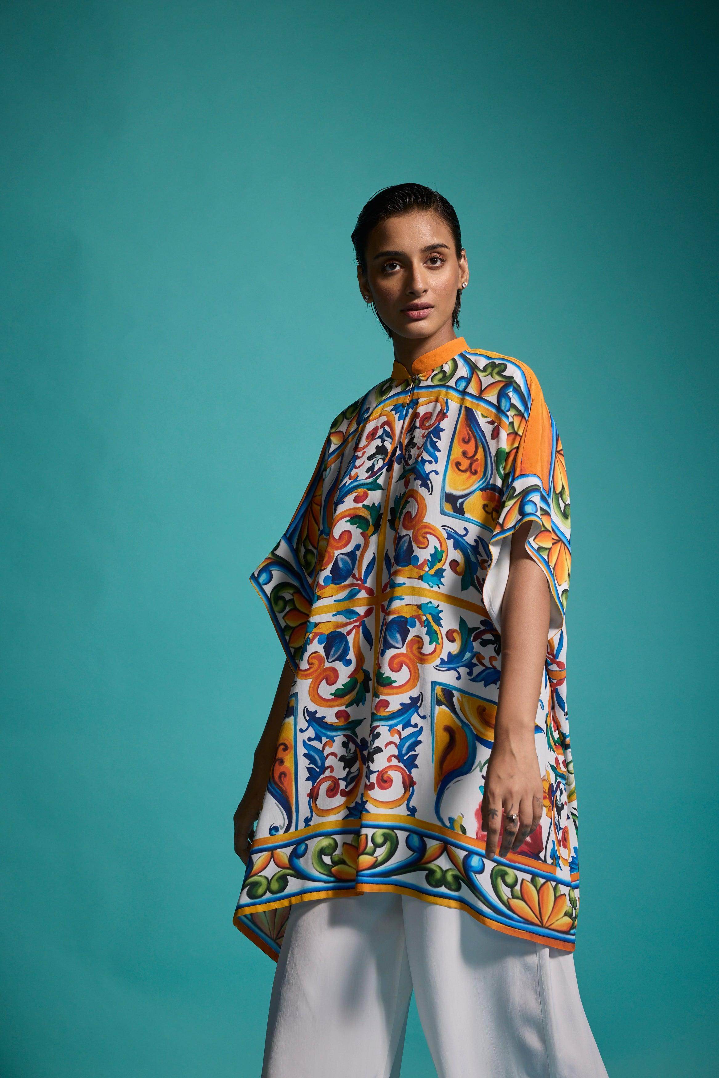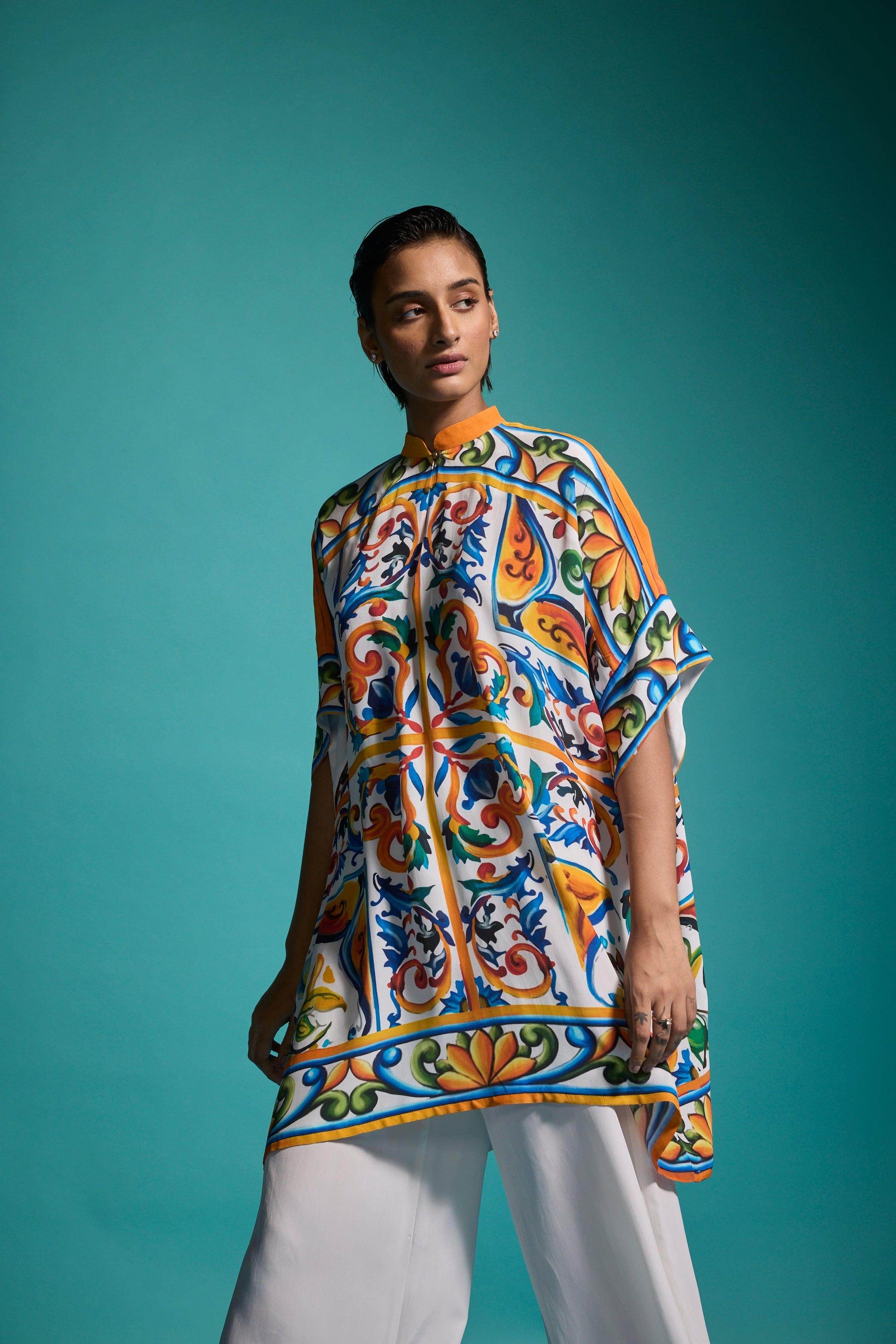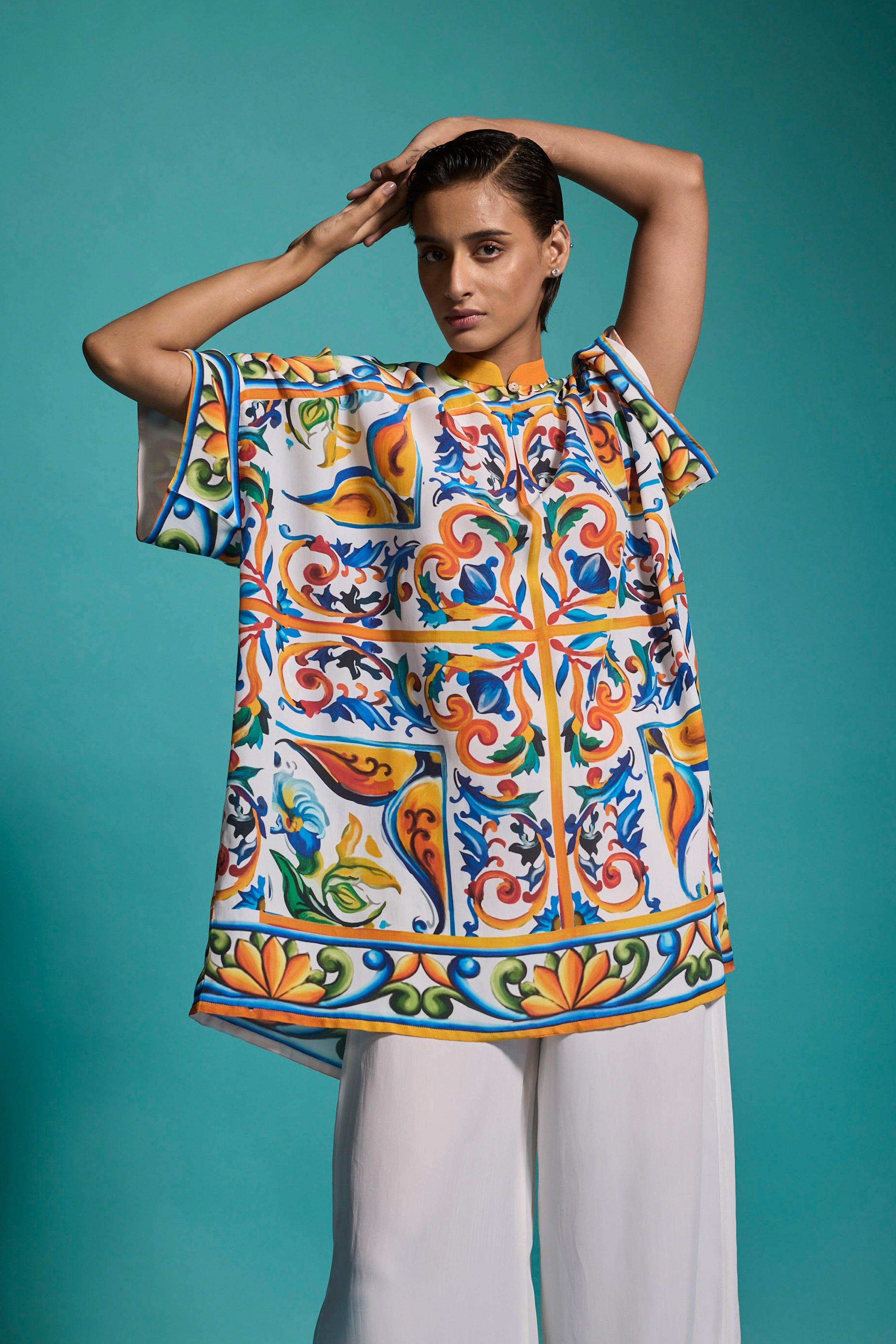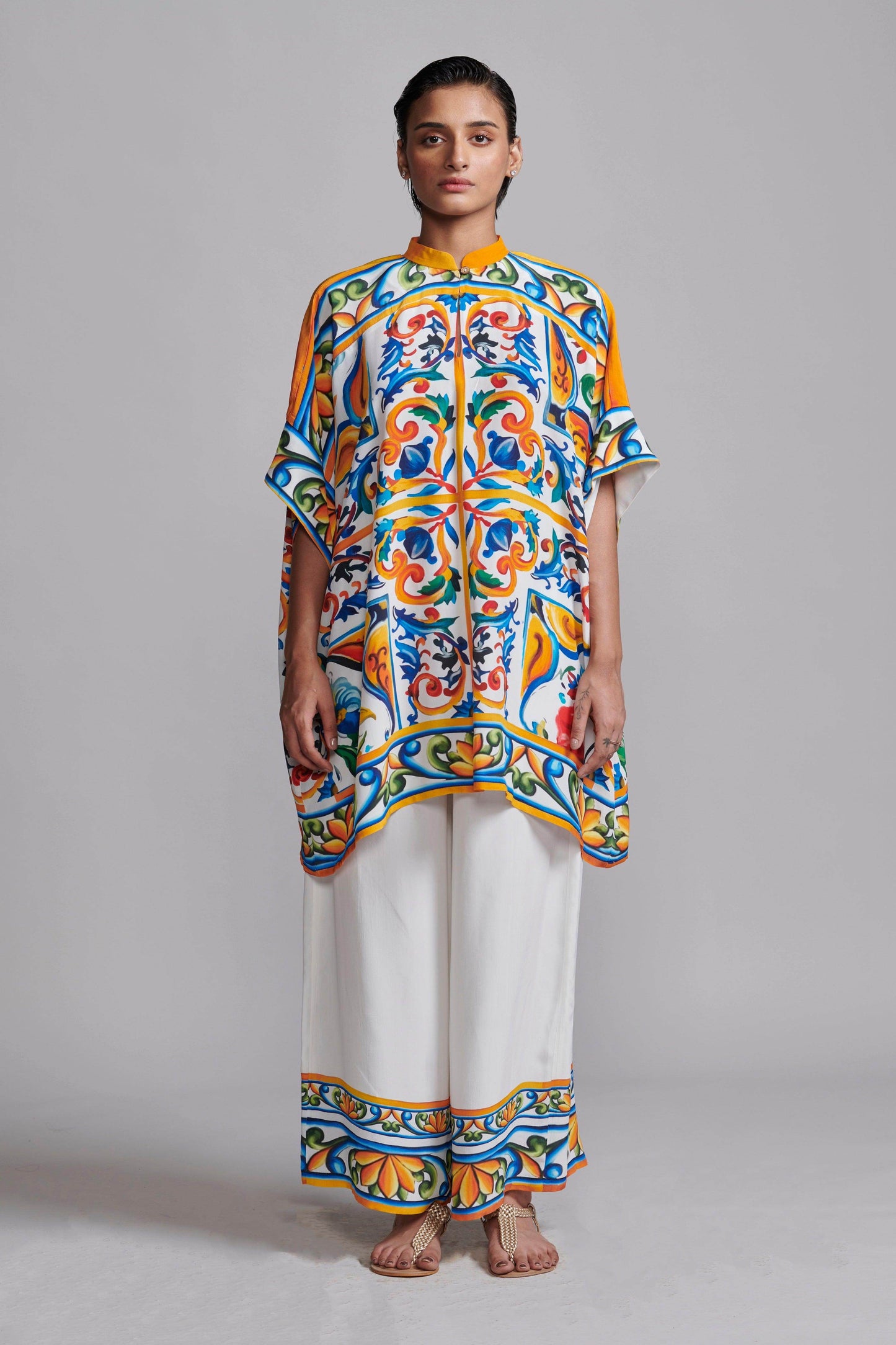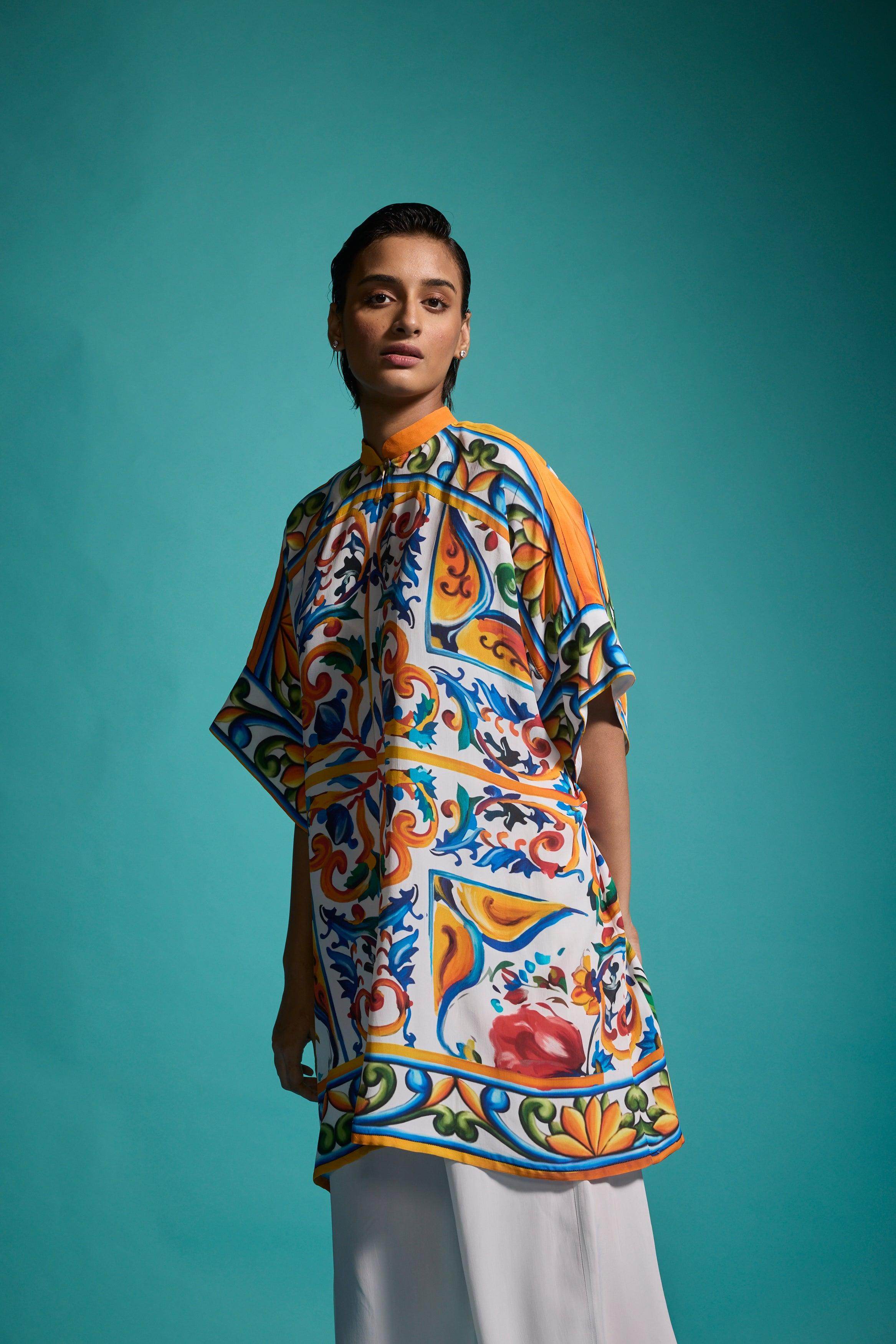 Boxy popover longline top with a multicolor hand-painted print. Features a band collar with a front keyhole, button and loop closure. Drop shoulder with a wide cuff. Relaxed fit. Paired with White wide-legged pants with a multicolor hand-painted print at the hem. Elasticated waistband with drawstrings. Side pockets.