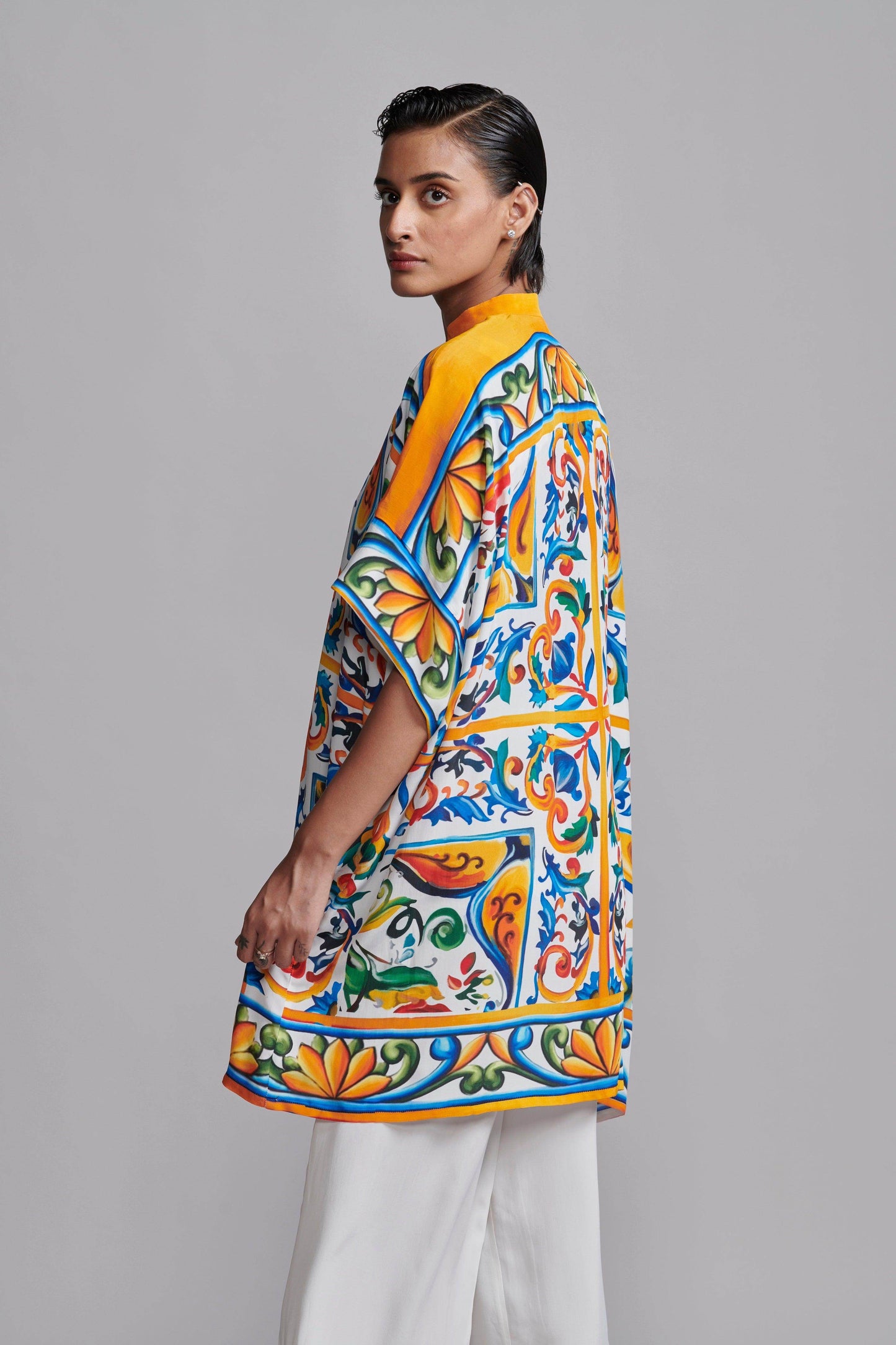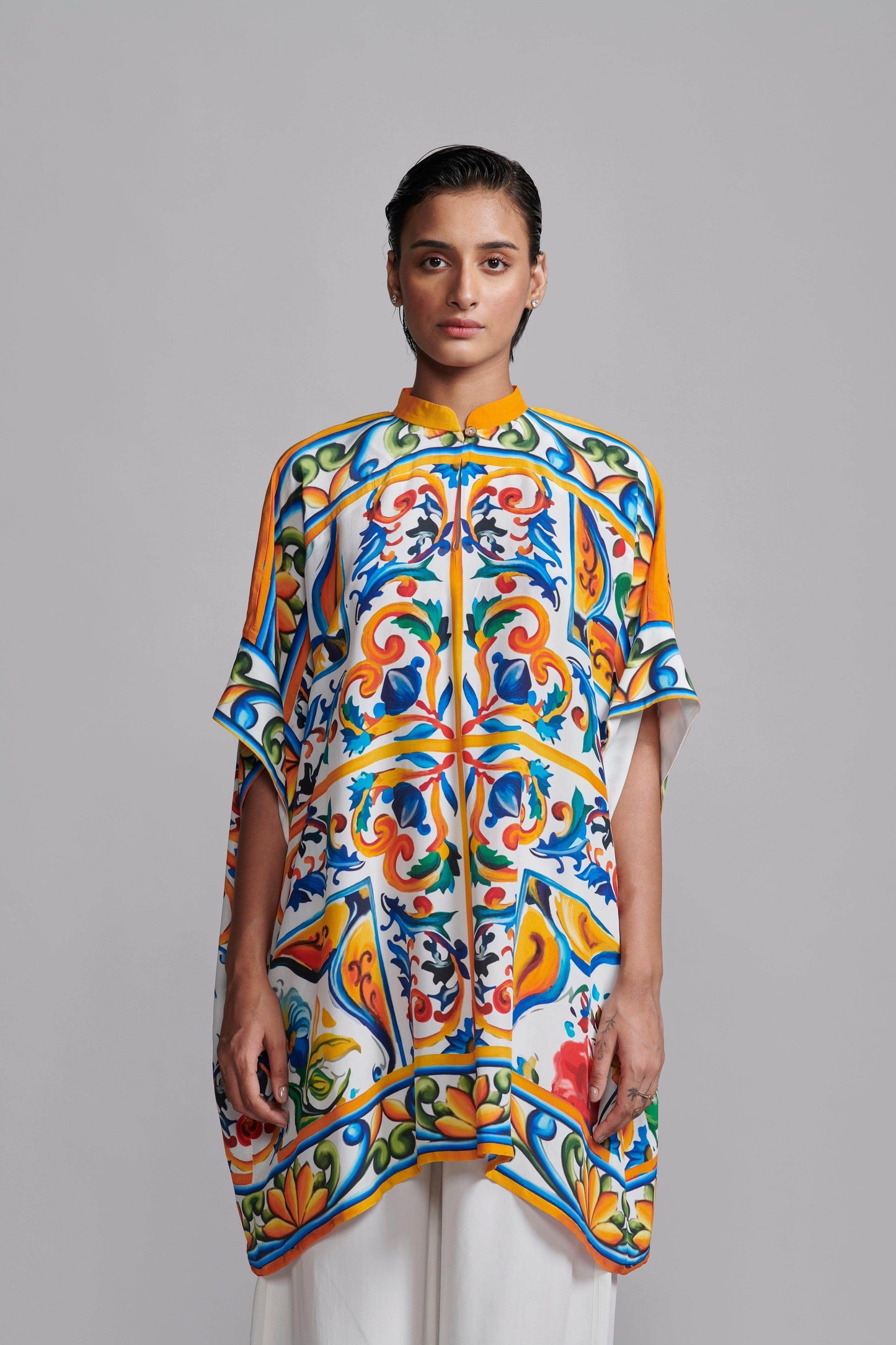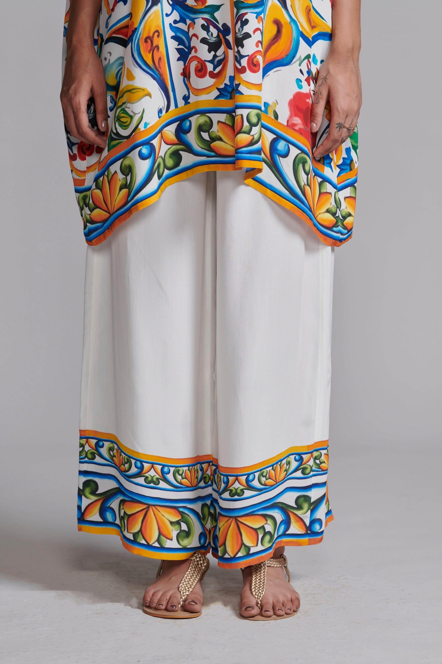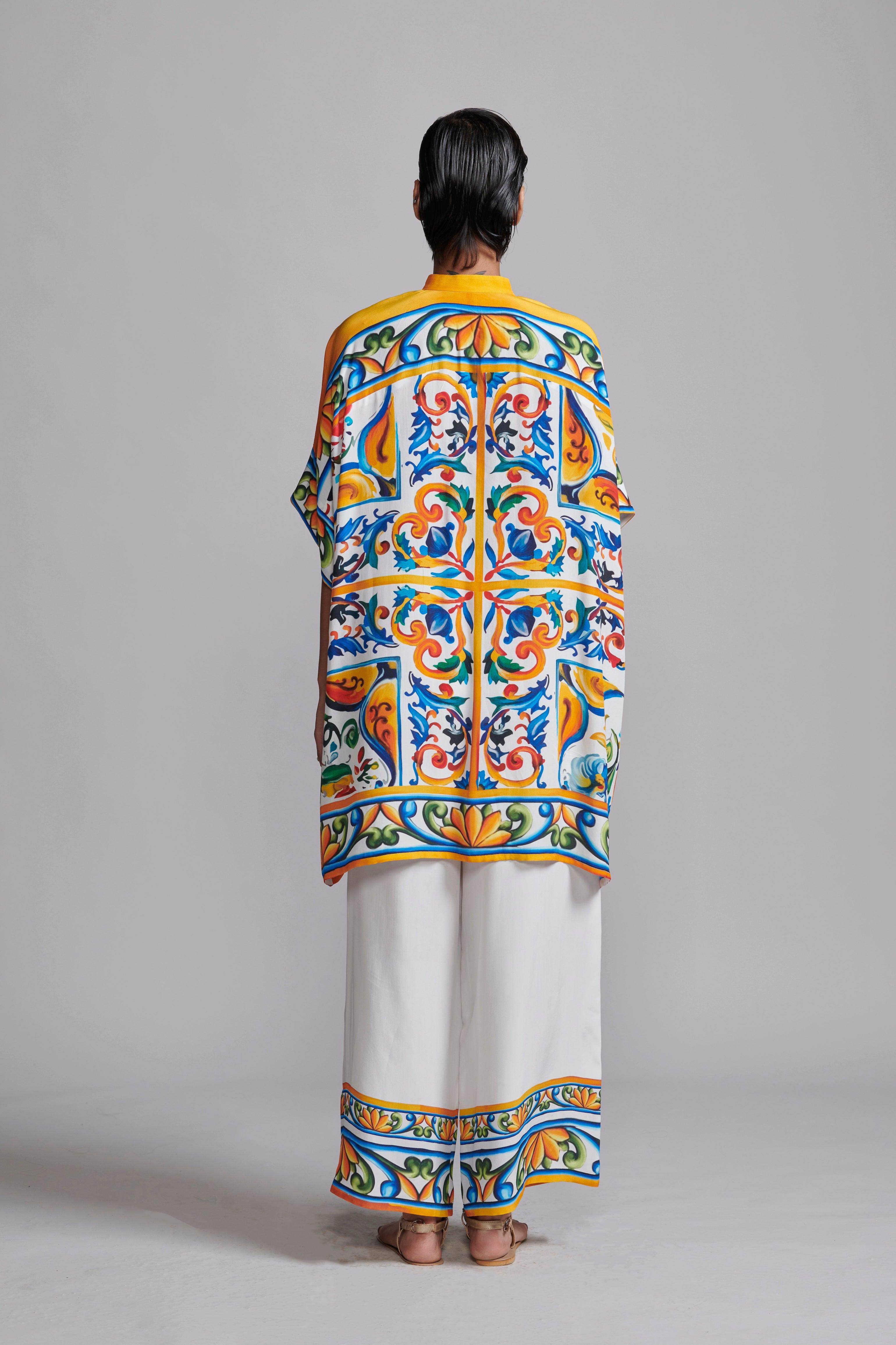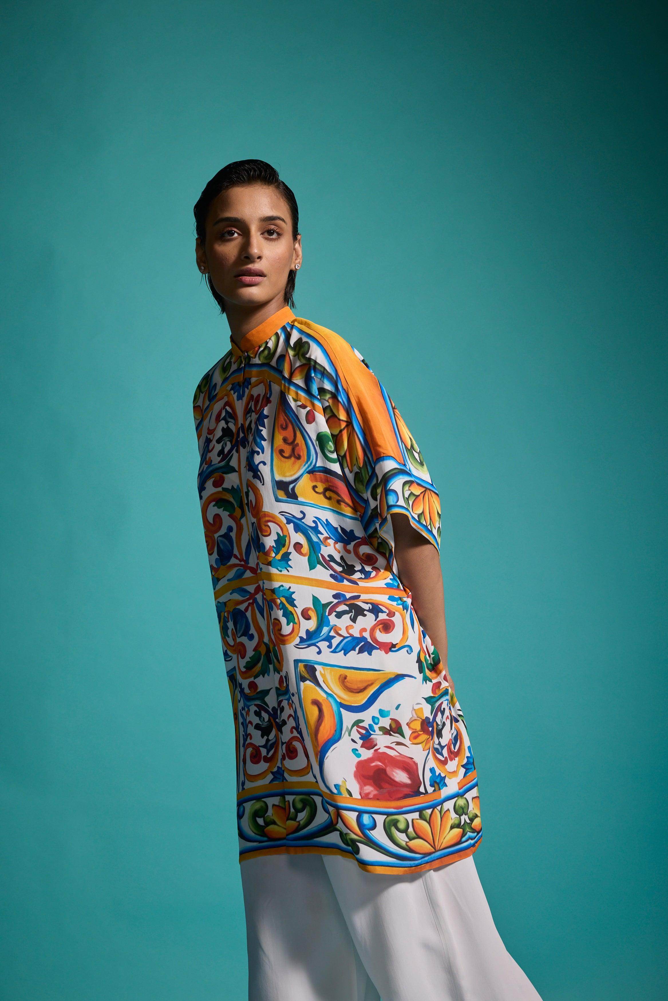 Boxy popover longline top with a multicolor hand-painted print. Features a band collar with a front keyhole, button and loop closure. Drop shoulder with a wide cuff. Relaxed fit. Paired with White wide-legged pants with a multicolor hand-painted print at the hem. Elasticated waistband with drawstrings. Side pockets.