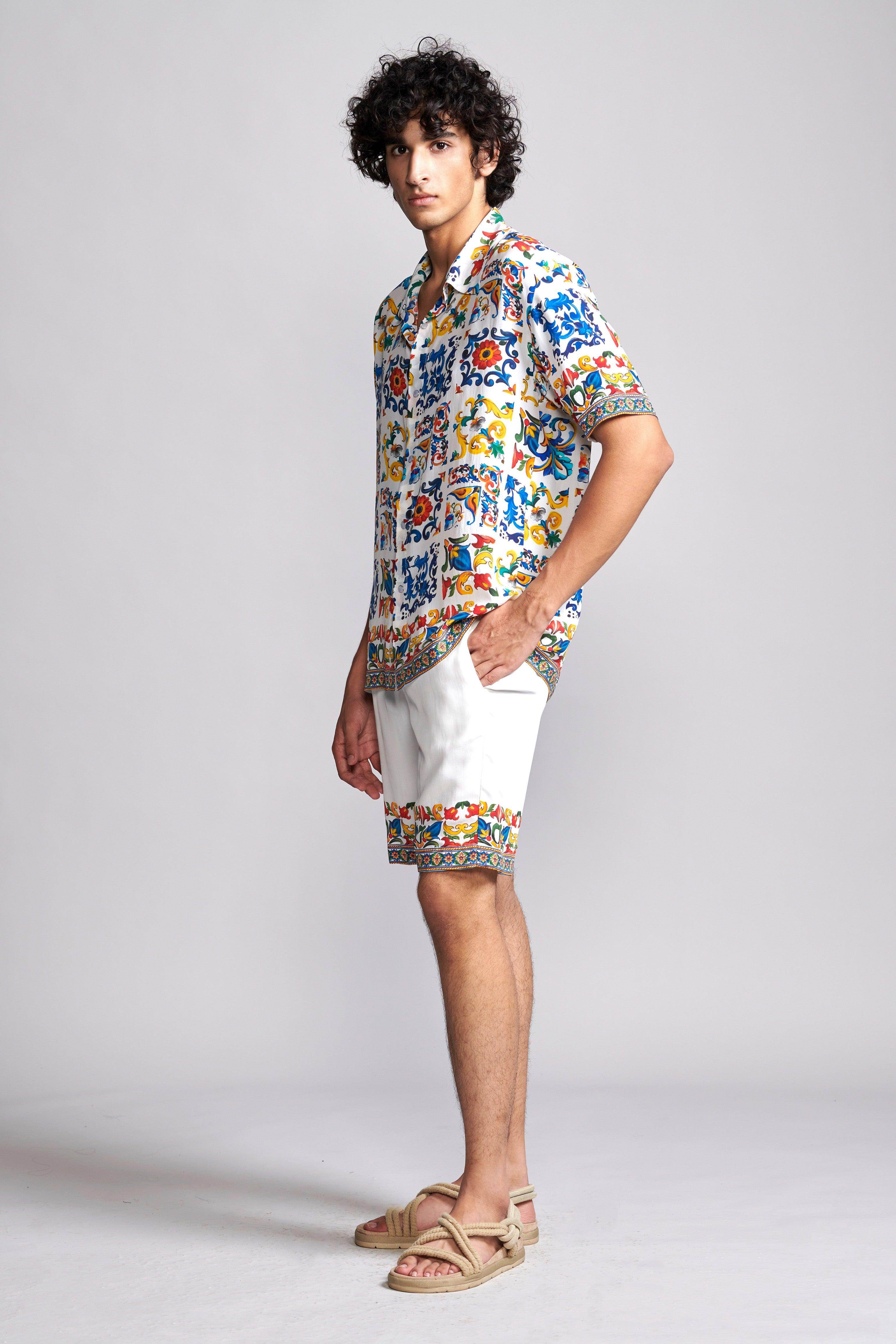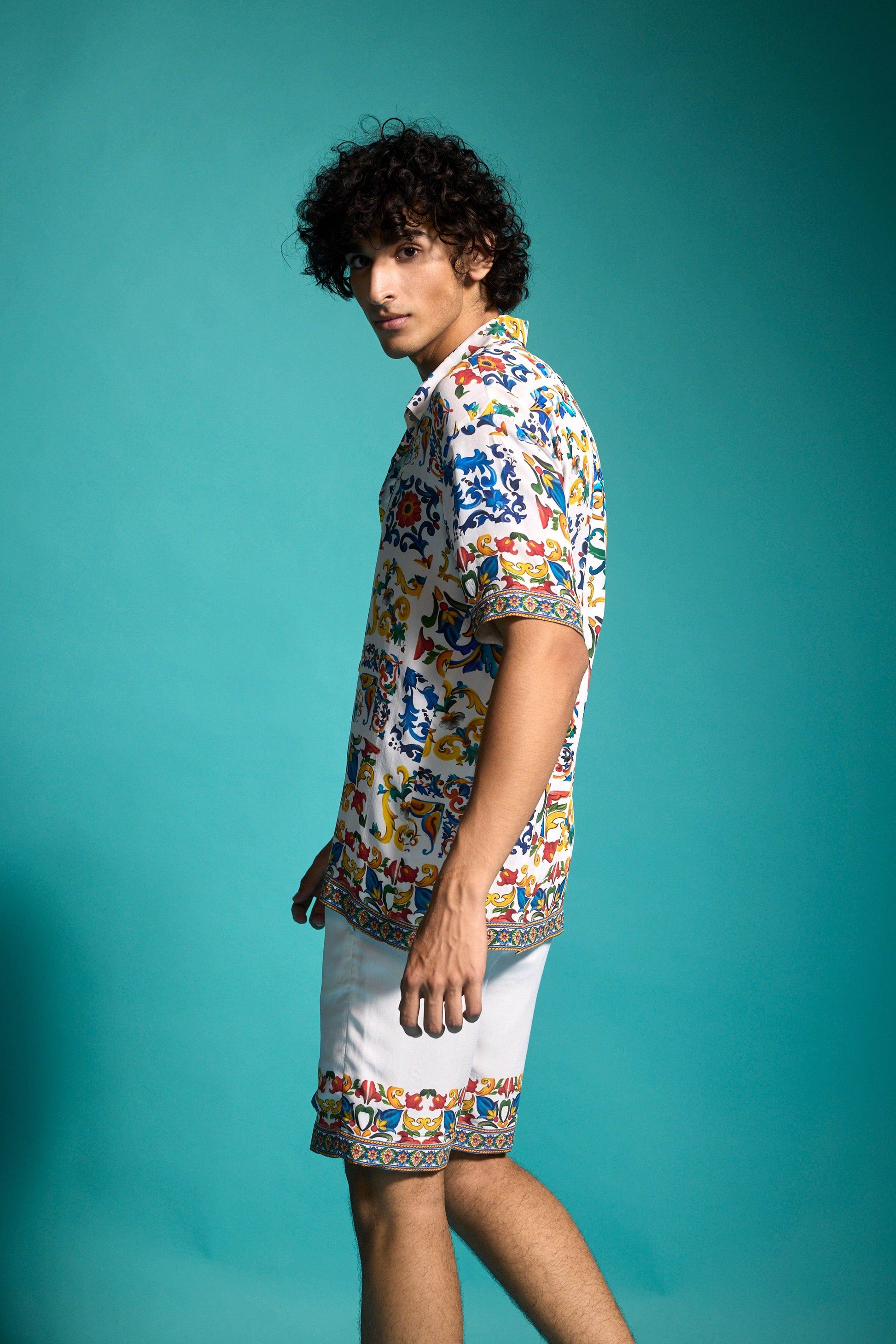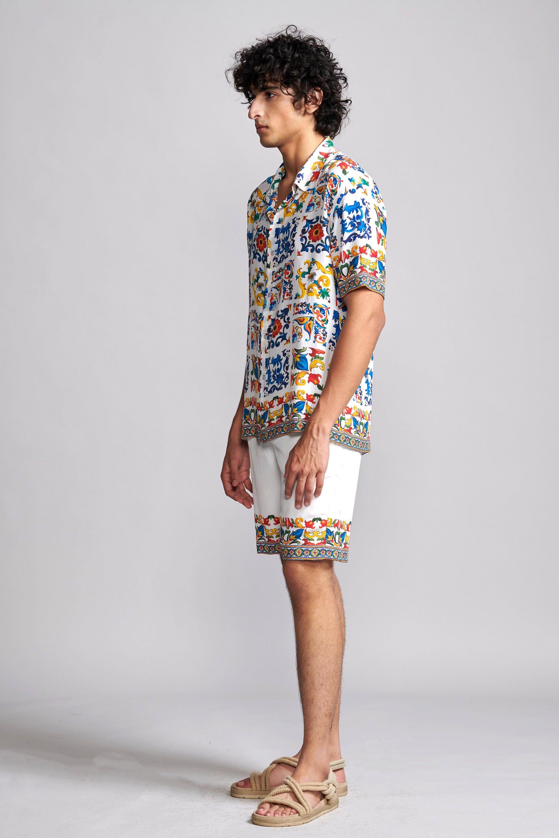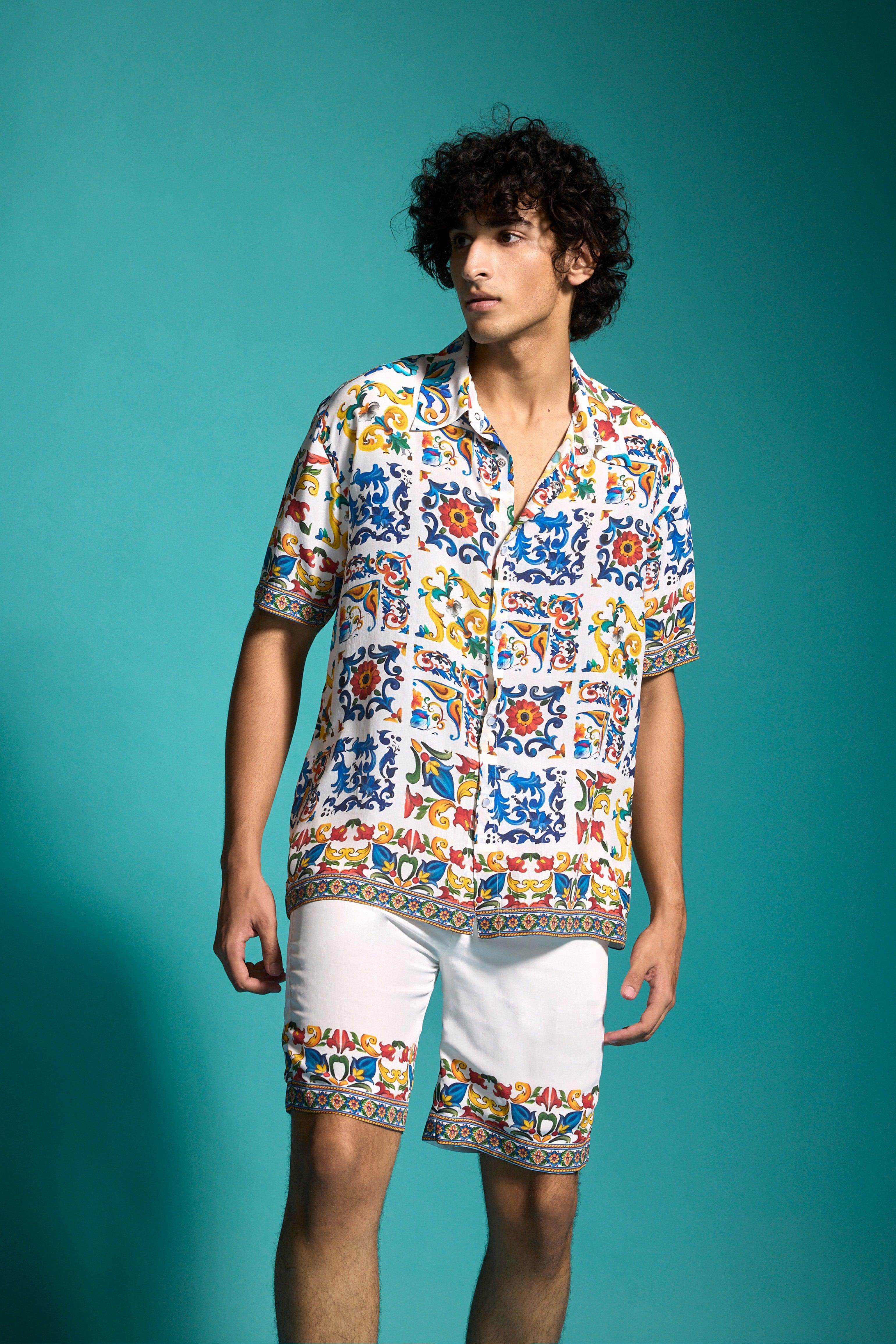 Boxy shirt in breathable viscose fabric with an allover print inspired by hand-painted Mediterranean tiles. Features snap buttons in the front, an inverted box pleat at the back, and half sleeves. Paired with Border-printed shorts inspired by hand-painted Mediterranean tiles. Elasticated waistband with hook-and-eye and zip closure. Side and back pockets. Fully lined.
