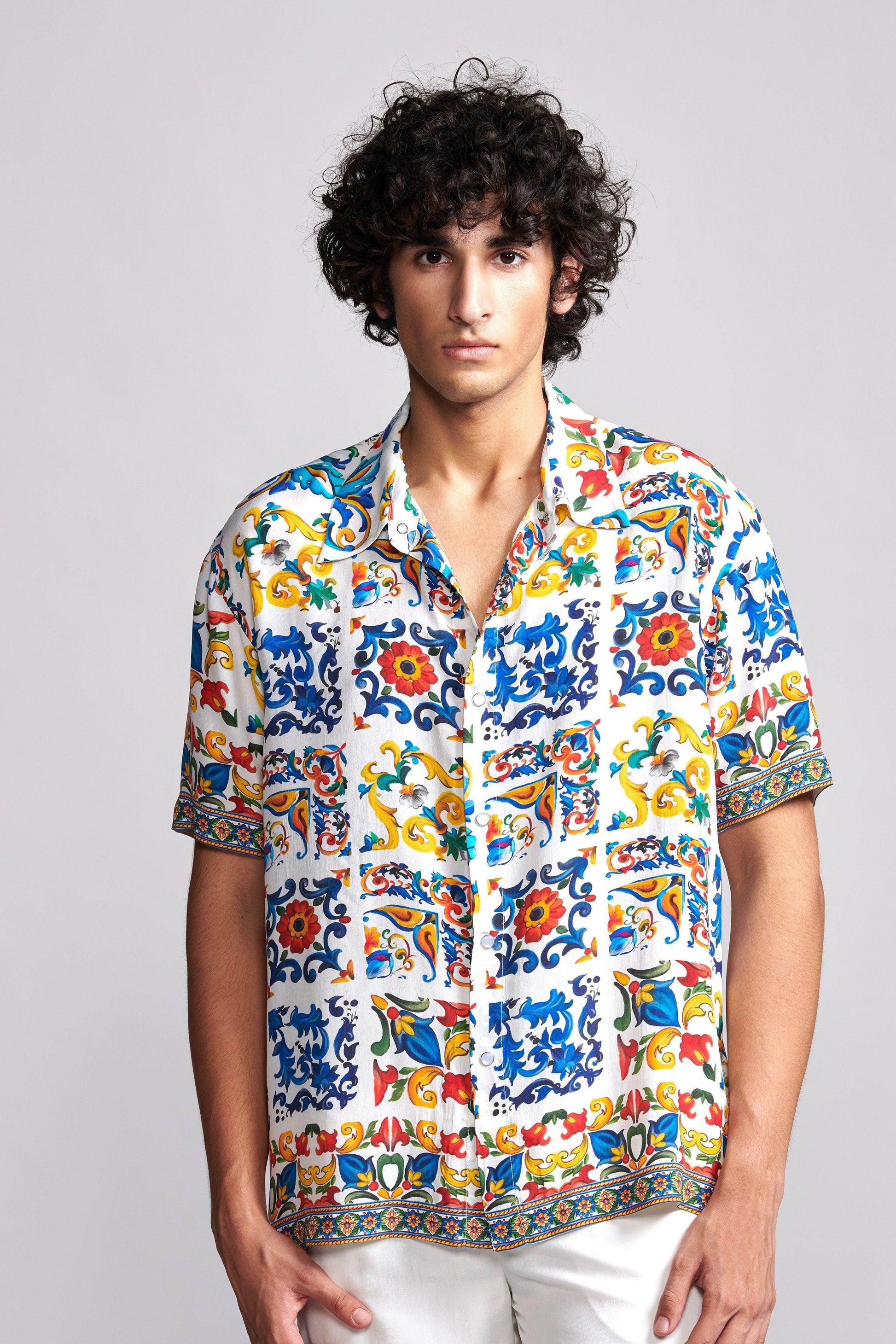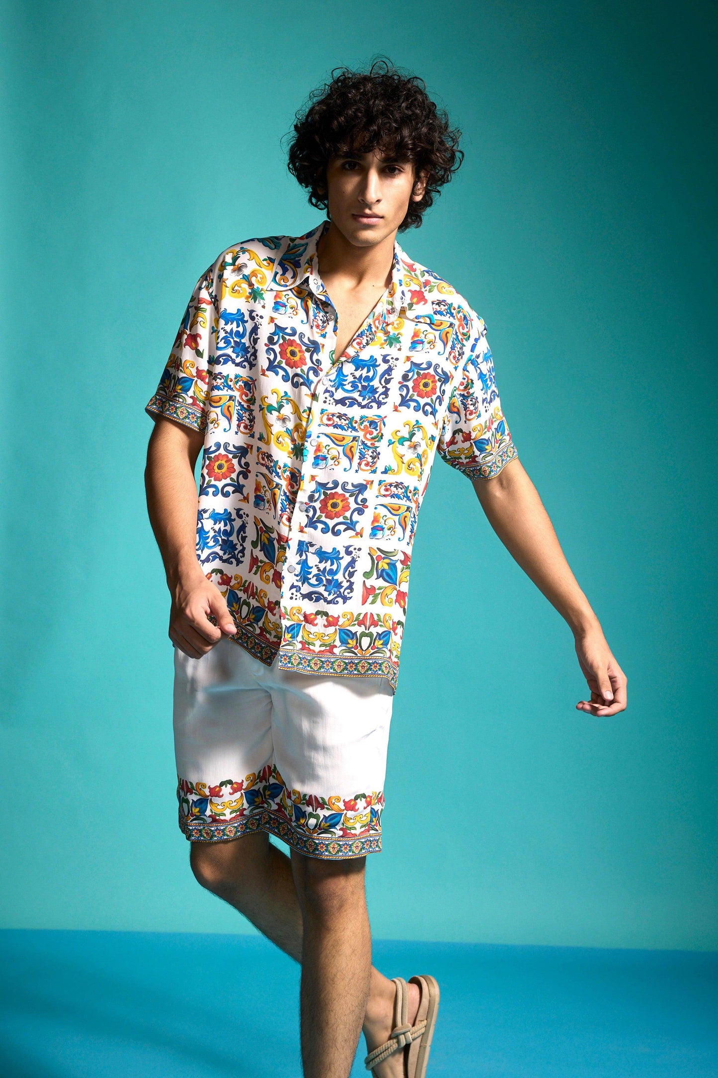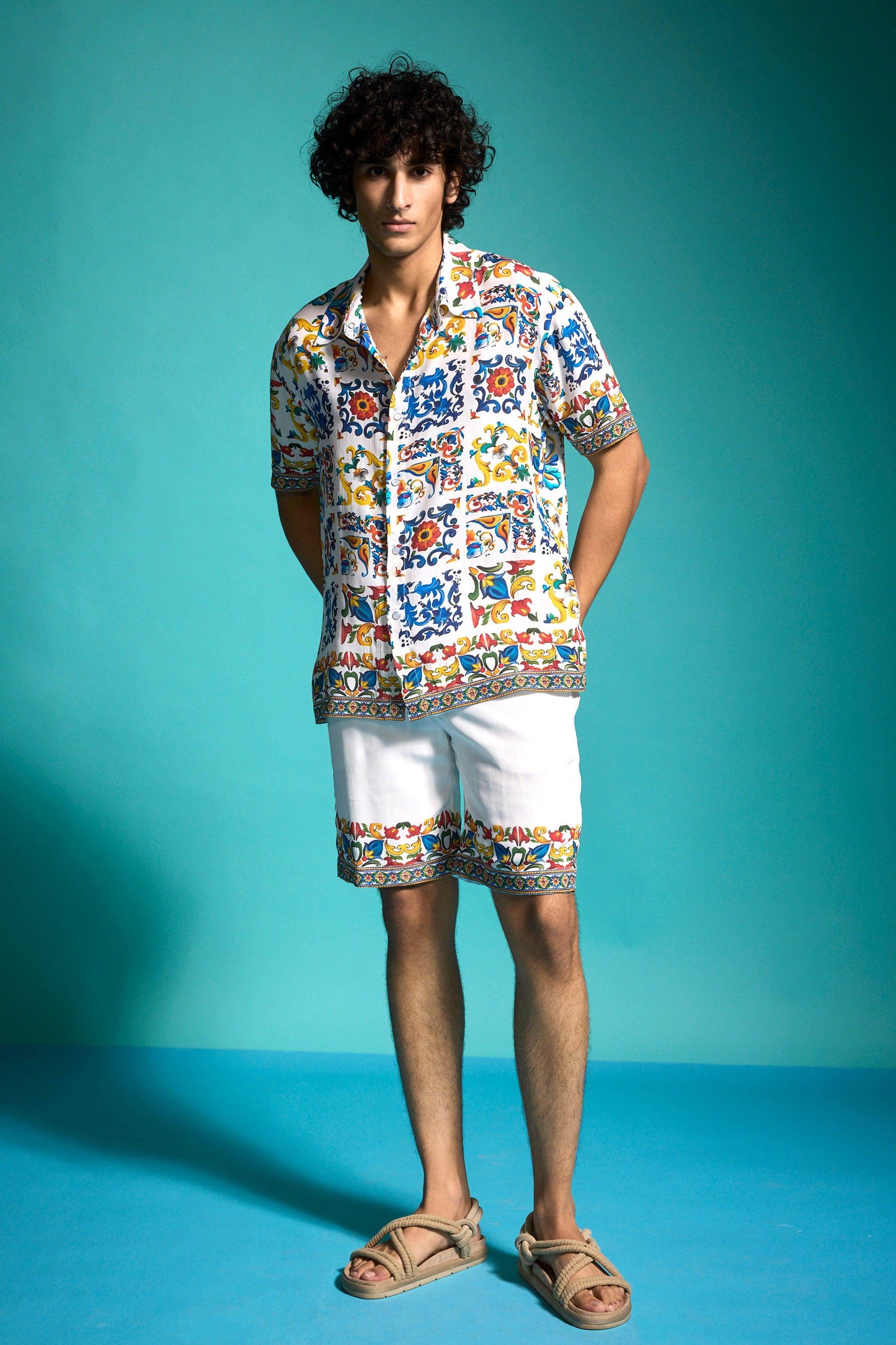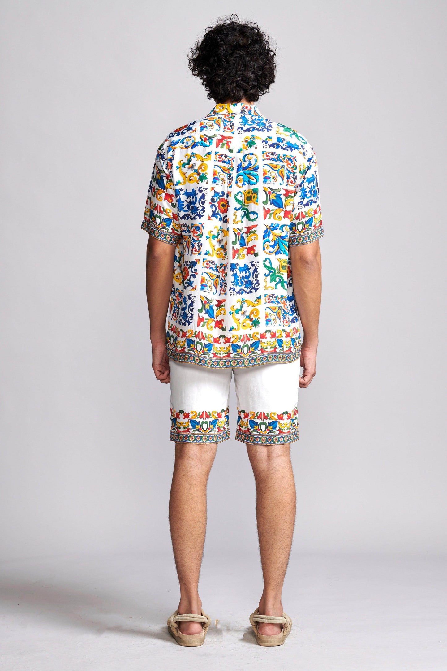 Boxy shirt in breathable viscose fabric with an allover print inspired by hand-painted Mediterranean tiles. Features snap buttons in the front, an inverted box pleat at the back, and half sleeves. Paired with Border-printed shorts inspired by hand-painted Mediterranean tiles. Elasticated waistband with hook-and-eye and zip closure. Side and back pockets. Fully lined.