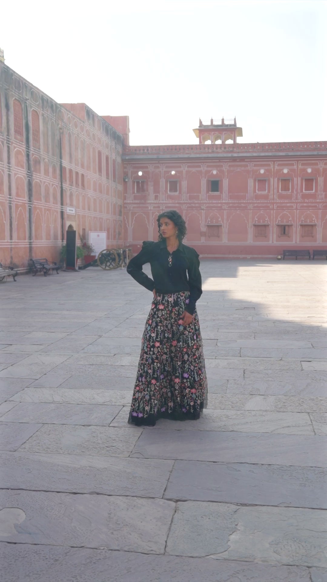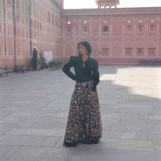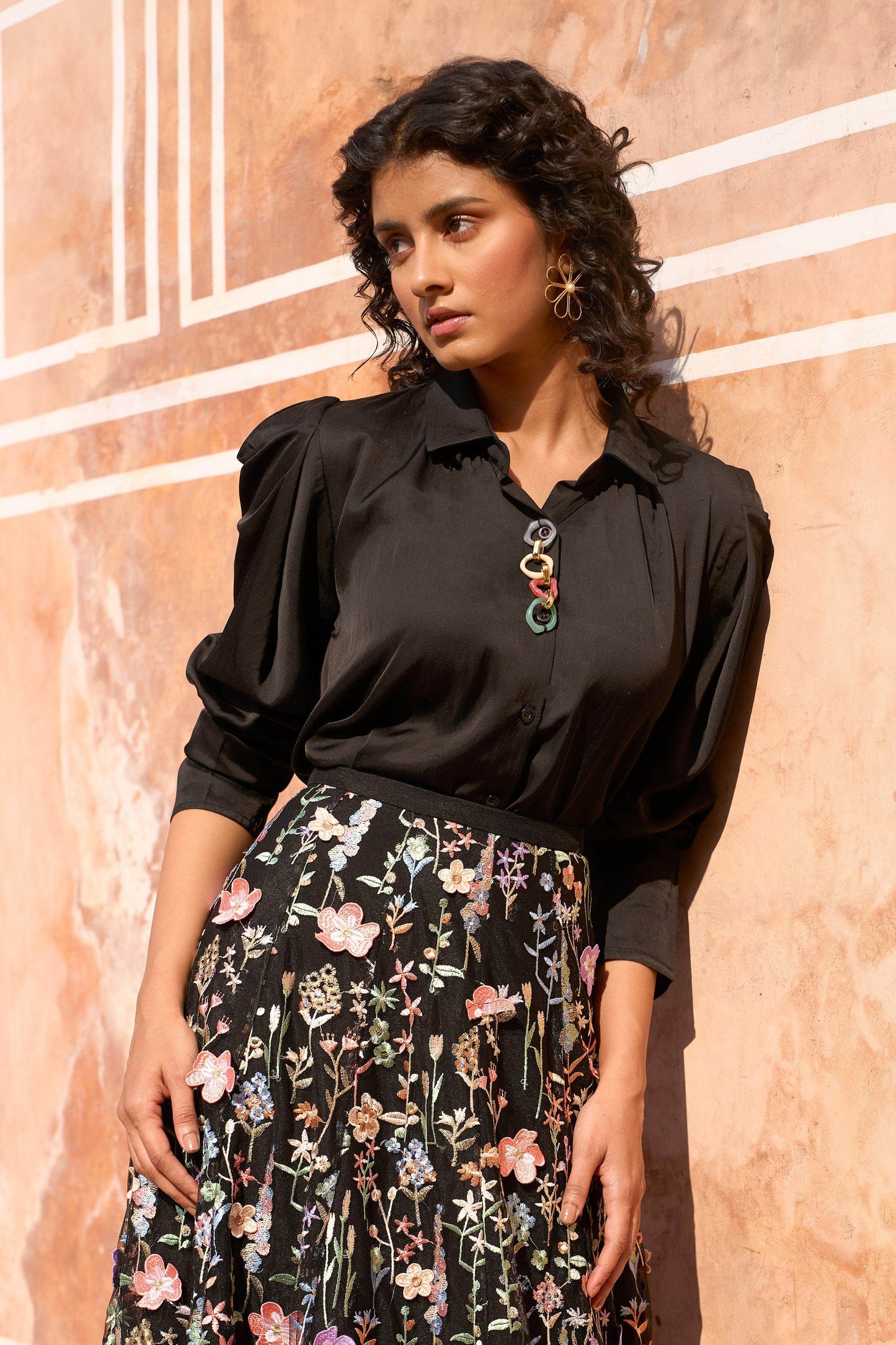 Soft drapey shirt with a multicolour linked chain detail on the front placket. Hand applied pleat on the sleeve adds a dramatic power shoulder. Button down front, shirt collar.